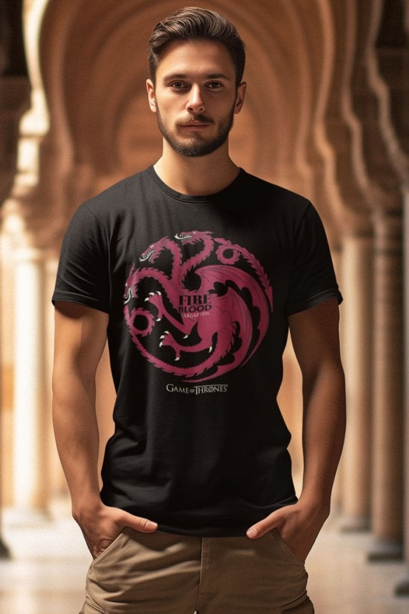 Drakar, eld och blod - det är vad som definierar Targaryen-dynastin, och det är precis vad som syns på denna T-shirt. Med den ikoniska trehövdade draken som slingrar sig majestätiskt över plagget, är det svårt att inte känna sig som en riktig drakryttare när man bär den.