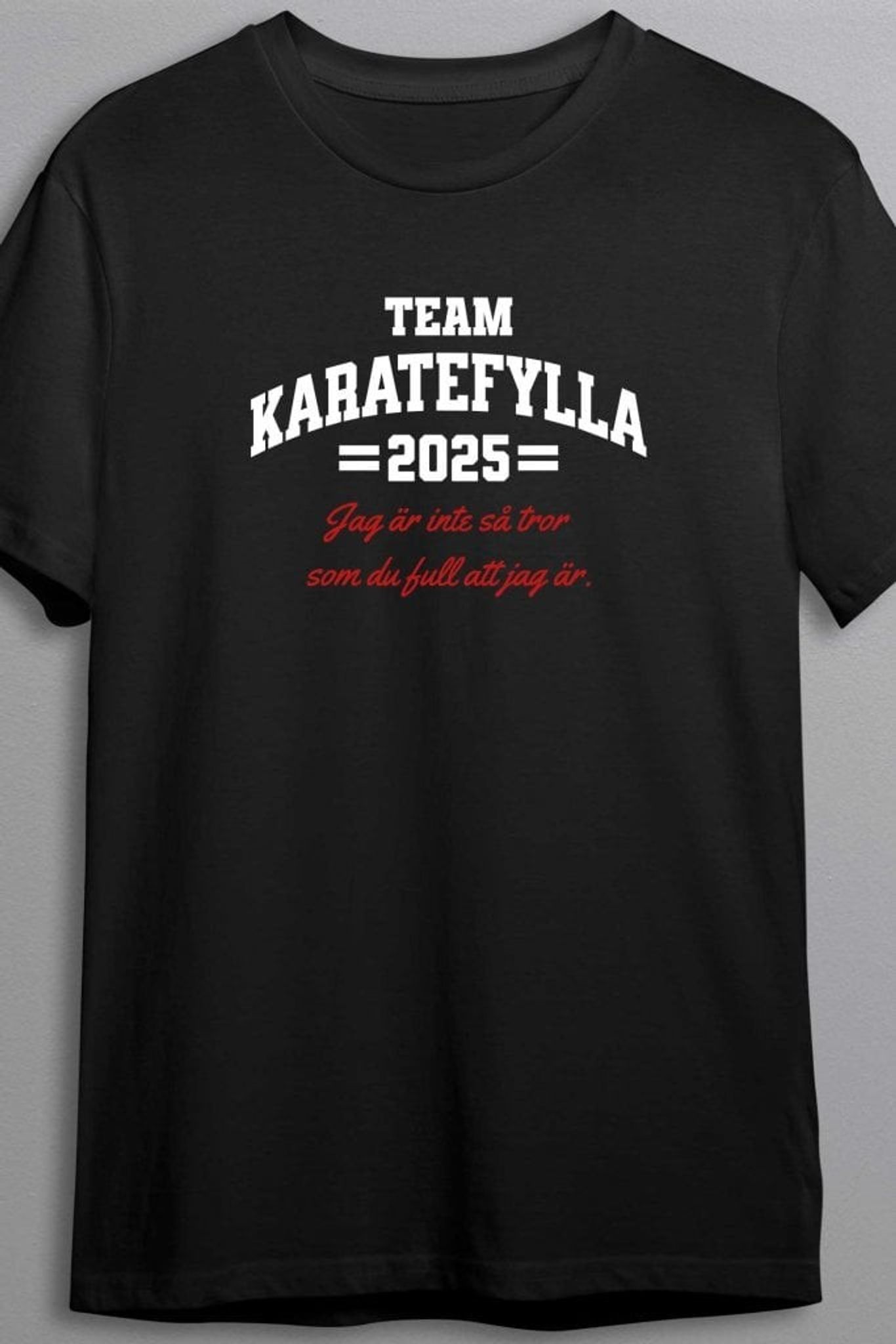 Är du redo att ta ditt festande till en helt ny nivå? Välkommen till Team Karatefylla 2025 – där stegen blir osäkrare, skratten högre och minnena… ja, lite suddigare. Med det ikoniska citatet "Jag är inte så tror som du full att jag är" sätter den här T-shirten tonen för en kväll där grammatiken får lida lika mycket som din balans.