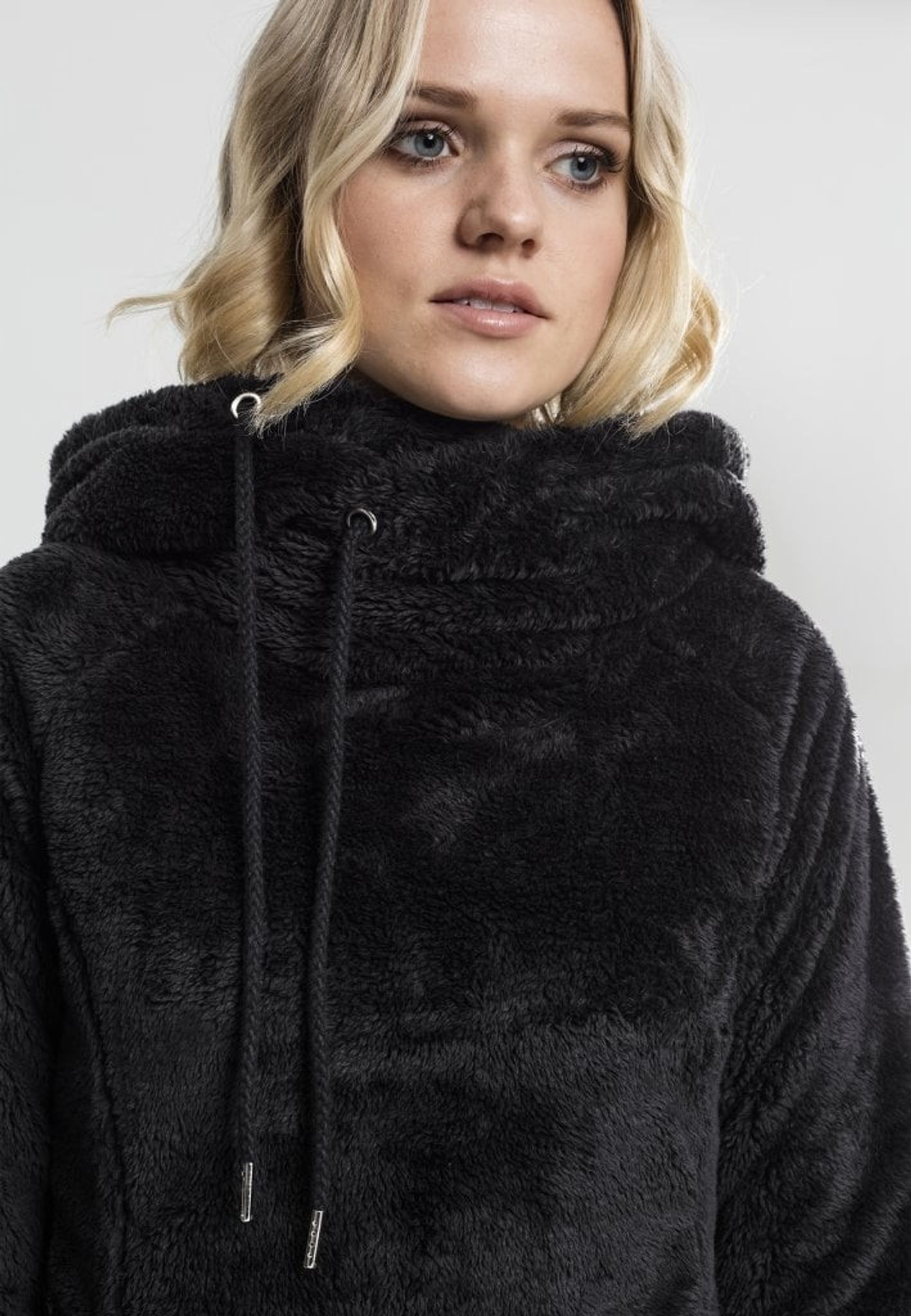 En mjuk längre modell av teddy hoodie. Smal passform.