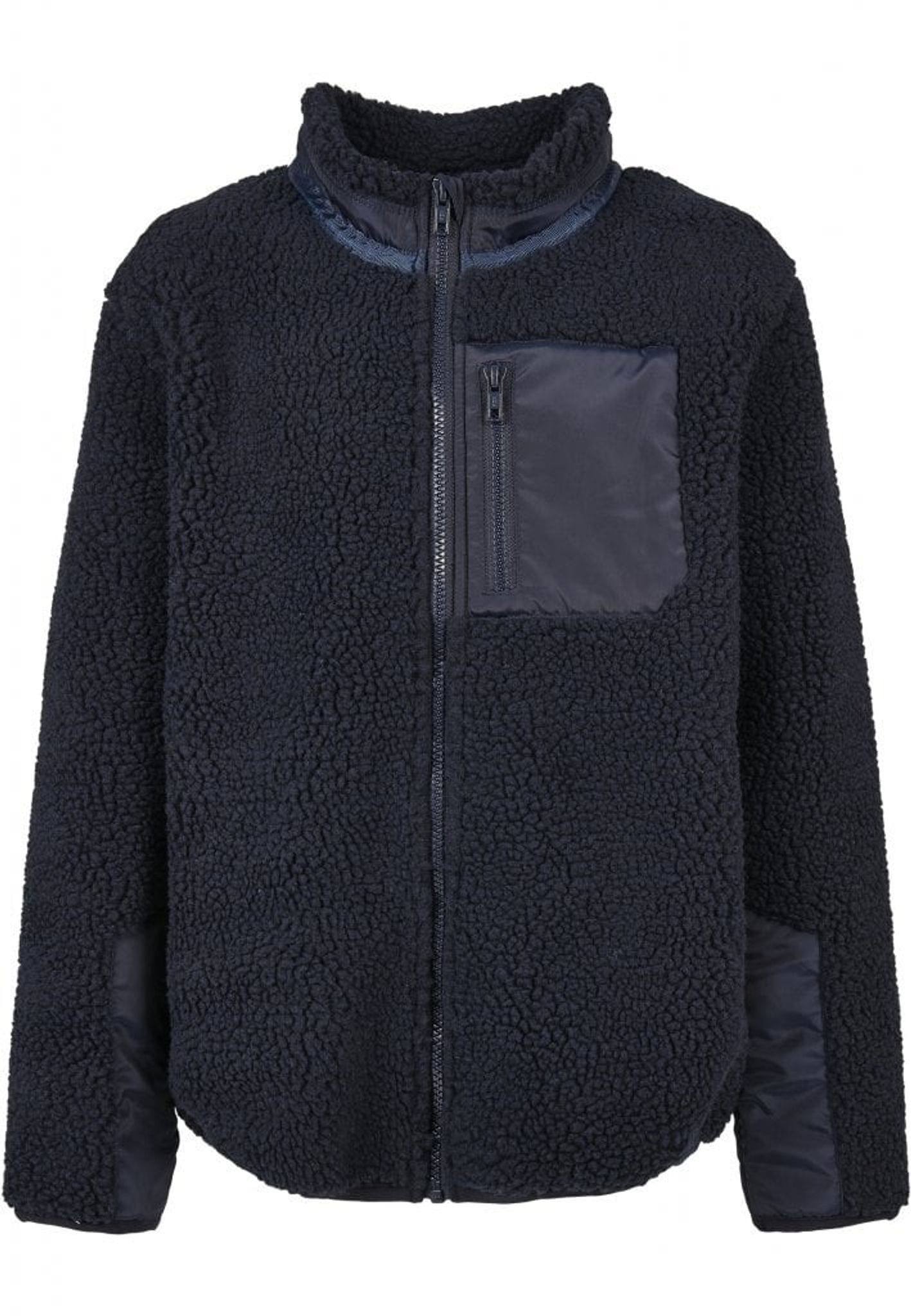 En mörkblå jacka i teddyfleece. Jackan har en panel i blankt polyestertyg på vänster bröst, i ärmsluten och i kragen. Detta ger snygga kontraster på plagget.