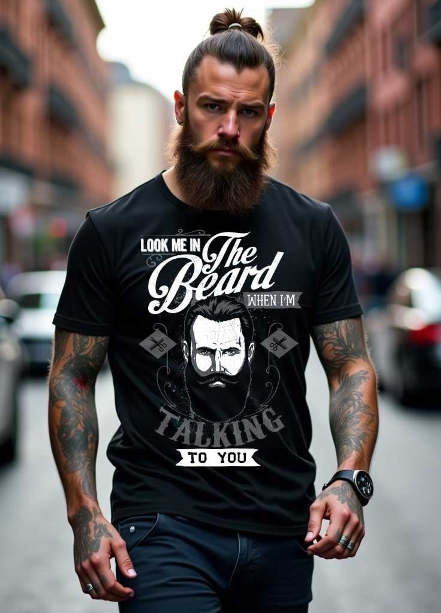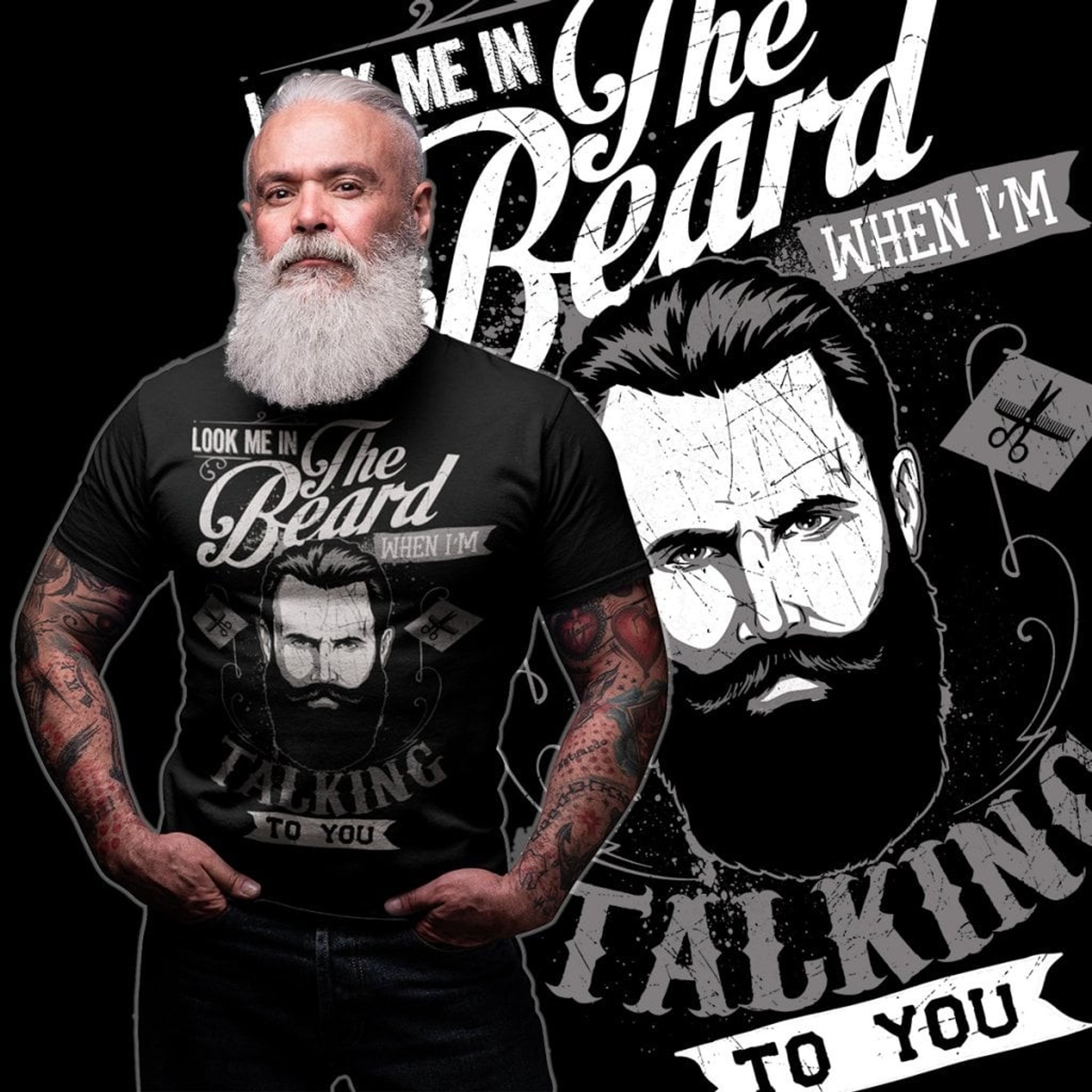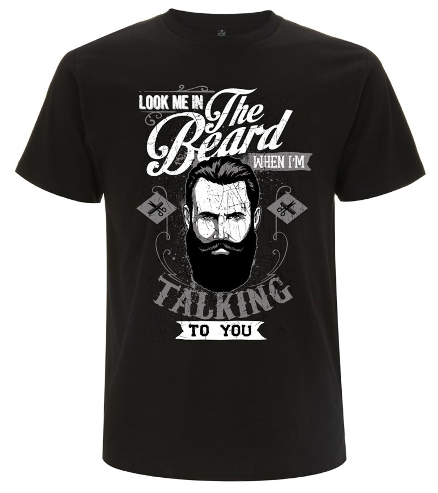 The Beard svart t-shirt, perfekt för dig som bär skägg med stolthet. Med det självsäkra budskapet "Look me in the Beard when I'm talking to you" och en imponerande skäggig figur på bröstet, är denna t-shirt en klockren symbol för attityd och stil. Trycket är både iögonfallande och humoristiskt, vilket gör denna t-shirt till ett måste för alla skäggentusiaster.