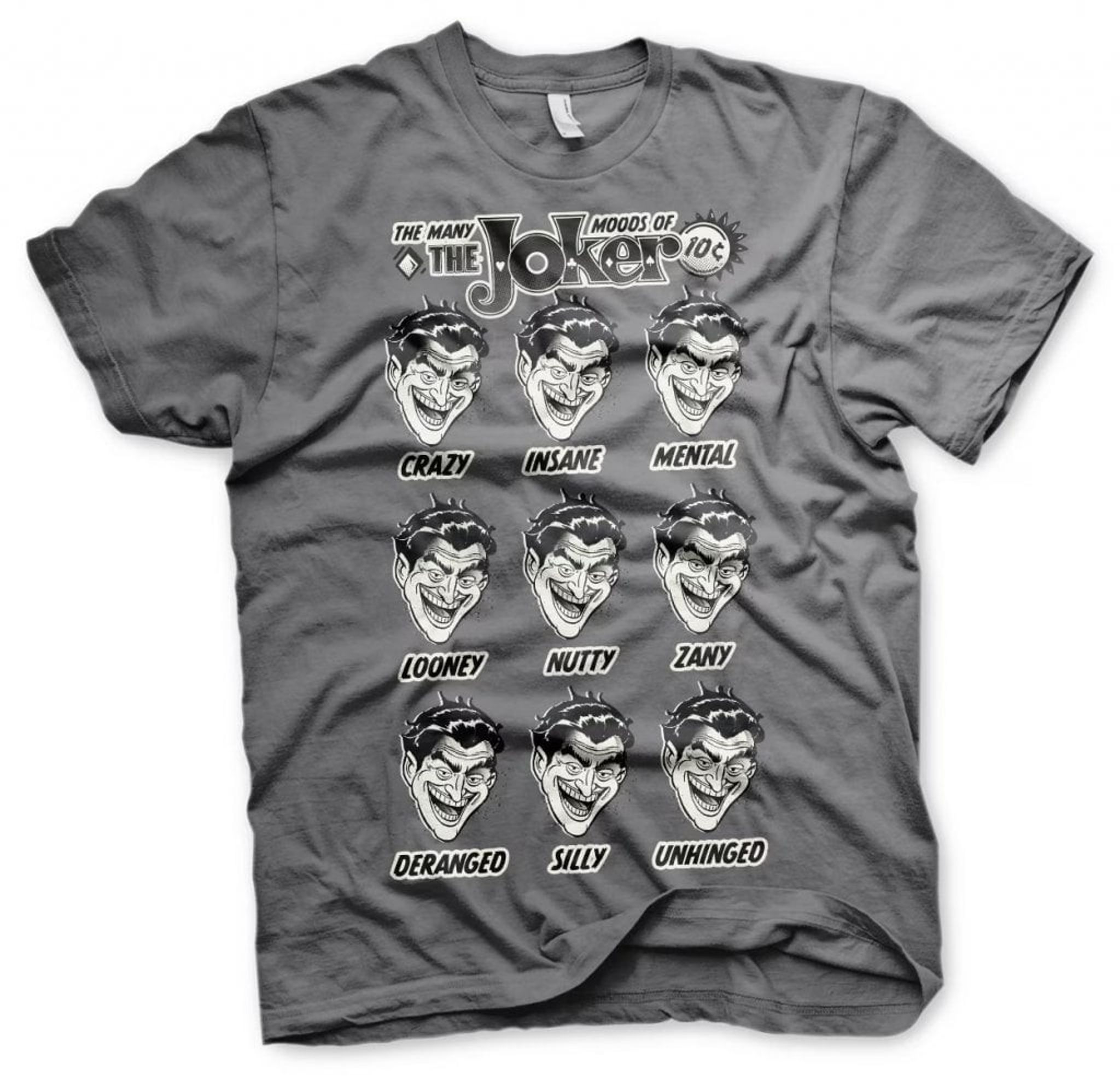 The Many Moods Of The Joker T-Shirt ger oss en fascinerande inblick i den varierande sinnesstämningen hos den ombytliga karaktären. Med en uppsättning av identiska porträtt följer en serie adjektiv som "Crazy", "Insane", "Mental", "Looney", "Nutty", "Zany", "Deranged", "Silly", "Unhinged". Det är som ett lexikon av galenskap, presenterat med ett leende som är både lockande och lite obehagligt. Även om alla ansiktsuttrycken är desamma, kan man nästan höra de olika tonfallen han skulle använda för varje ord - från busig och spelad dumhet till fullständigt kaotiskt skratt.