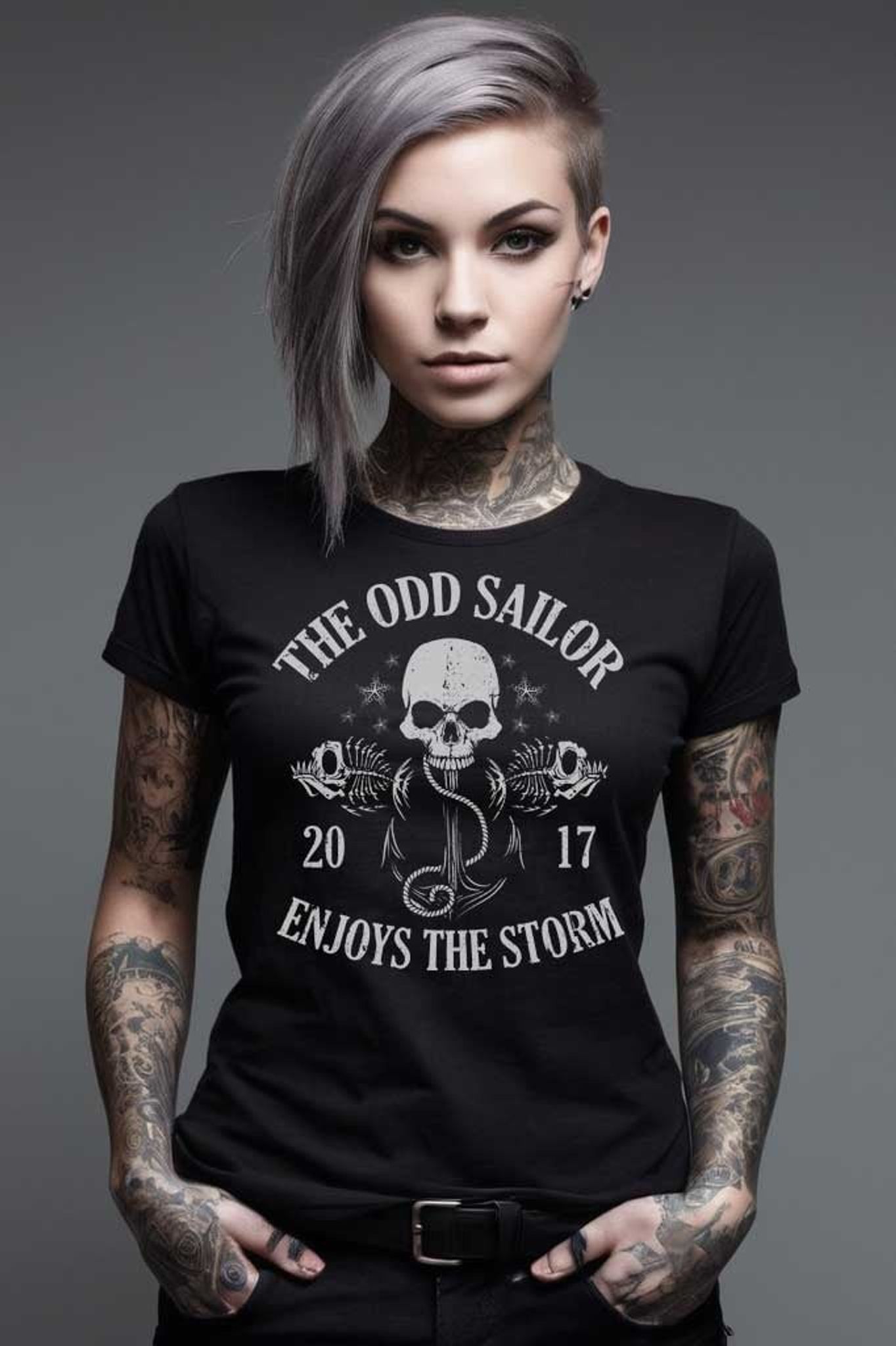 Visa din attityd med The Odd Sailor Girly Tee, en t-shirt för dig som älskar unika och djärva tryck. Den stilrena svarta basen kompletteras av ett detaljerat maritimt tryck med en dödskalle, ormar och fiskben, vilket ger en rå men samtidigt elegant look. Perfekt för dig som uppskattar en edgy stil med influenser från sjöfart och punkkultur.