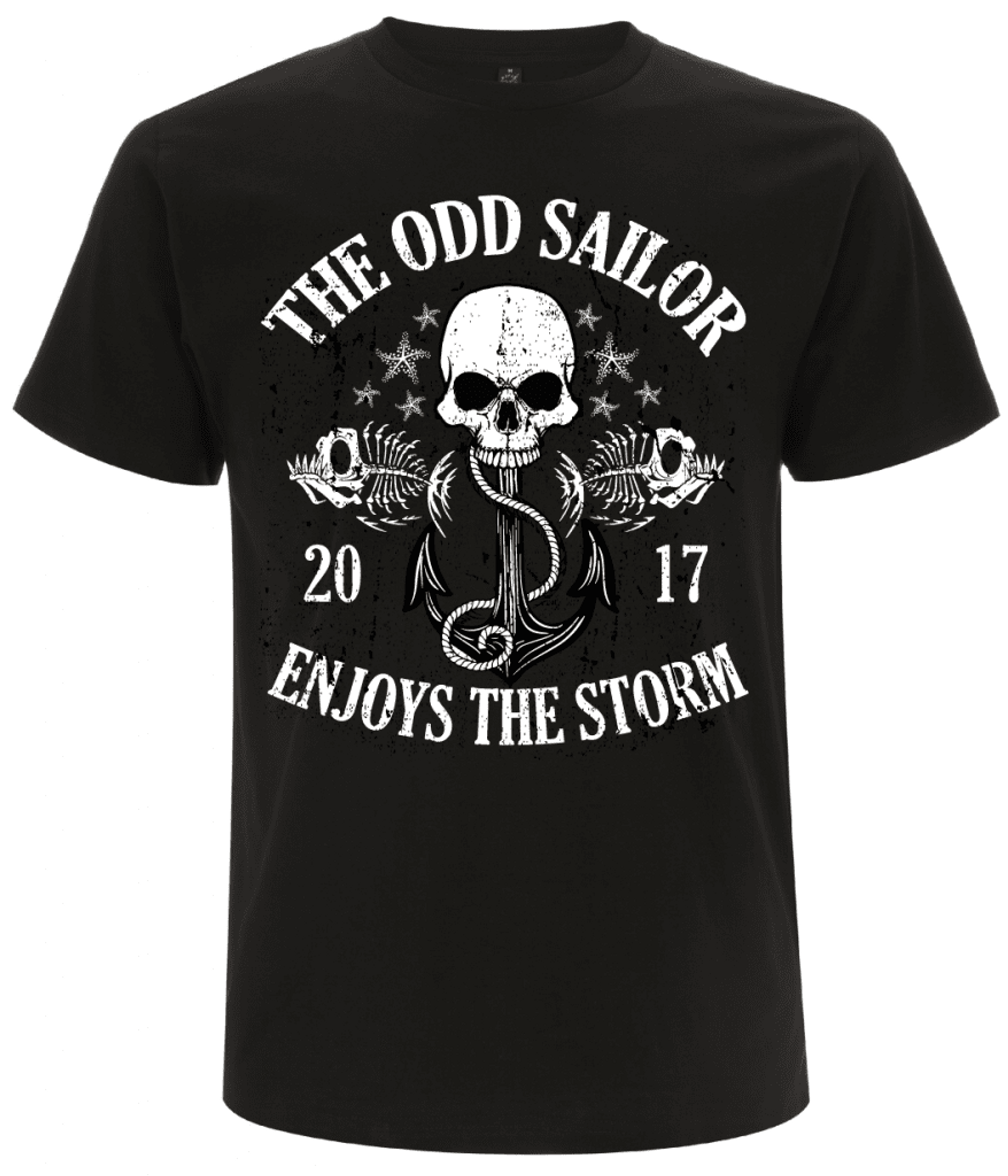 The Odd Sailor T-shirt från Dirty Hank är en tuff och stilsäker t-shirt som fångar essensen av den hårdnackade sjömansandan. Med ett djärvt tryck som visar en dödskalle tillsammans med ett ankare och två skelettfiskar, omgiven av texten "The Odd Sailor Enjoys the Storm", är denna t-shirt perfekt för den som inte ryggar tillbaka för livets stormar. Trycket förmedlar en känsla av styrka och uthållighet, något som varje äkta sjöman och äventyrslysten person kan relatera till.