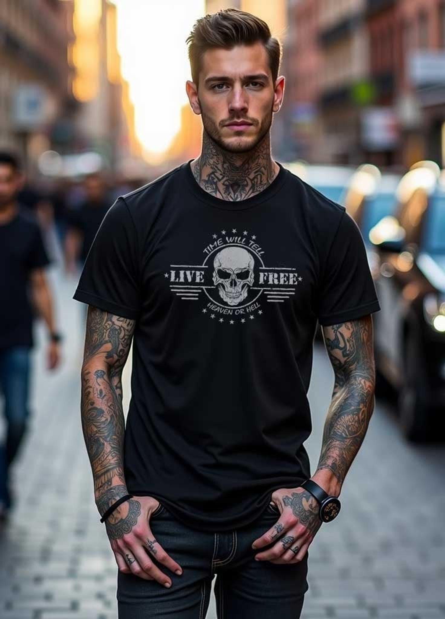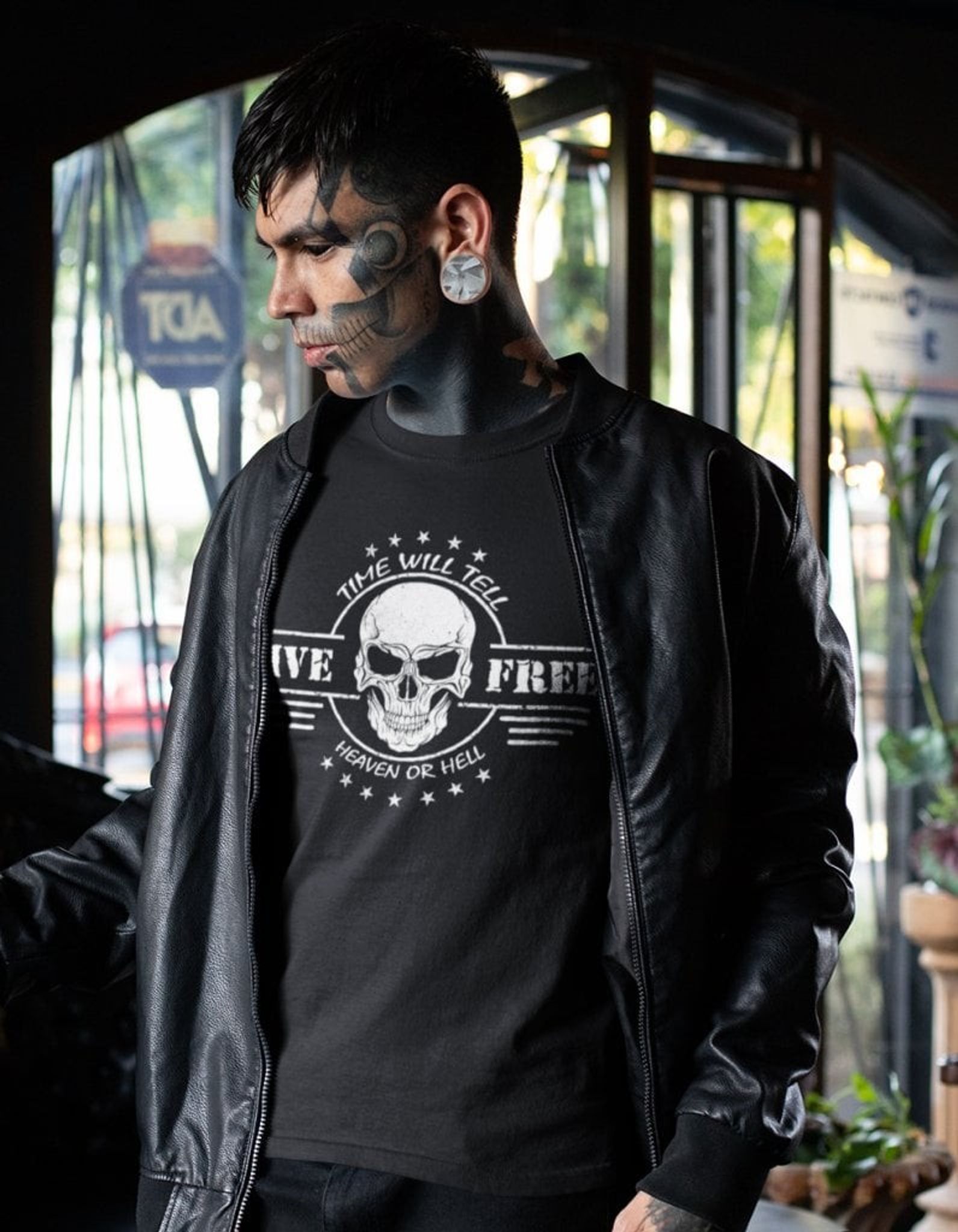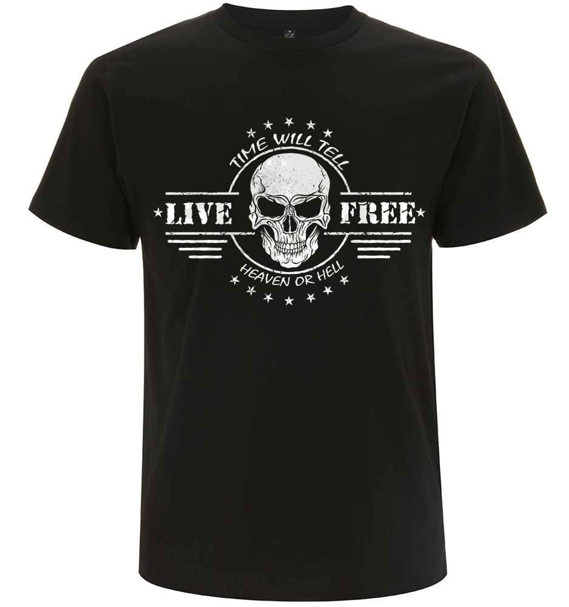 För den djärva och frisinnade. Denna svarta t-shirt bär ett kraftfullt budskap med en skalle i centrum omgiven av orden "LIVE FREE" och "TIME WILL TELL". Med ytterligare undertoner av "HEAVEN OR HELL" förstärker tröjan en känsla av att leva livet på sina egna villkor, oavsett vad framtiden eller ödet vill.