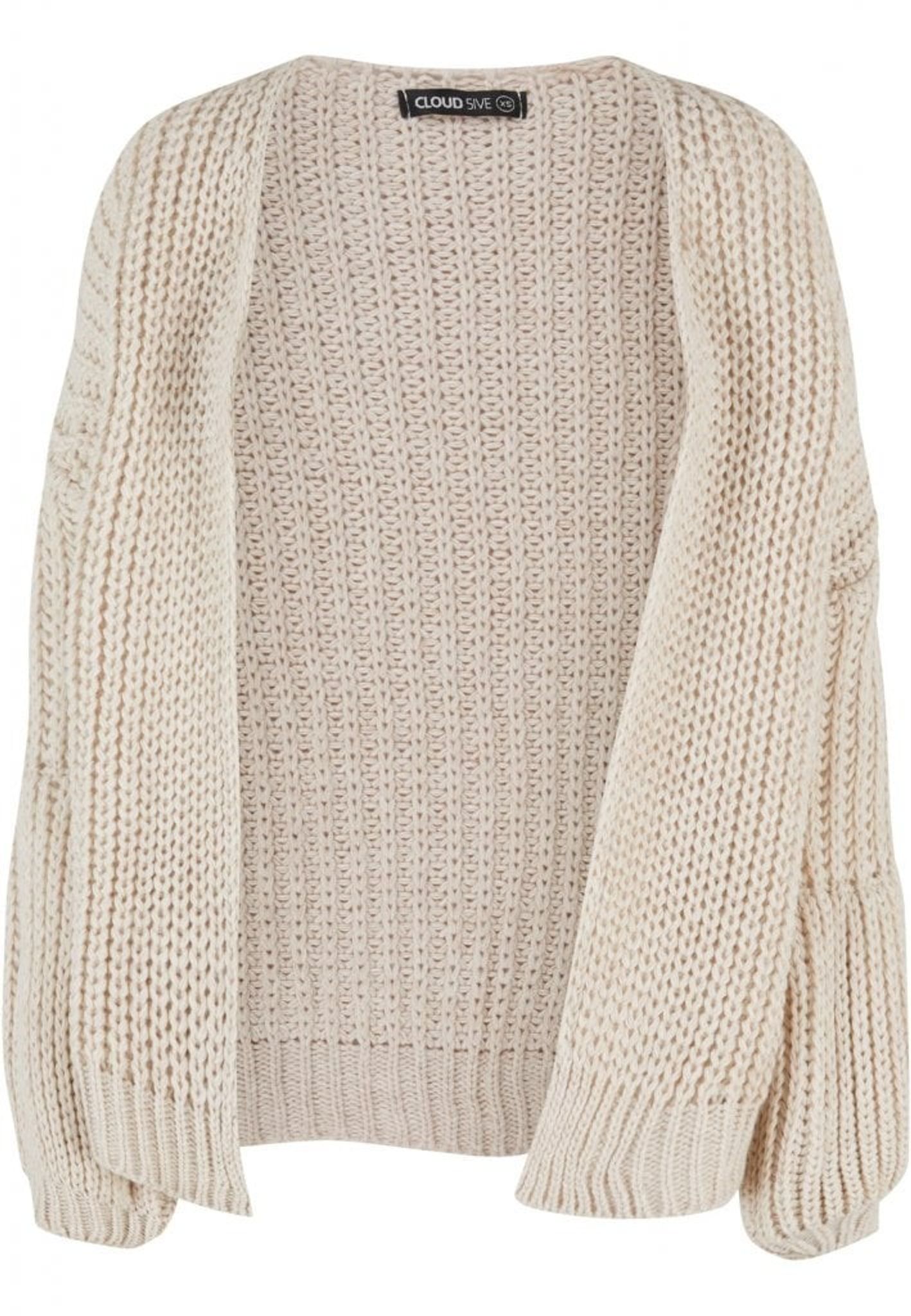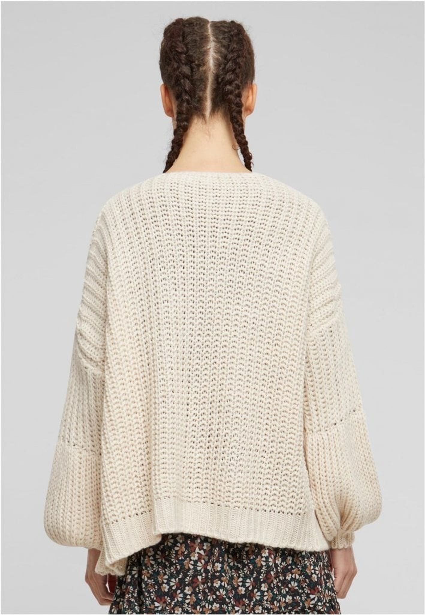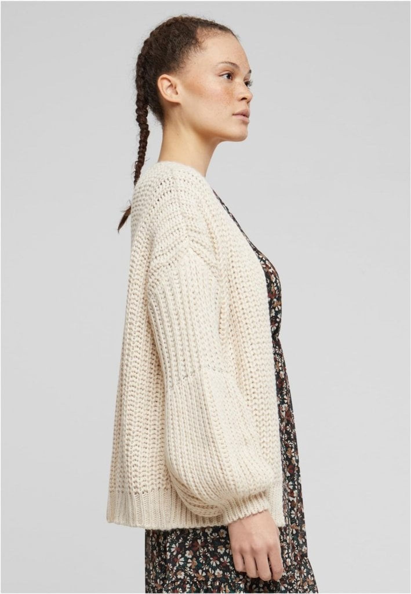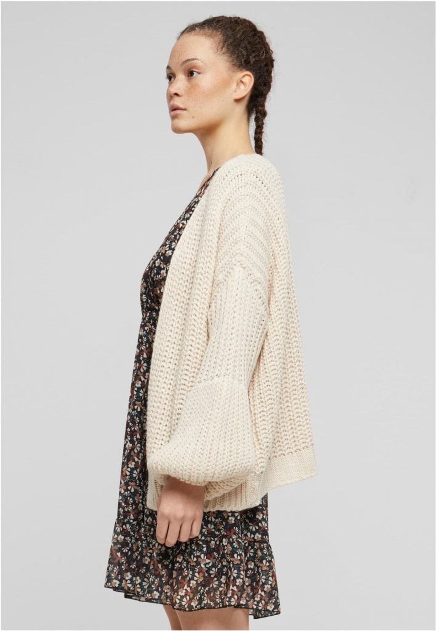Koftan har en generös passform och överdimensionerade ballongärmar som inte bara ger en trendig silhuett utan också rörelsefrihet och komfort. Den är stickad med en tjock och mysig garn som garanterar värme under kallare dagar, samtidigt som den bibehåller en lätt och luftig känsla tack vare den öppna stickningen.