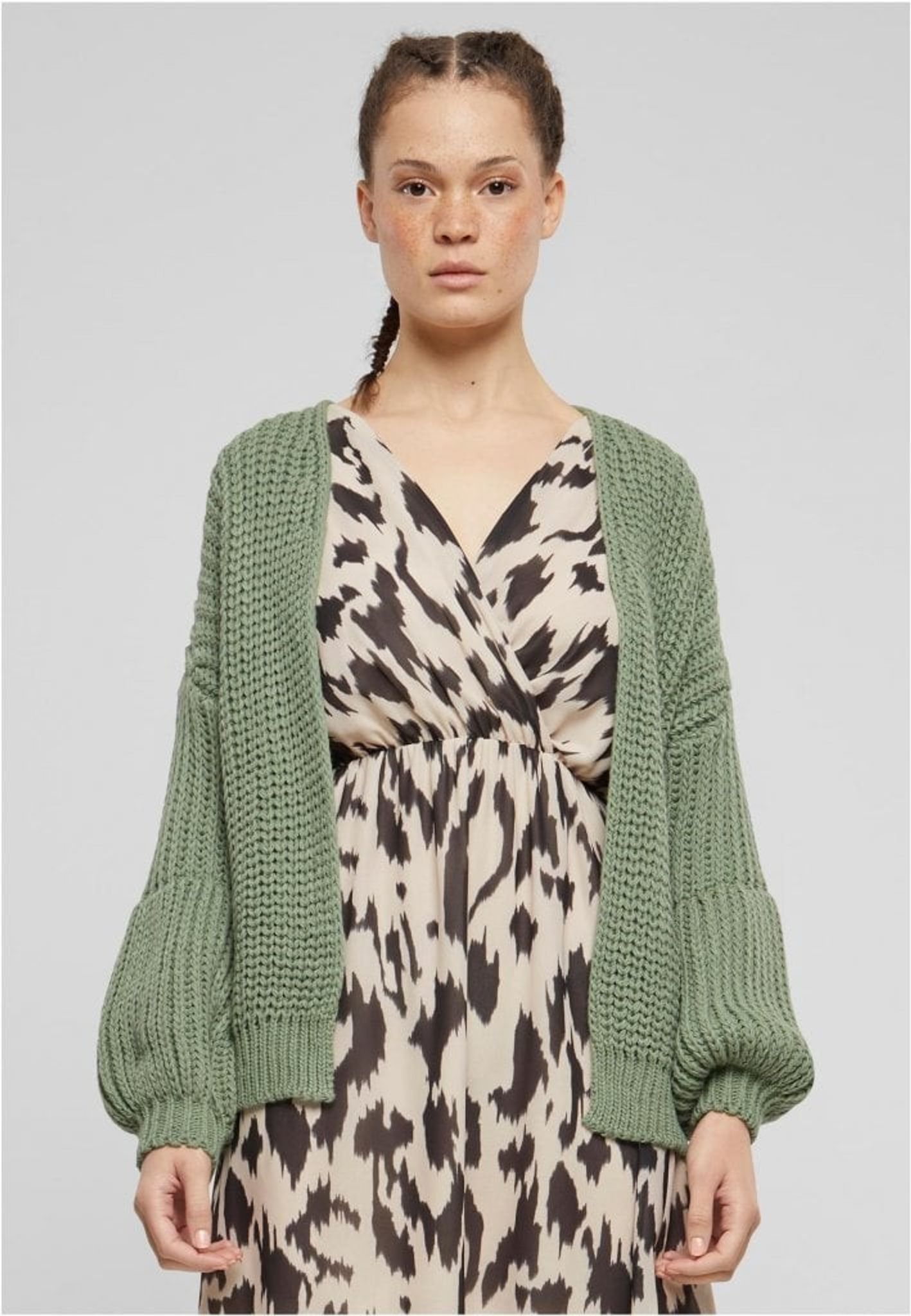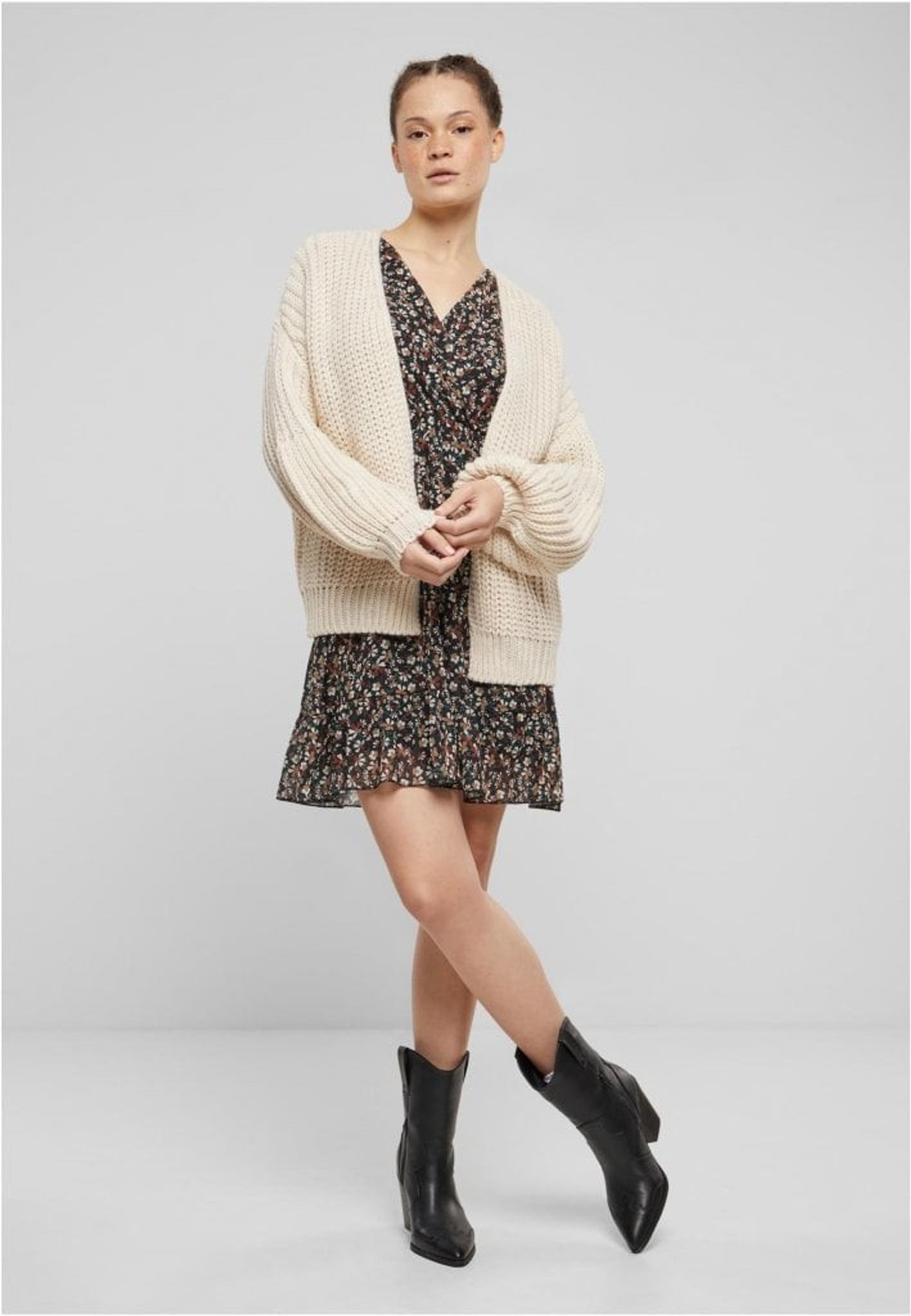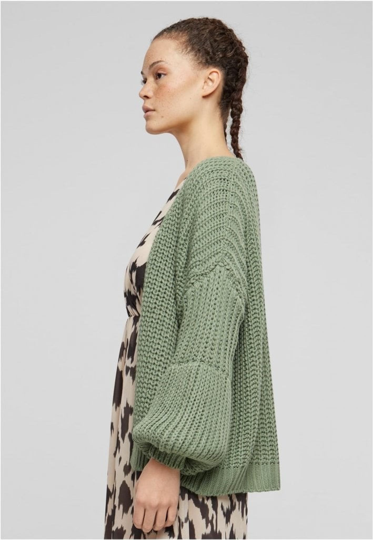 Koftan har en generös passform och överdimensionerade ballongärmar som inte bara ger en trendig silhuett utan också rörelsefrihet och komfort. Den är stickad med en tjock och mysig garn som garanterar värme under kallare dagar, samtidigt som den bibehåller en lätt och luftig känsla tack vare den öppna stickningen.