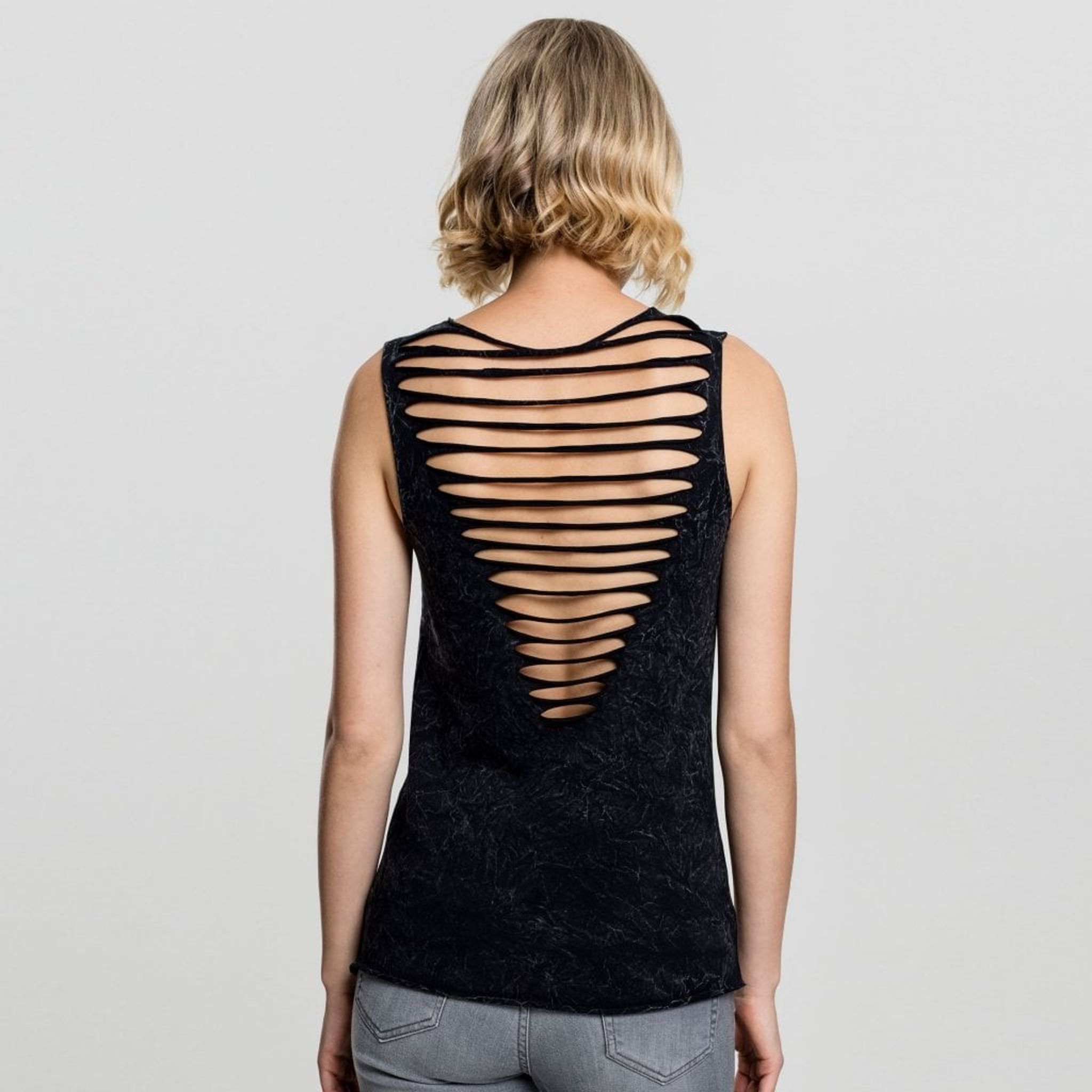 En topp som ser tvättad ut med det lilla mönstret som är genomgående för hela toppen. Över ryggen så har du v formad öppen rygg förutom alla de revor som gör denna toppen helt unik.