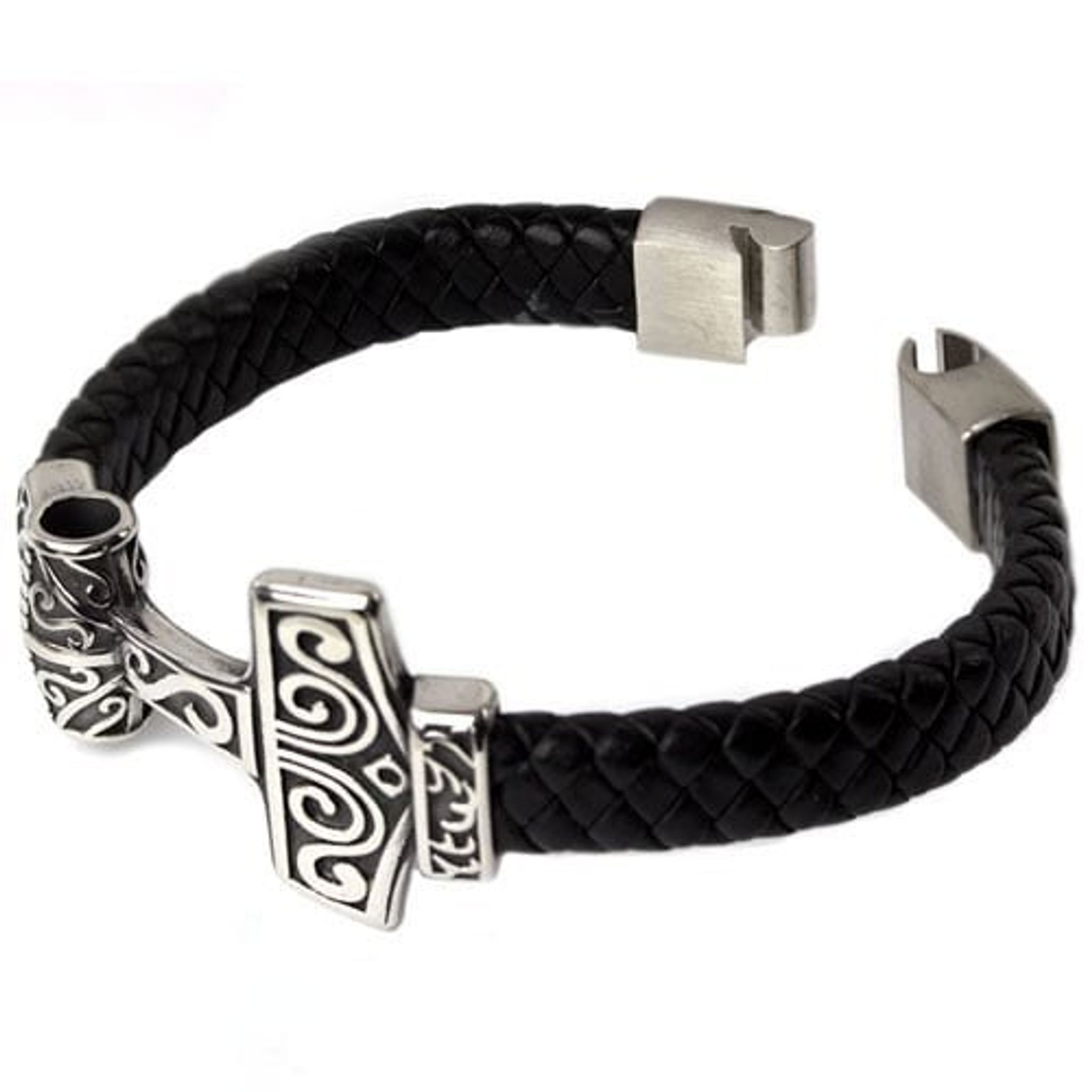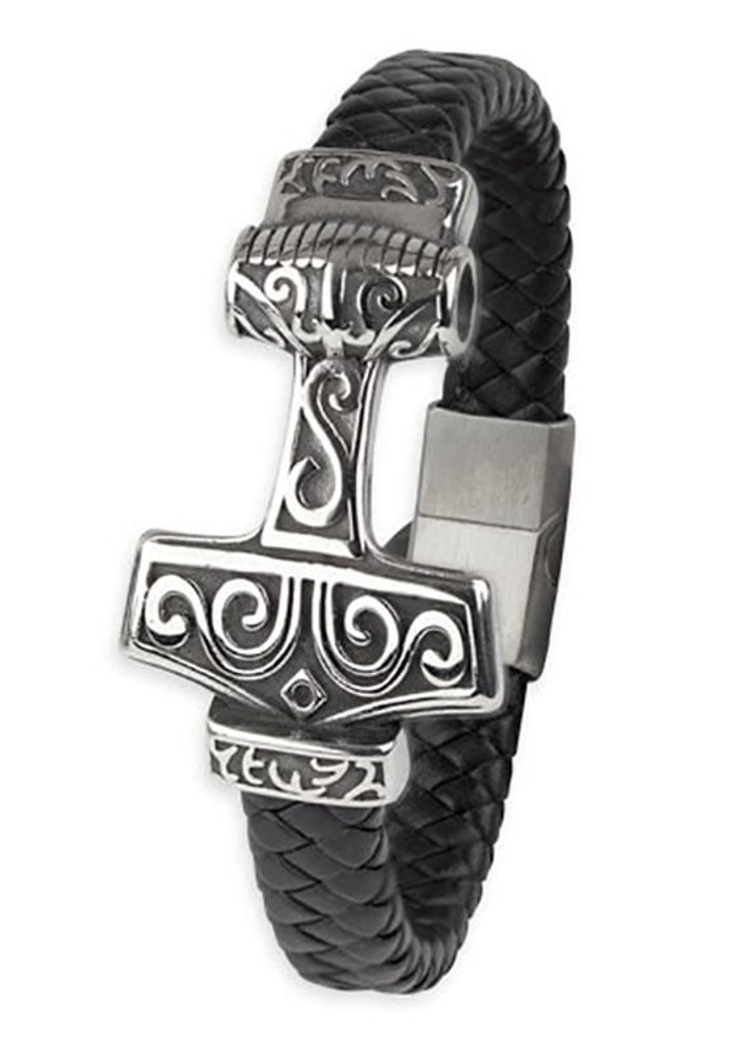 Elegant armband med Tors hammare i rostfritt stål och flätat svart läder för en kraftfull stil.