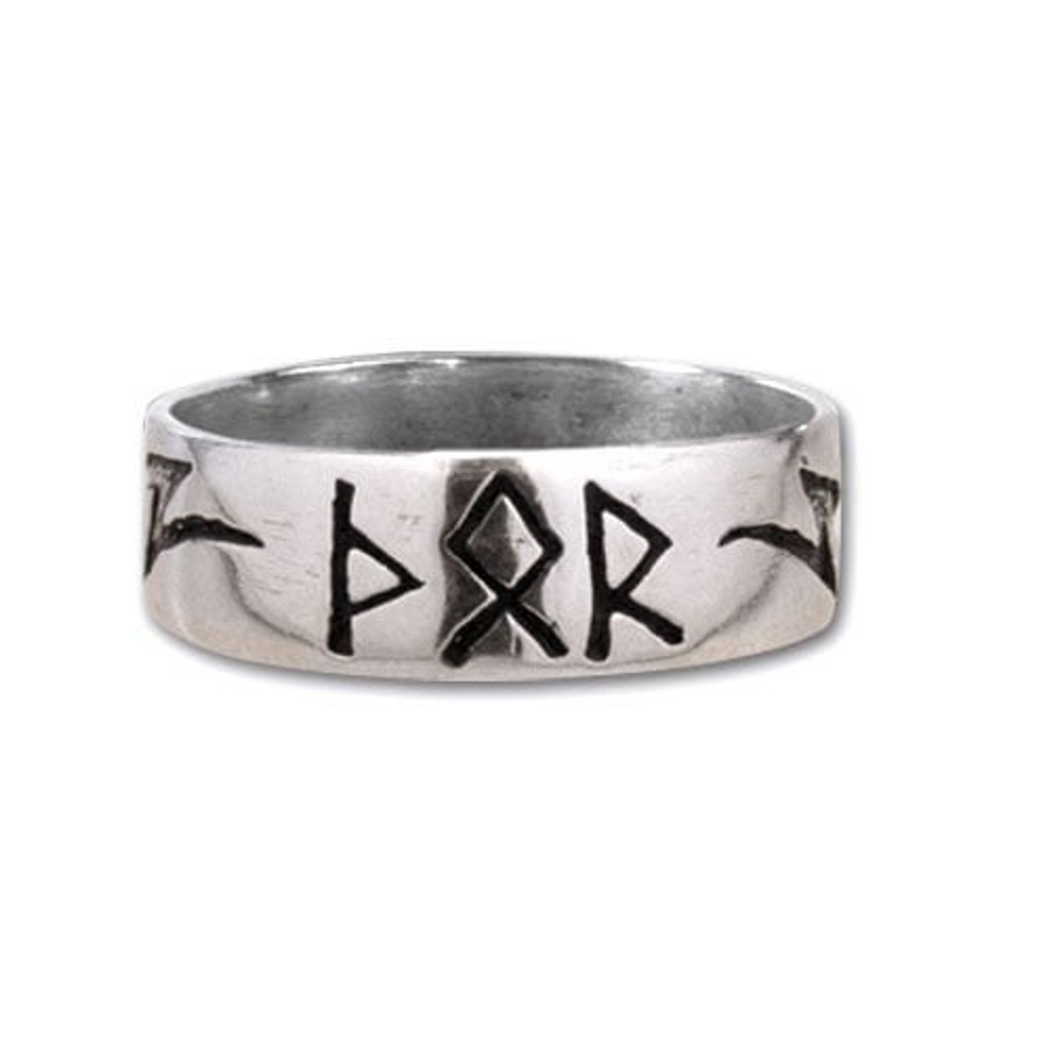 En silvrig ring med svarta runor.