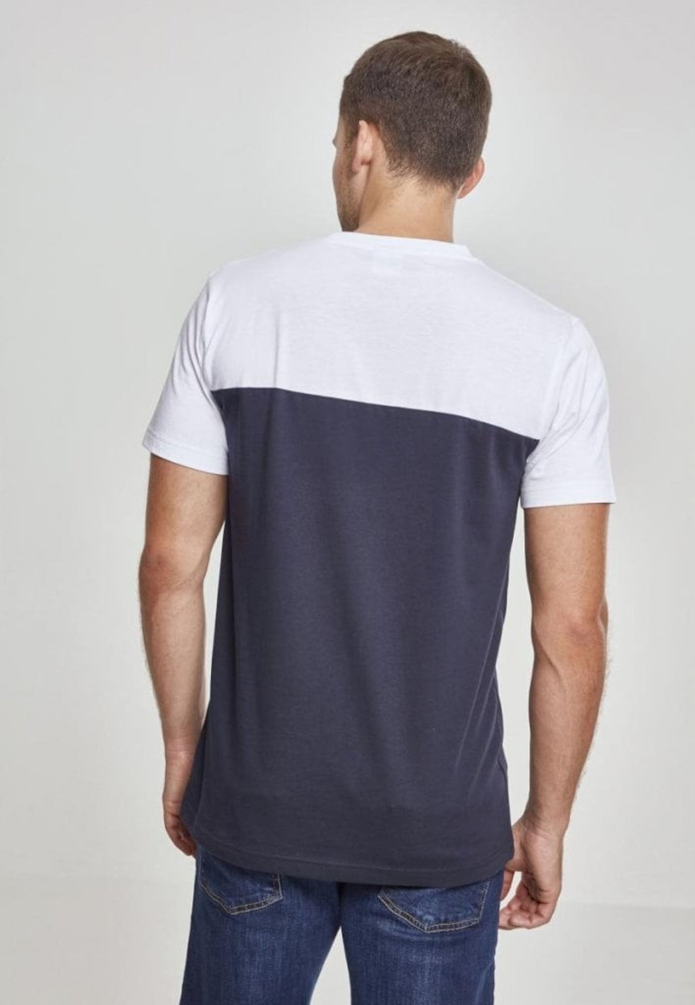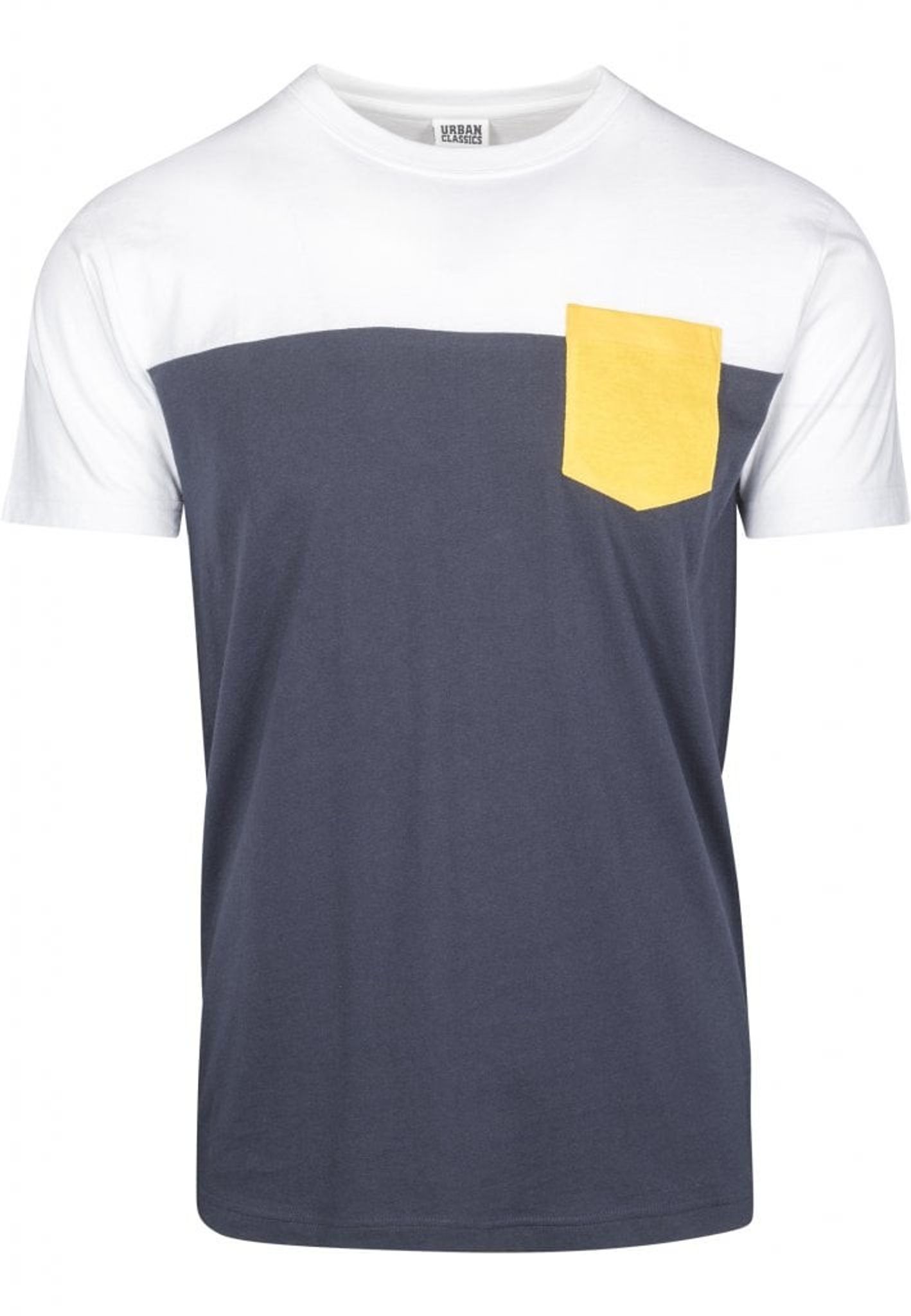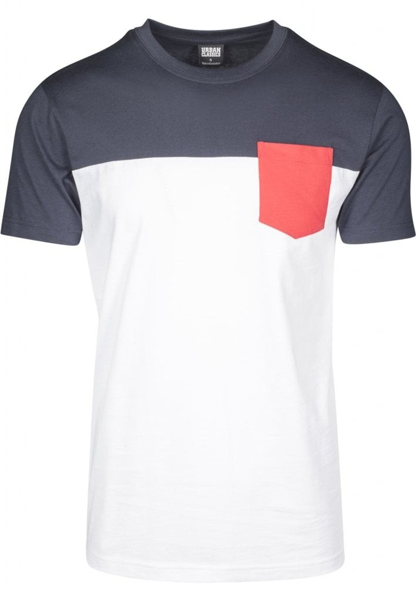 En riktigt snygg T-shirt där kroppen går i två olika färger för att sedan ha en bröstficka med ytterligare en tredje färg.