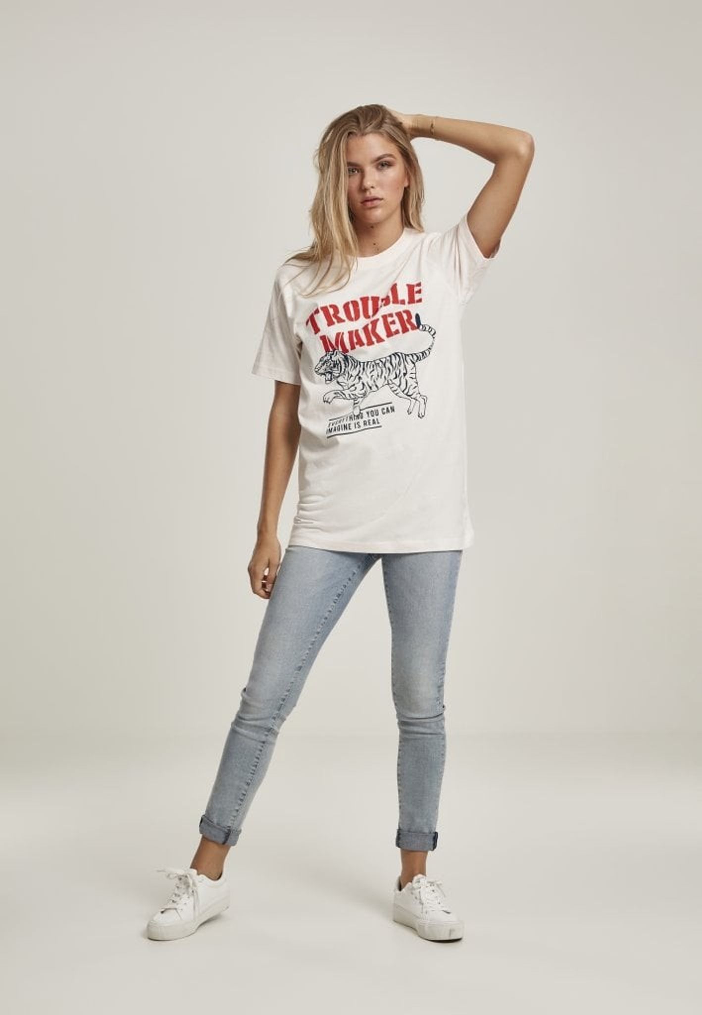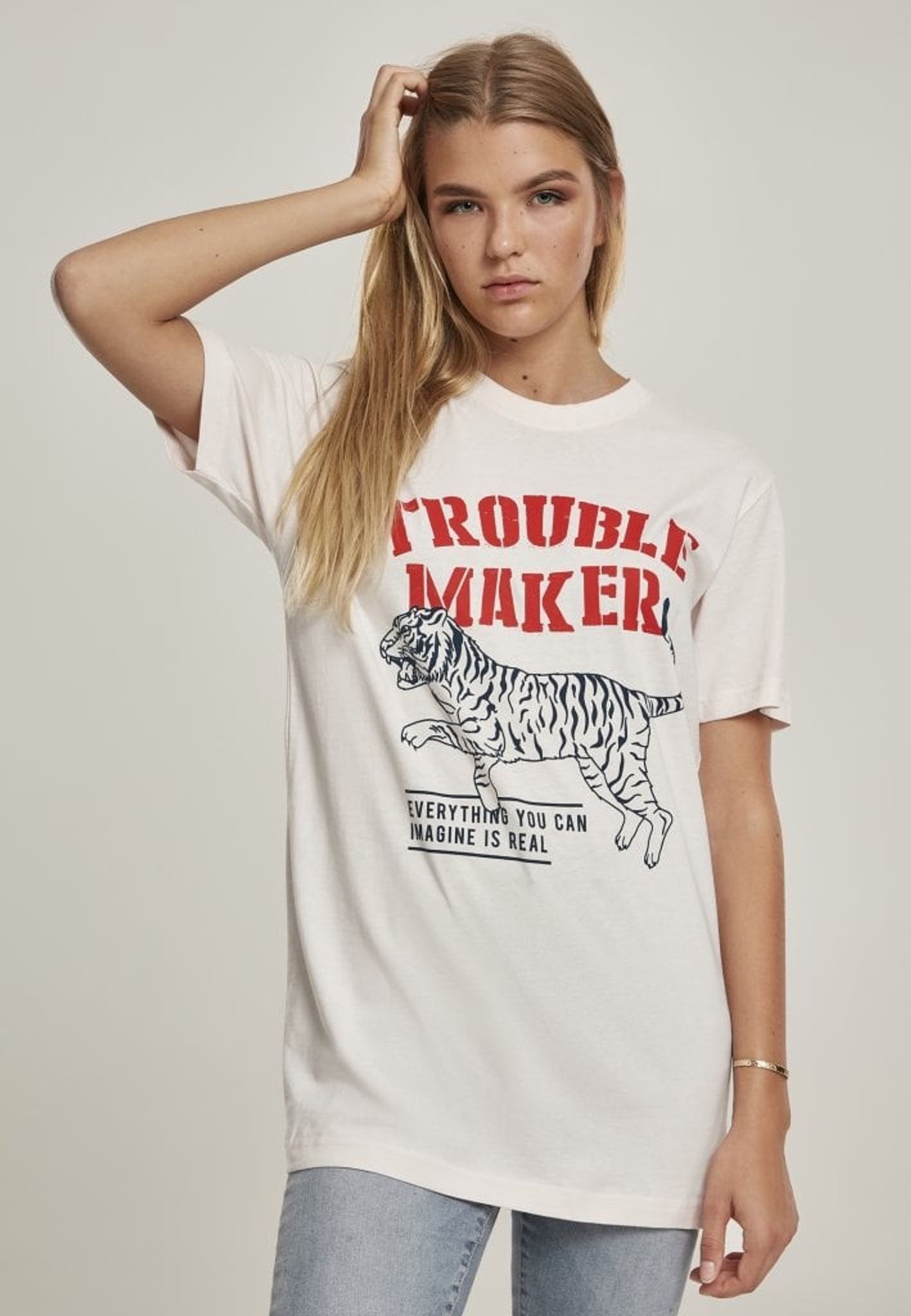 Troublemaker Tee dam. Släpp lös tigern i dig! Här har du en perfekt oversize T-shirt för trubbelmakaren. Material: 100% bomull.