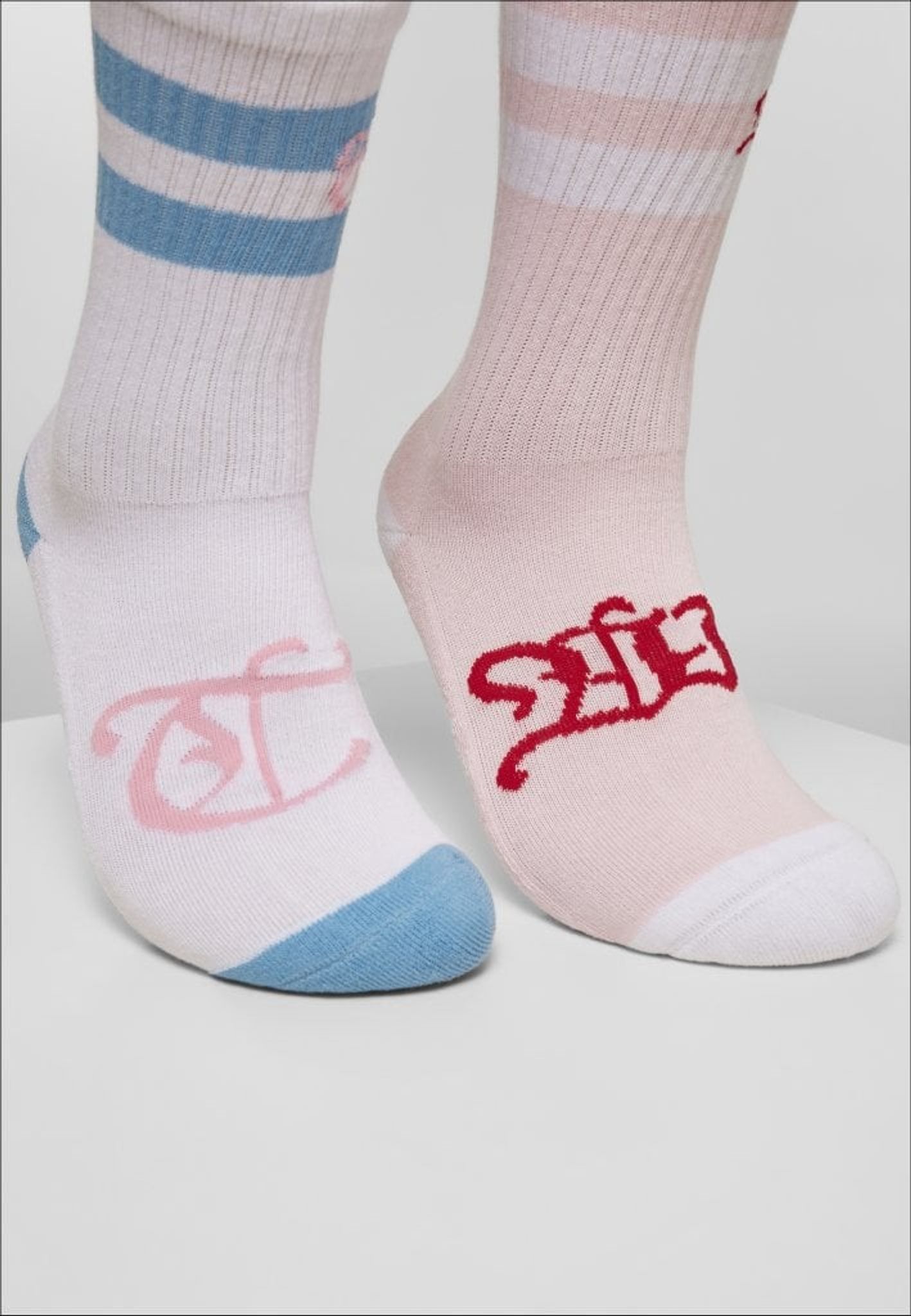 Två färgkoordinerade par jacquardstrumpor med motivet "Trust" och "Wanted". Orden framträder över vaderna på strumporna som är markerade i färg och med dubbla ränder. Vristen har också krusiva bokstäver och häl- och tåområdena är i kontrasterande färg. Dessutom är strumporna skurna så de når upp till vaden och är utrustade med ribbade överdelar och smala, elastiska muddar. De är tillverkade av bomull, polyester och spandex.