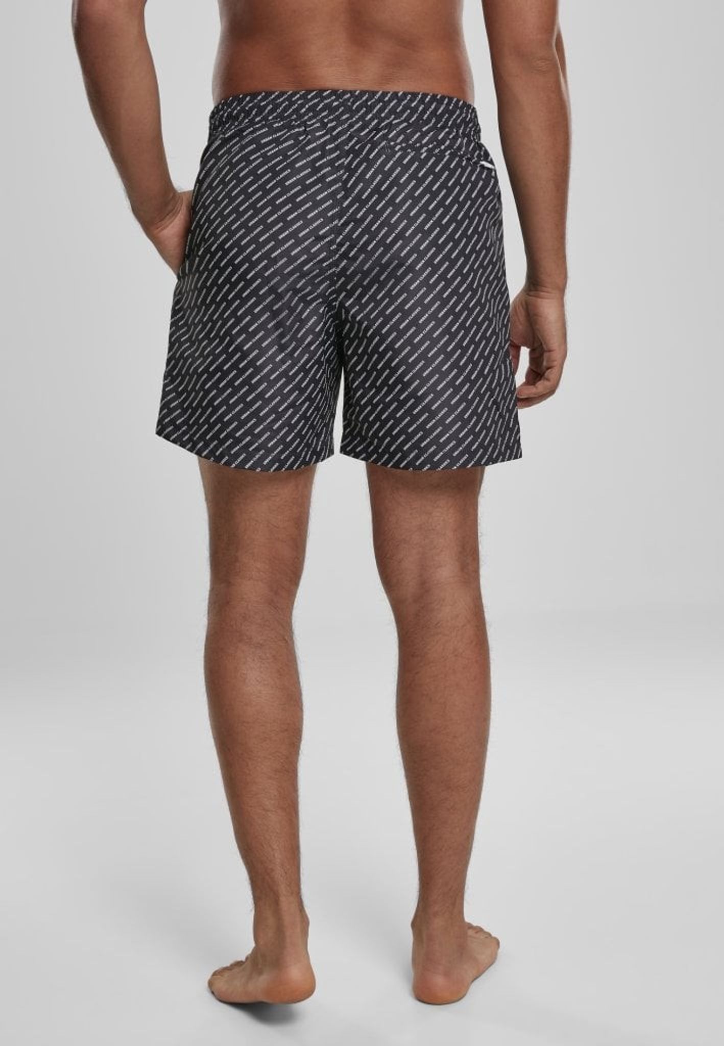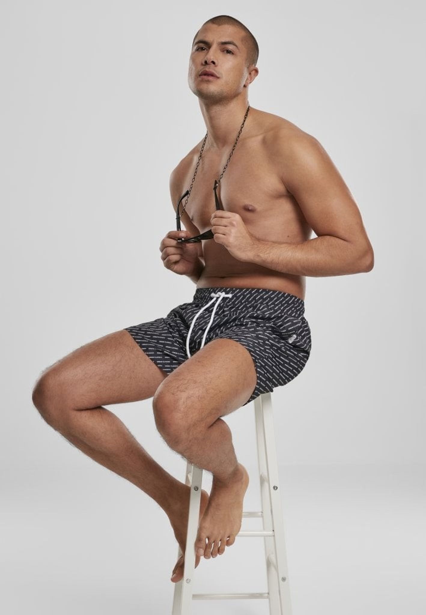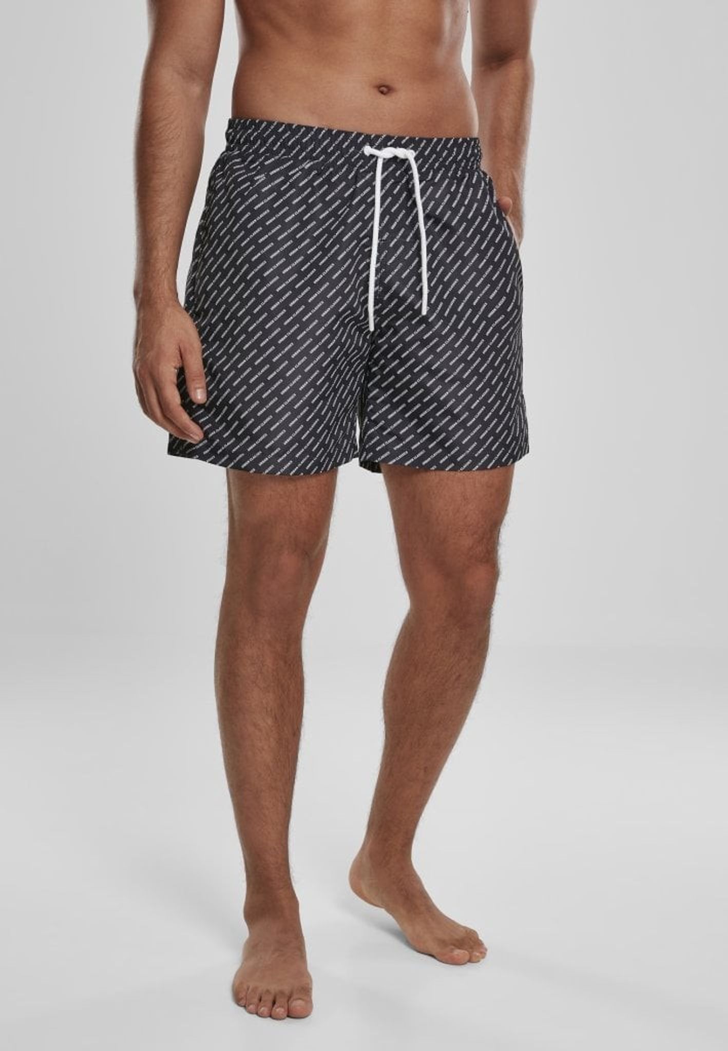 Svarta badshorts med Urban Classics logotyp tryckt i små streck över tyget.