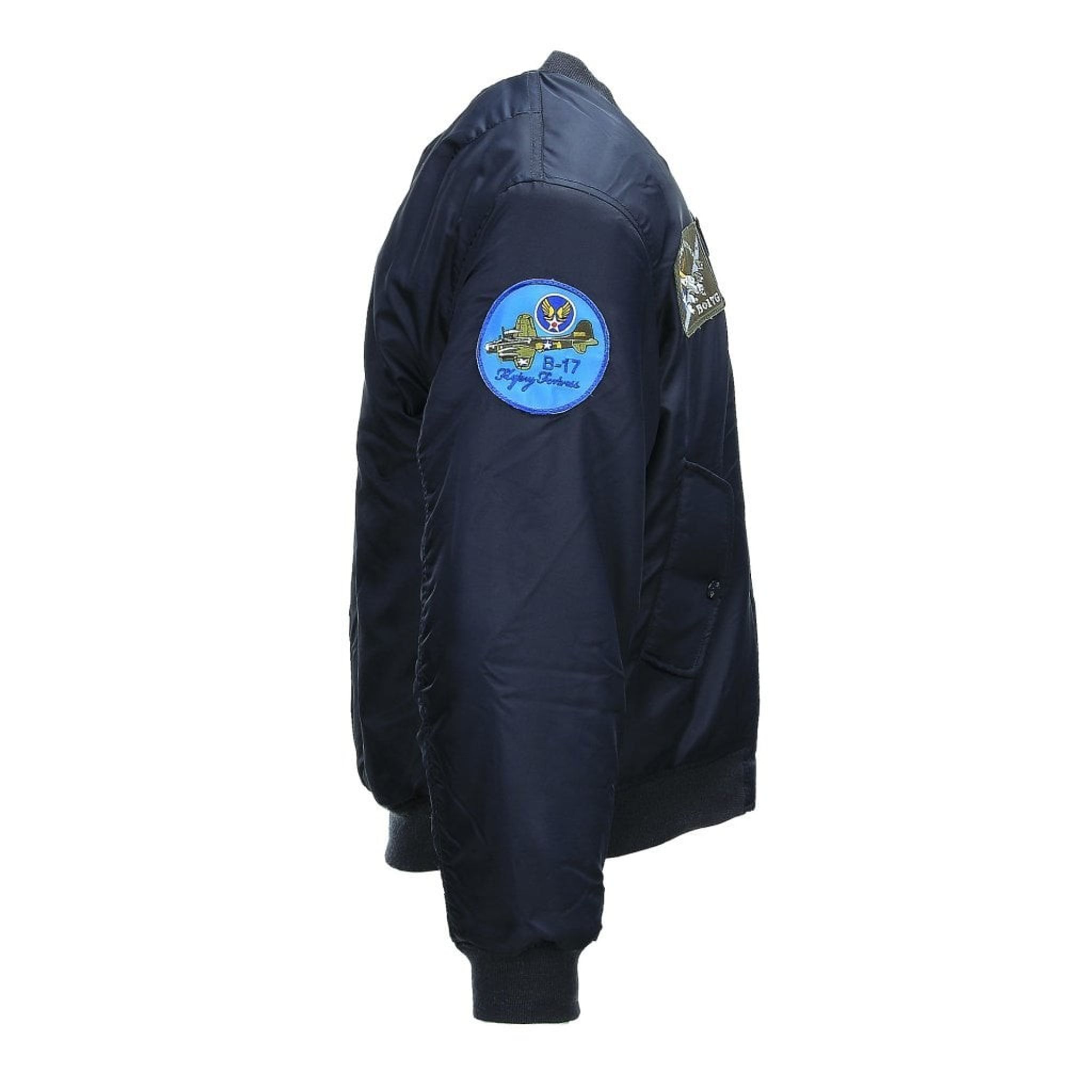 Jackan är utrustad med flera förvaringsfickor, vilket gör den praktisk för att förvara småsaker. Det som gör denna originala och autentiska flygjacka unik är de sju olika broderade emblem som pryder den.