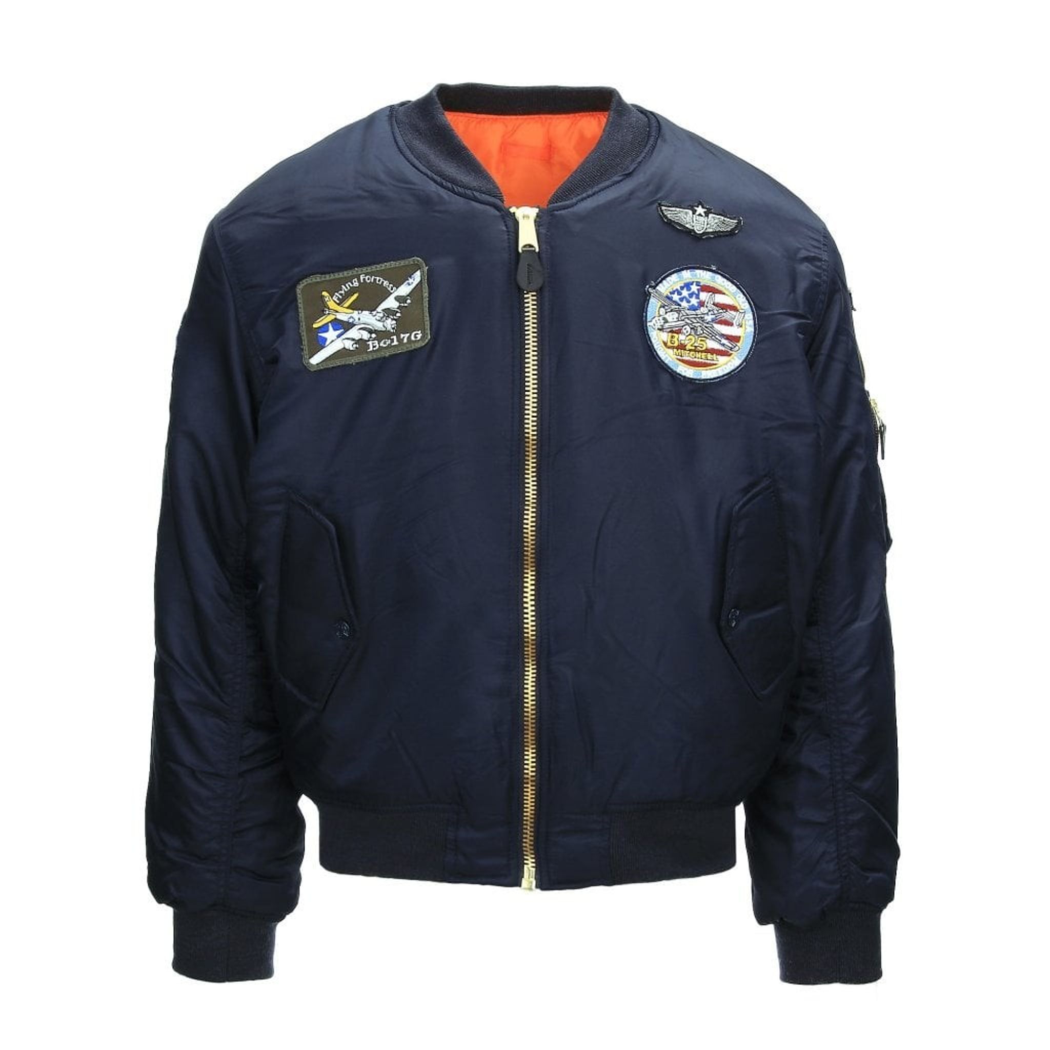 De broderade emblemen inkluderar B-17 Flying Fortress, B-17G Flying Fortress, B-25 Mitchell, Wing senior pilot, US Air Force, den amerikanska flaggan samt Fighting 81.