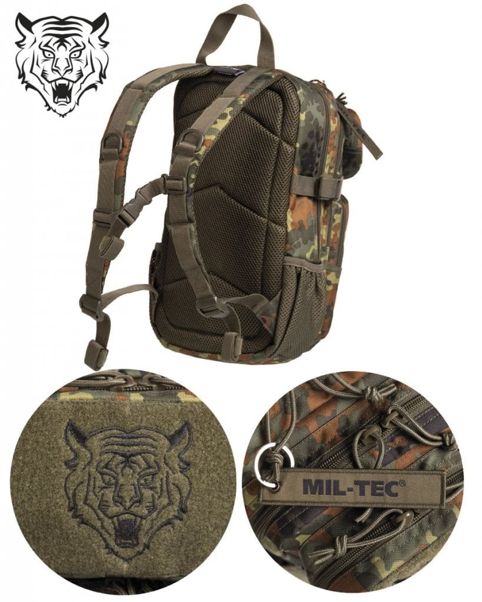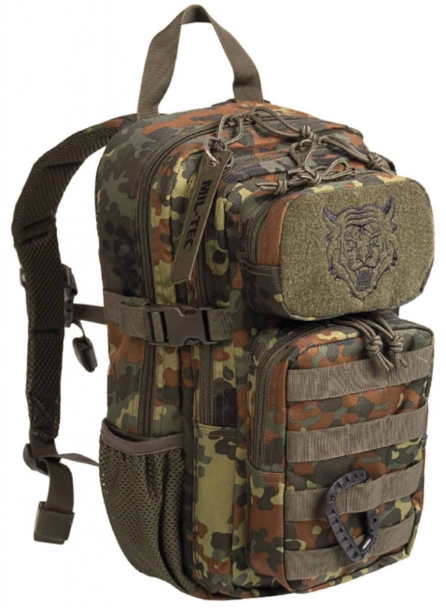 US Assault-ryggsäck i tyska kamouflaget flecktarn och i barnstorlek. Baksidan har en rejäl vaddering och med ett ventilerande nättyg. Axelremmarna är ergonomiska, vadderade och justerbara i längden. Axelremmarna är dessutom försedda med en bröstrem som stängs med klickspänne.