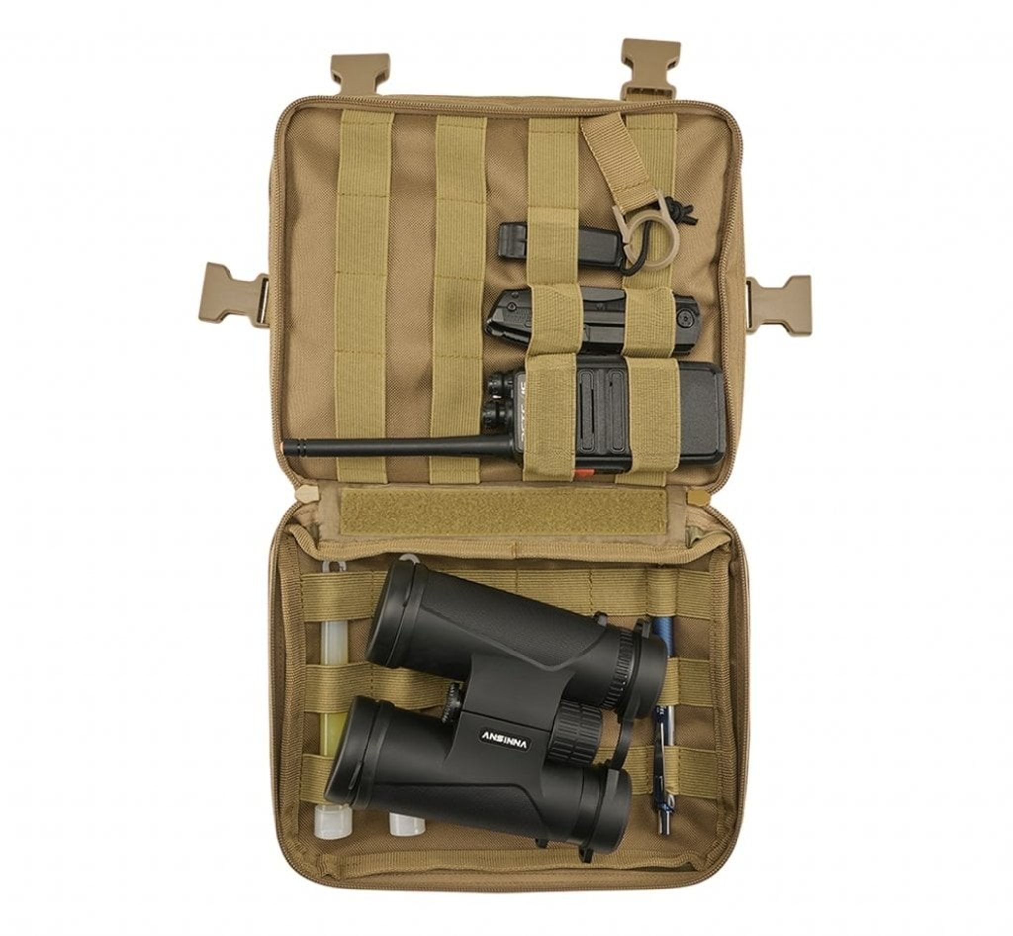 Inuti väskan finns en fack med dragkedja samt MOLLE-loopar med kardborre. Väskan har också 2 meshfickor, 2 D-ringar/nyckelring.