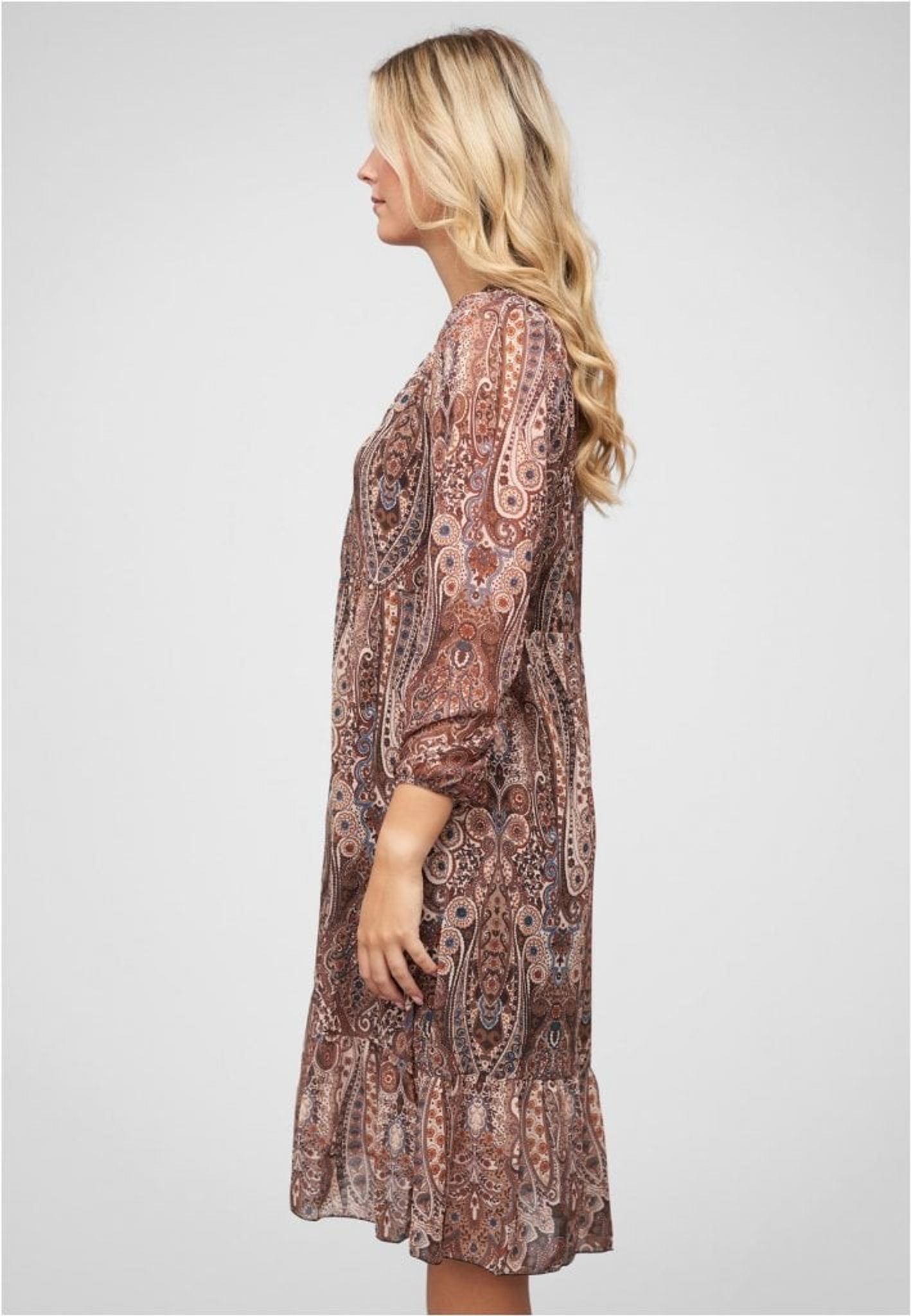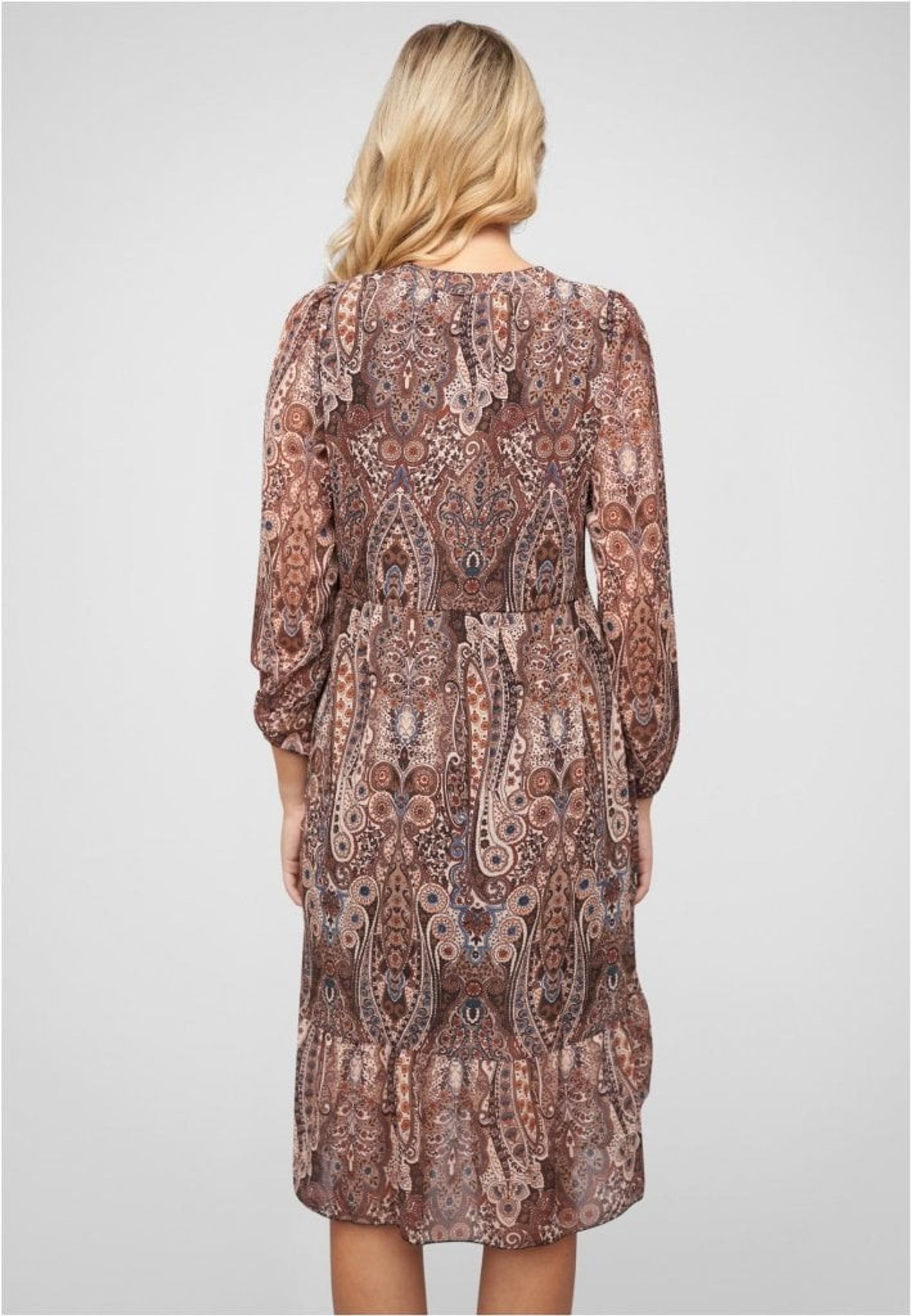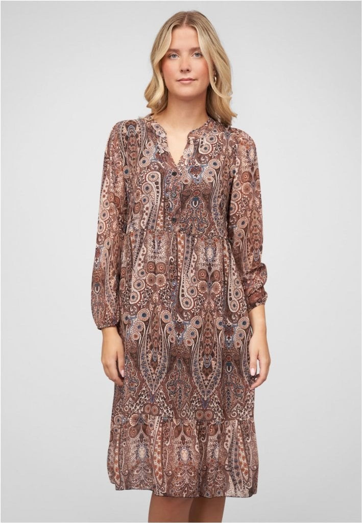 Upptäck vår eleganta V-ringade klänning med knappslå och paisleymönster, perfekt för både vardag och fest. Den tvålagiga designen i bruna och beiga toner ger en tidlös och stilren look som passar alla tillfällen.