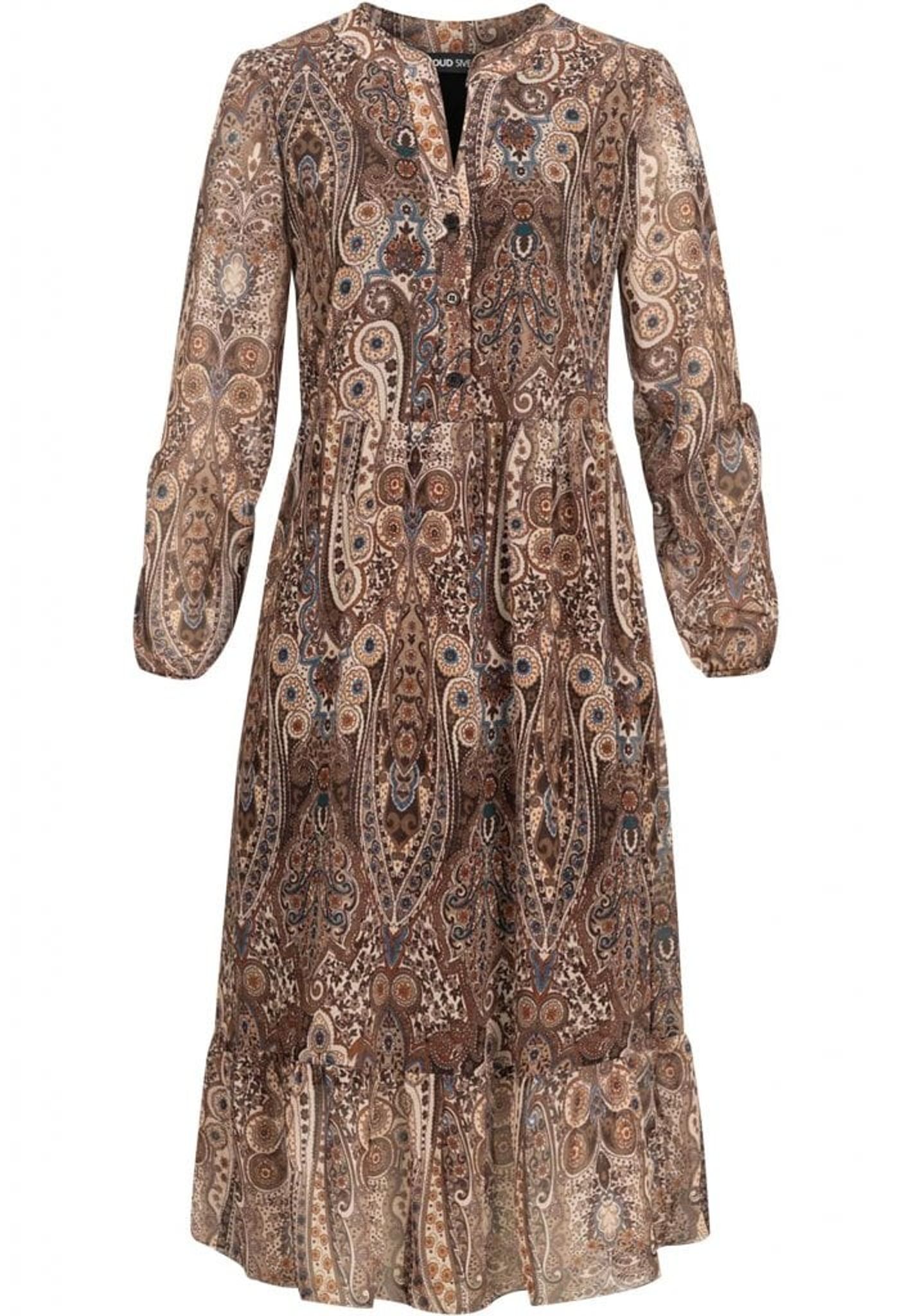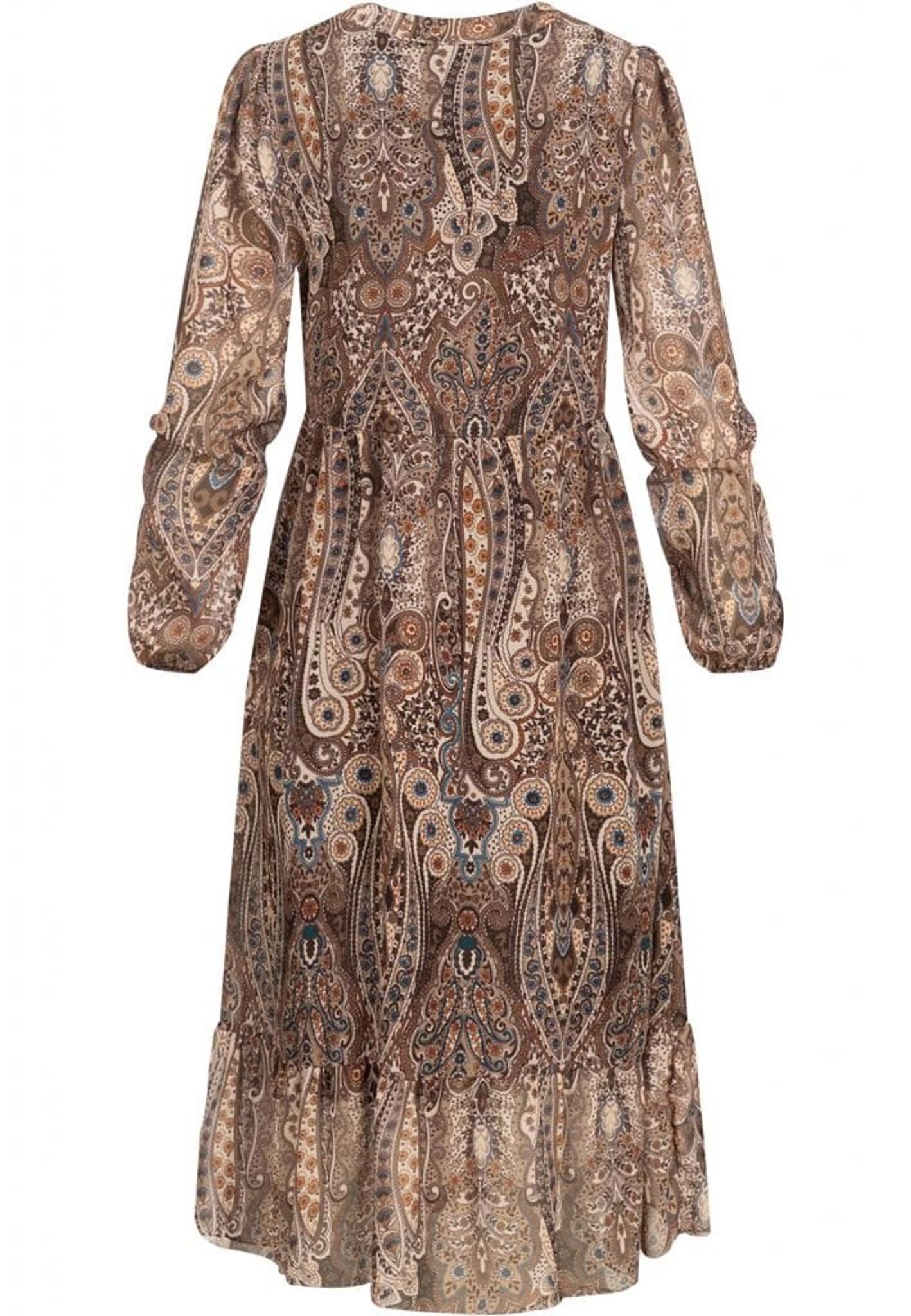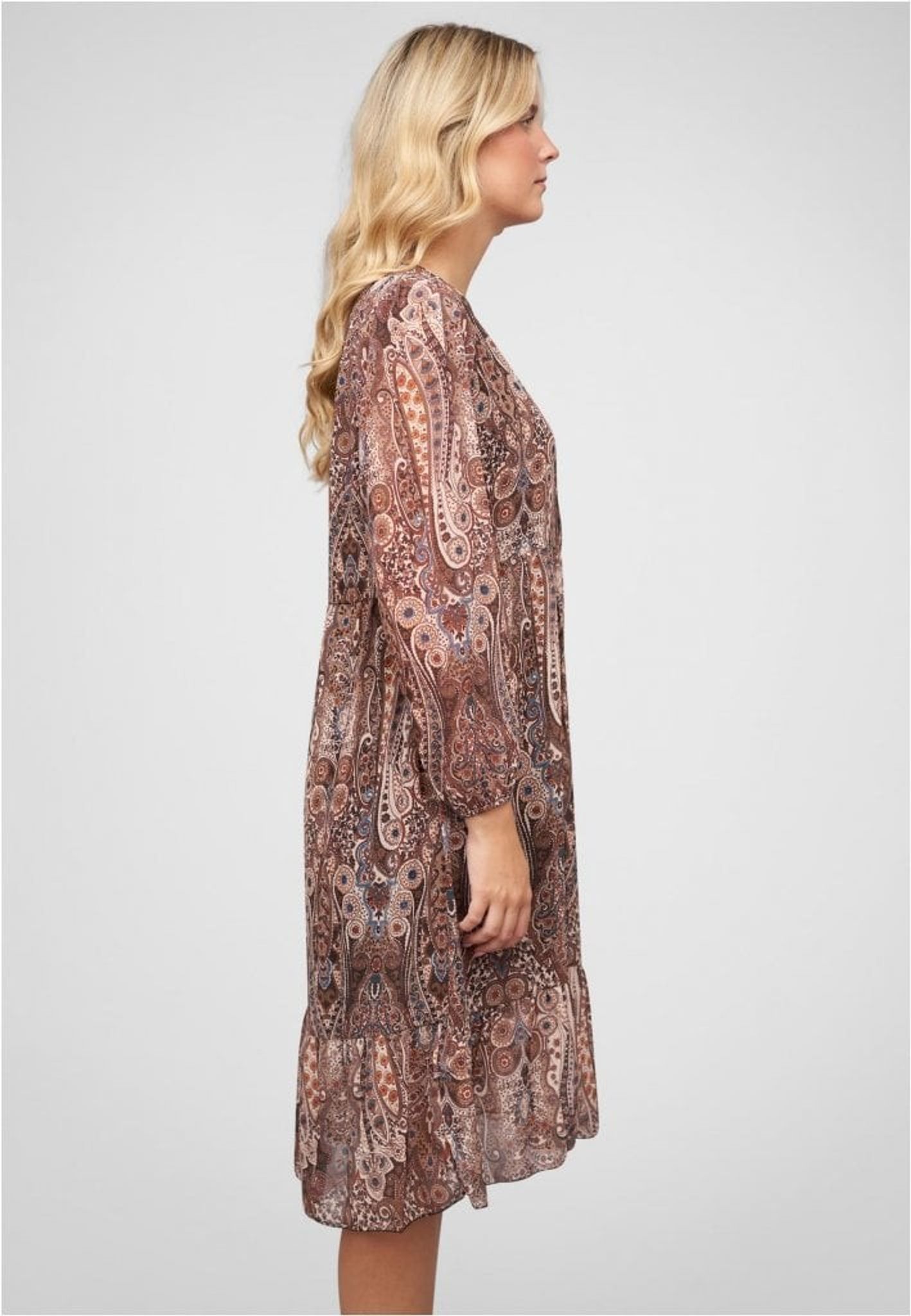 Upptäck vår eleganta V-ringade klänning med knappslå och paisleymönster, perfekt för både vardag och fest. Den tvålagiga designen i bruna och beiga toner ger en tidlös och stilren look som passar alla tillfällen.