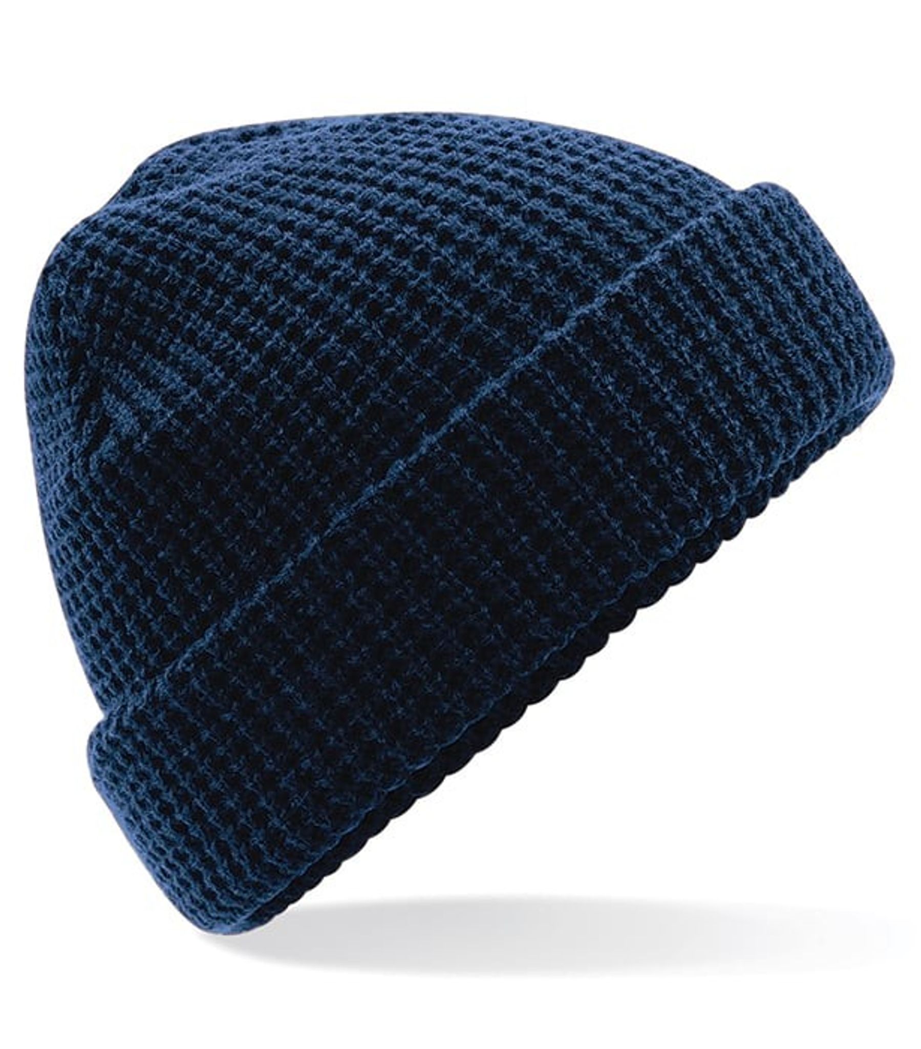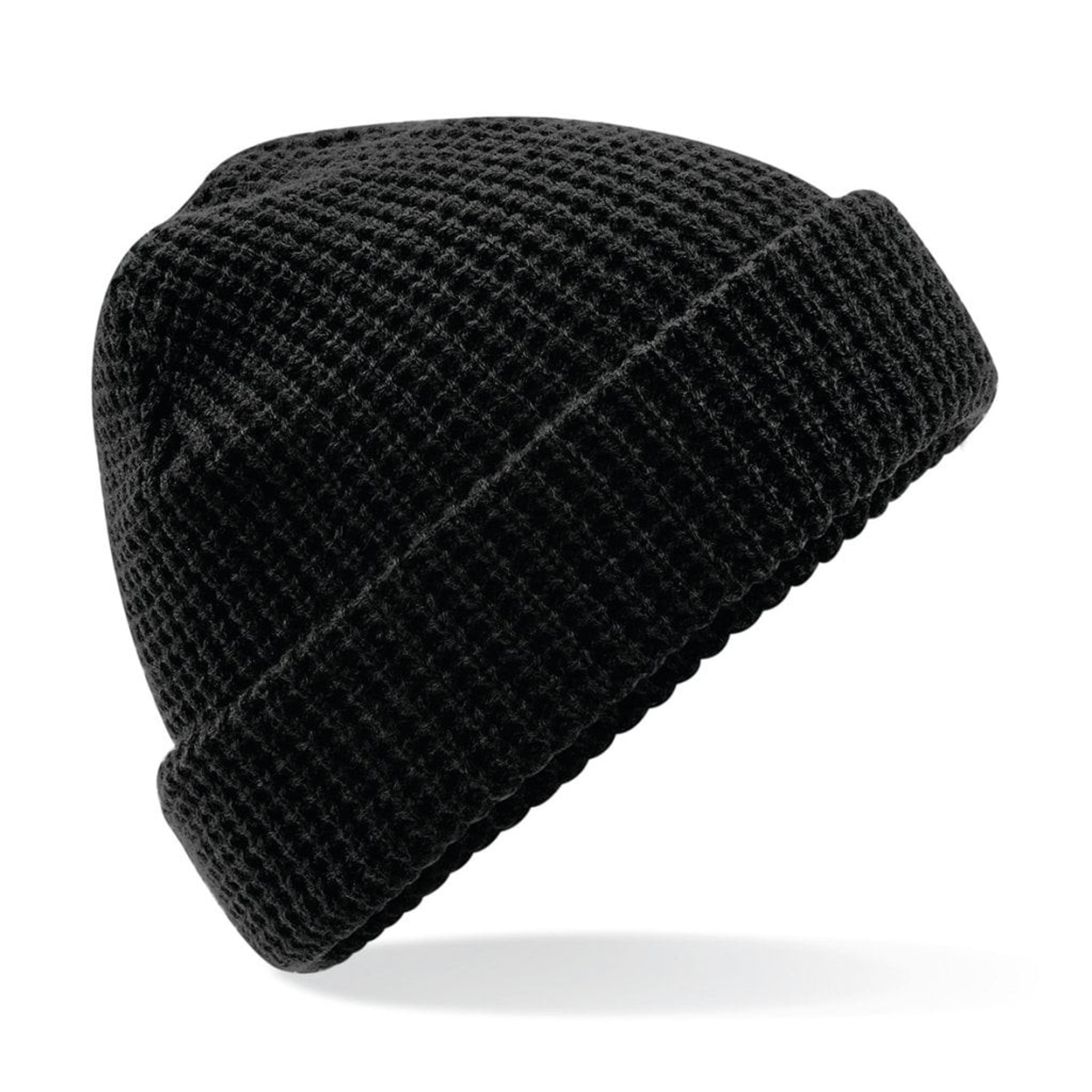 En våffelstickad mössa med dubbla lager och en uppvikt kant.