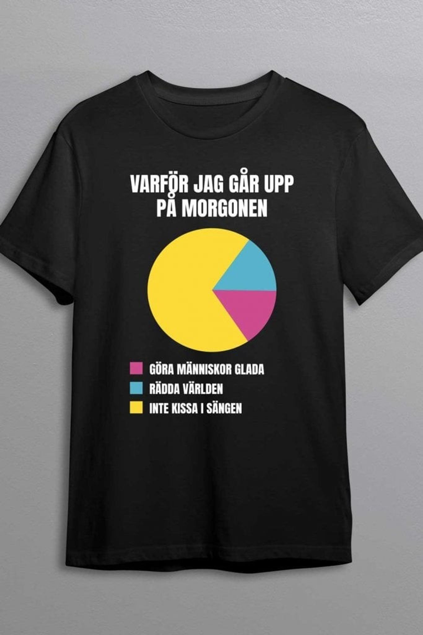Varför Jag Går Upp T-shirt är en humoristisk t-shirt som fångar de viktiga anledningarna till att kliva ur sängen varje morgon. Med ett kul diagramtryck som fördelar skälen mellan "Göra människor glada," "Rädda världen," och "Inte kissa i sängen," är denna t-shirt perfekt för dig som vill sprida lite skratt och lättsamma vibbar omkring dig. Diagrammets lekfulla färger står i skarp kontrast mot den svarta bakgrunden, vilket gör att designen verkligen sticker ut.