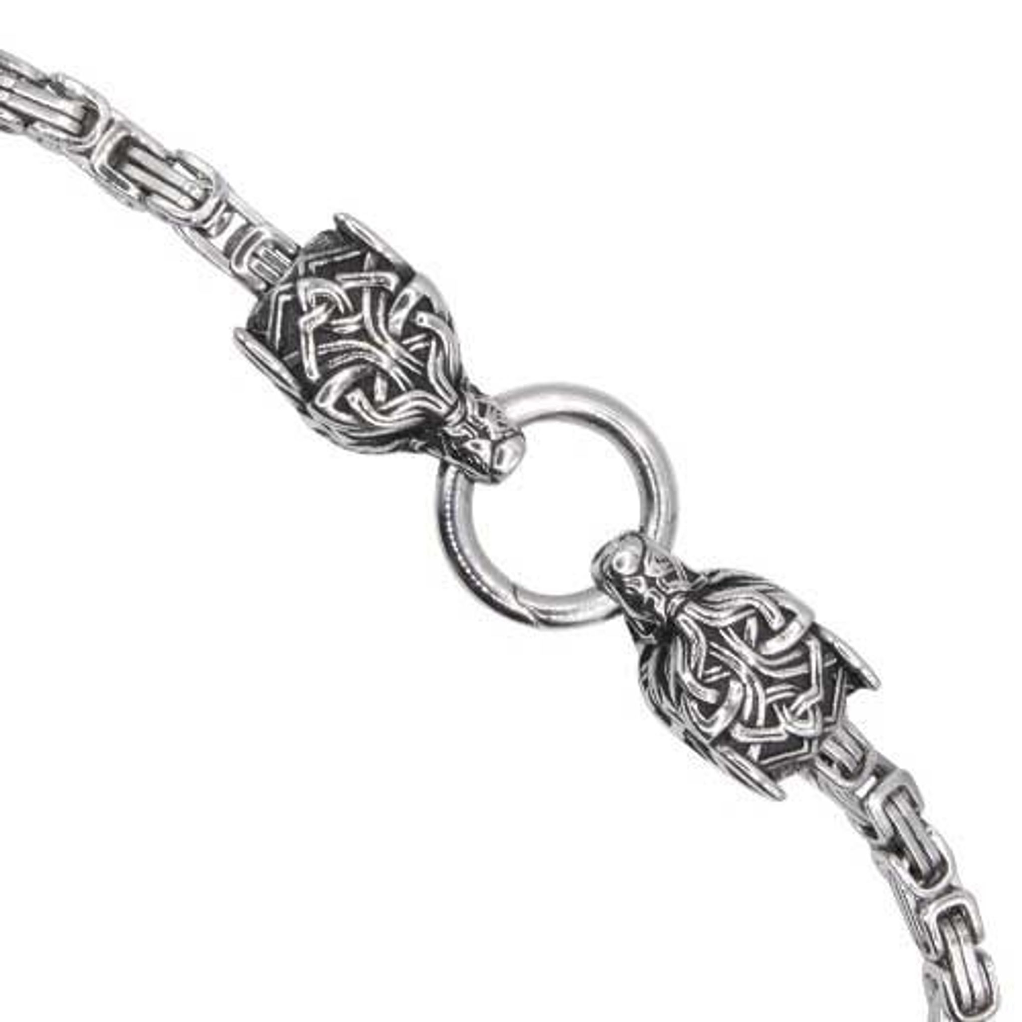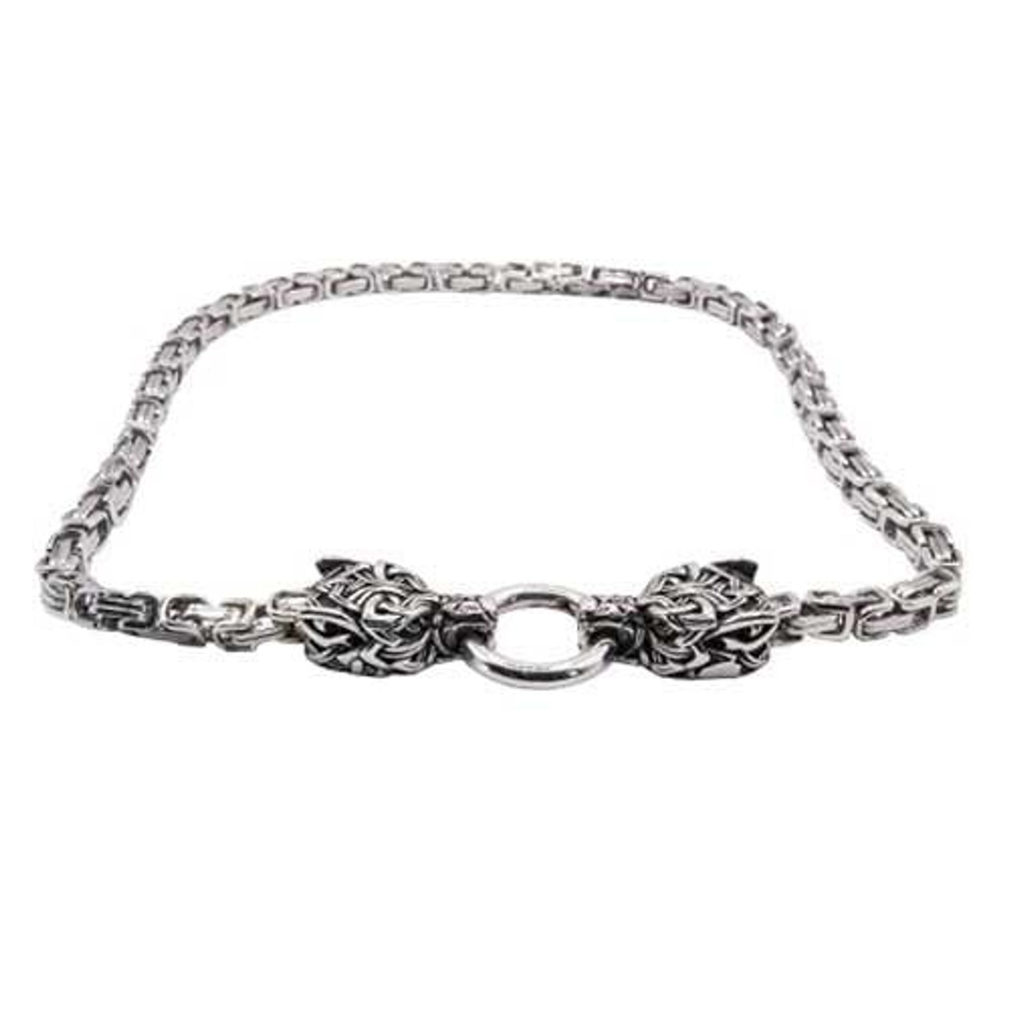 Den här halskedjan från etNox är en strålande hyllning till den nordiska mytologins kraft och mystik. Kedjan är formad i det traditionella King's Chain-mönstret, vilket ger en känsla av styrka och adel. Tillverkad av rostfritt stål, stoltserar kedjan med två utsökt formgivna varghuvuden, vars detaljrika utsmyckningar för tankarna till uråldriga hantverkstraditioner.