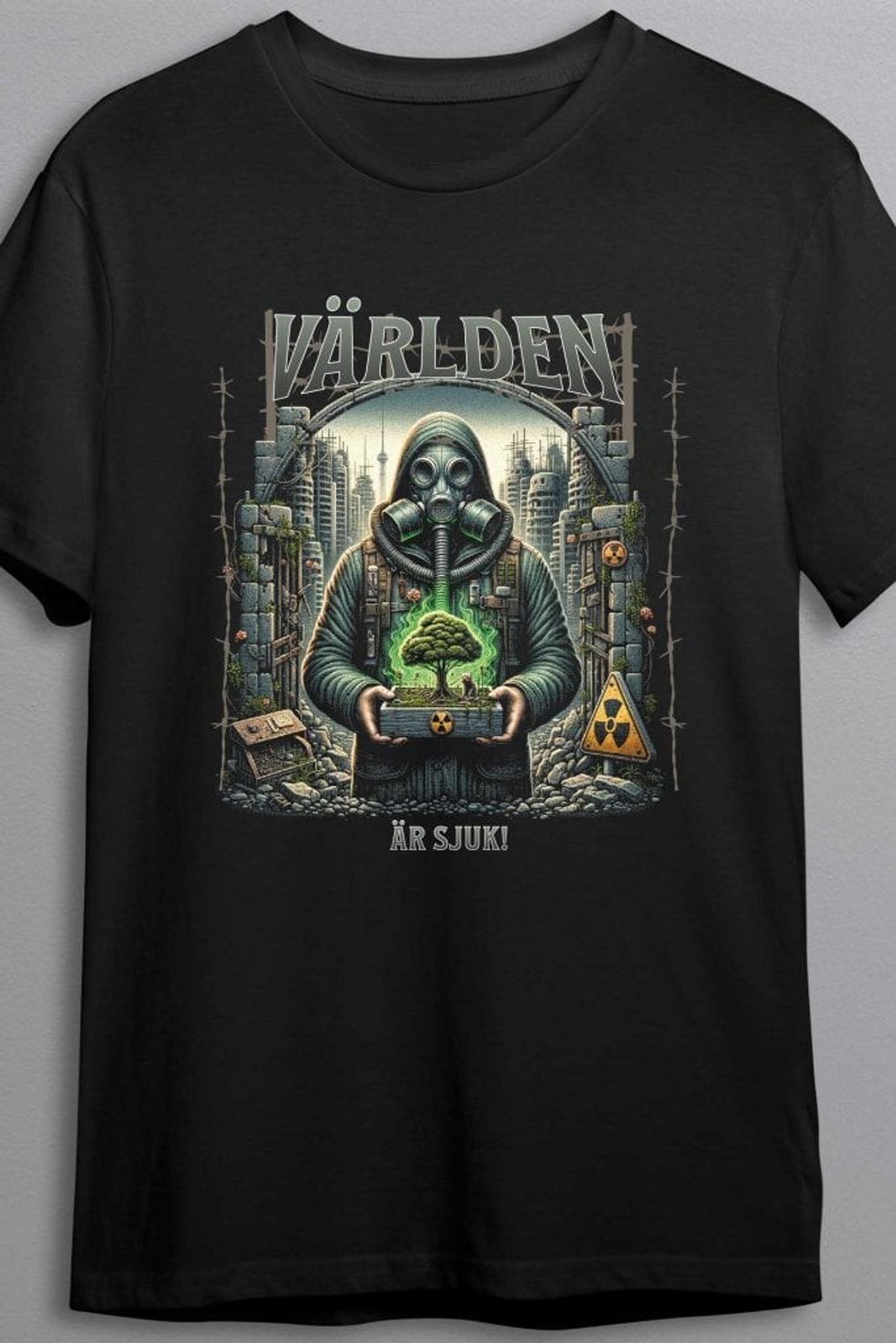Denna svarta T-shirt bär ett kraftfullt budskap med en detaljrik design som skildrar en dystopisk värld. Motivet visar en person i gasmask som håller i en liten låda med ett frodigt träd, en symbol för hopp i en annars förfallen och radioaktiv omgivning. Runtomkring syns resterna av en förlorad civilisation, med övergivna byggnader, taggtråd och varningsskyltar för strålning. Ovanför motivet står texten "VÄRLDEN", medan budskapet "ÄR SJUK!" tydligt framträder under bilden.