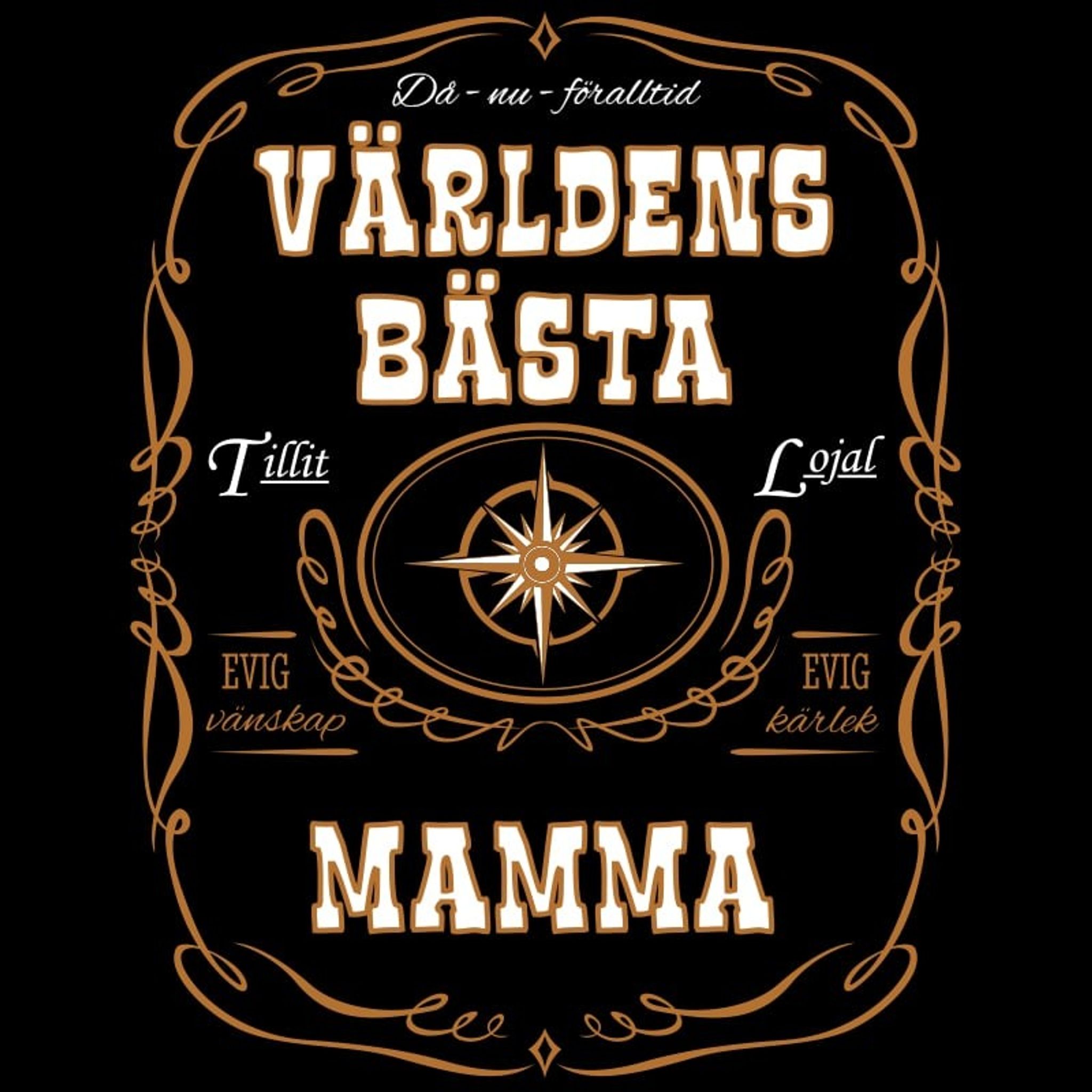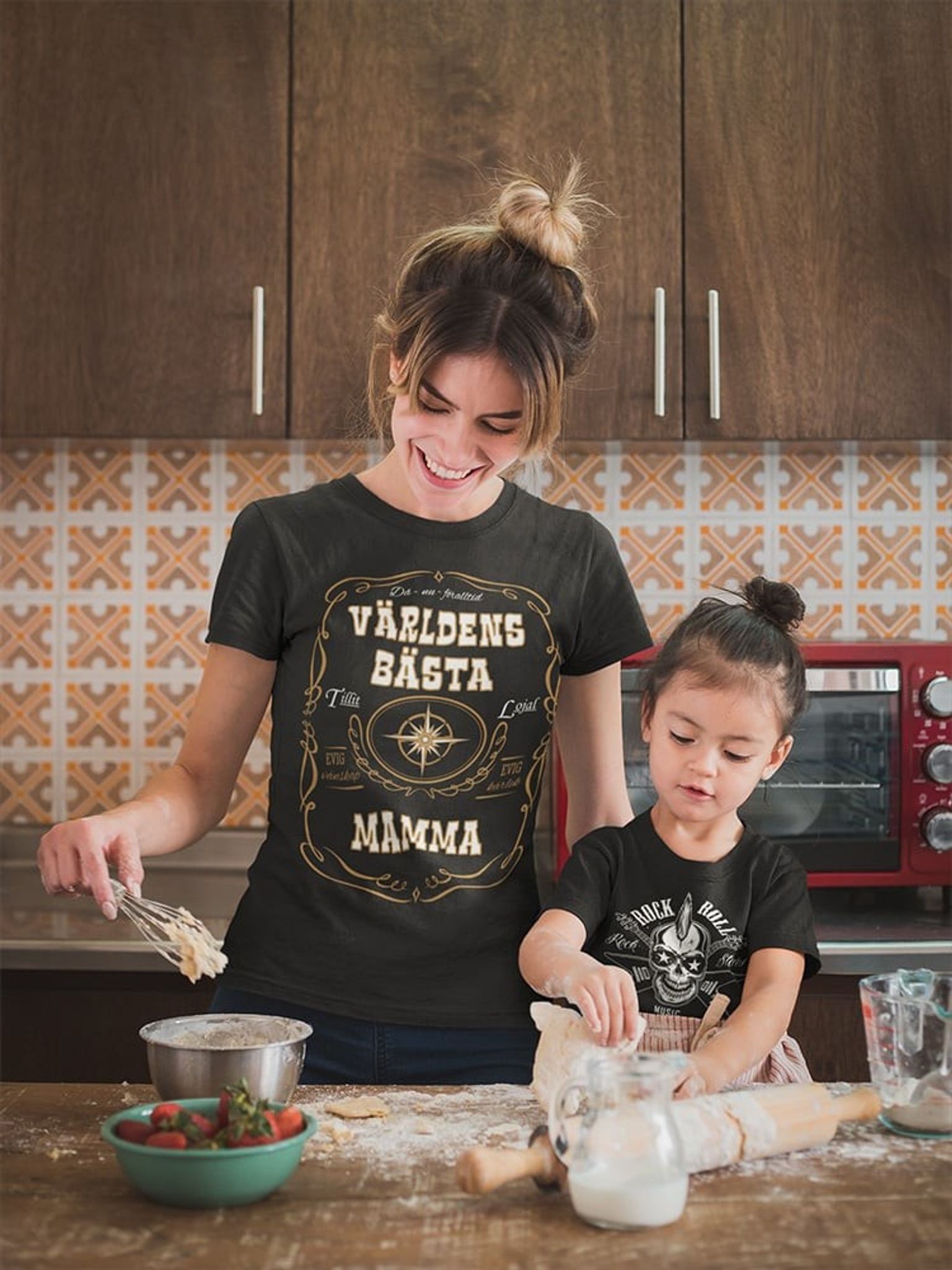 Designen på T-shirten är både inspirerande och hjärtlig, med text som lyder "Världens Bästa Mamma" omgivet av dekorativa element och orden "Då - nu - för alltid". Texten är tryckt i en elegant kombination av vitt och gyllene toner, vilket ger en varm och inbjudande känsla. Budskap som "Tillit", "Lojal" och "Evig vänskap, Evig kärlek" förstärker känslan av kärlek och uppskattning.