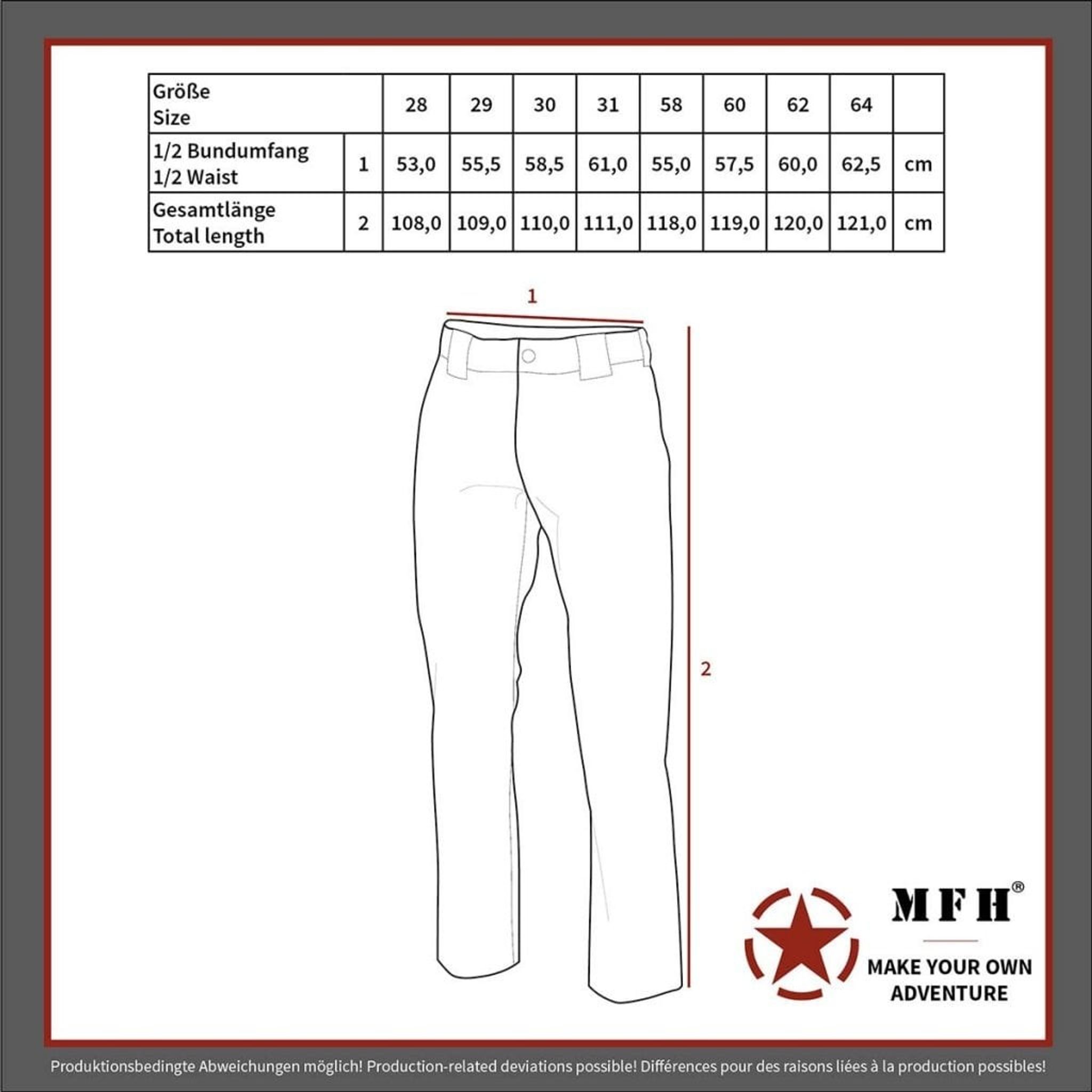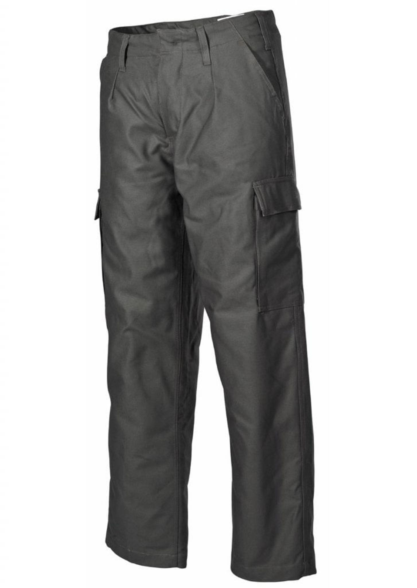 Byxorna har två benfickor med lock och knappar för säker förvaring av små föremål. Dessutom har de två fickor framtill och en bakficka med knappförslutning. De breda skärphällorna (ca 5 cm) är perfekta för att passa BW-bälten.