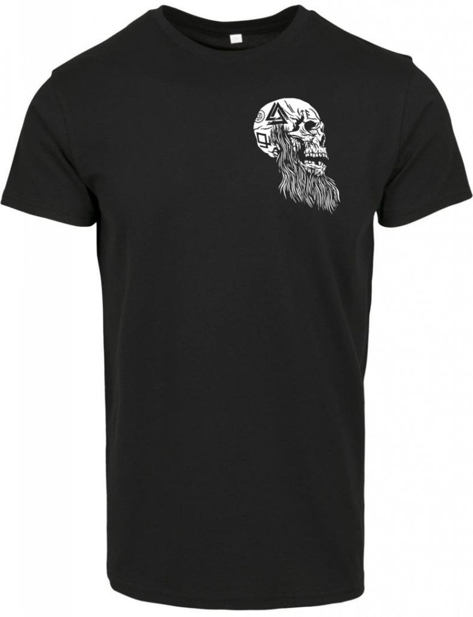 En T-shirt i skönt bomullstyg och med en gammal vikingaskalle tryckt på bröstet. Skallen har bland annat fått valknut och odal-runa ingraverat i kraniumet.