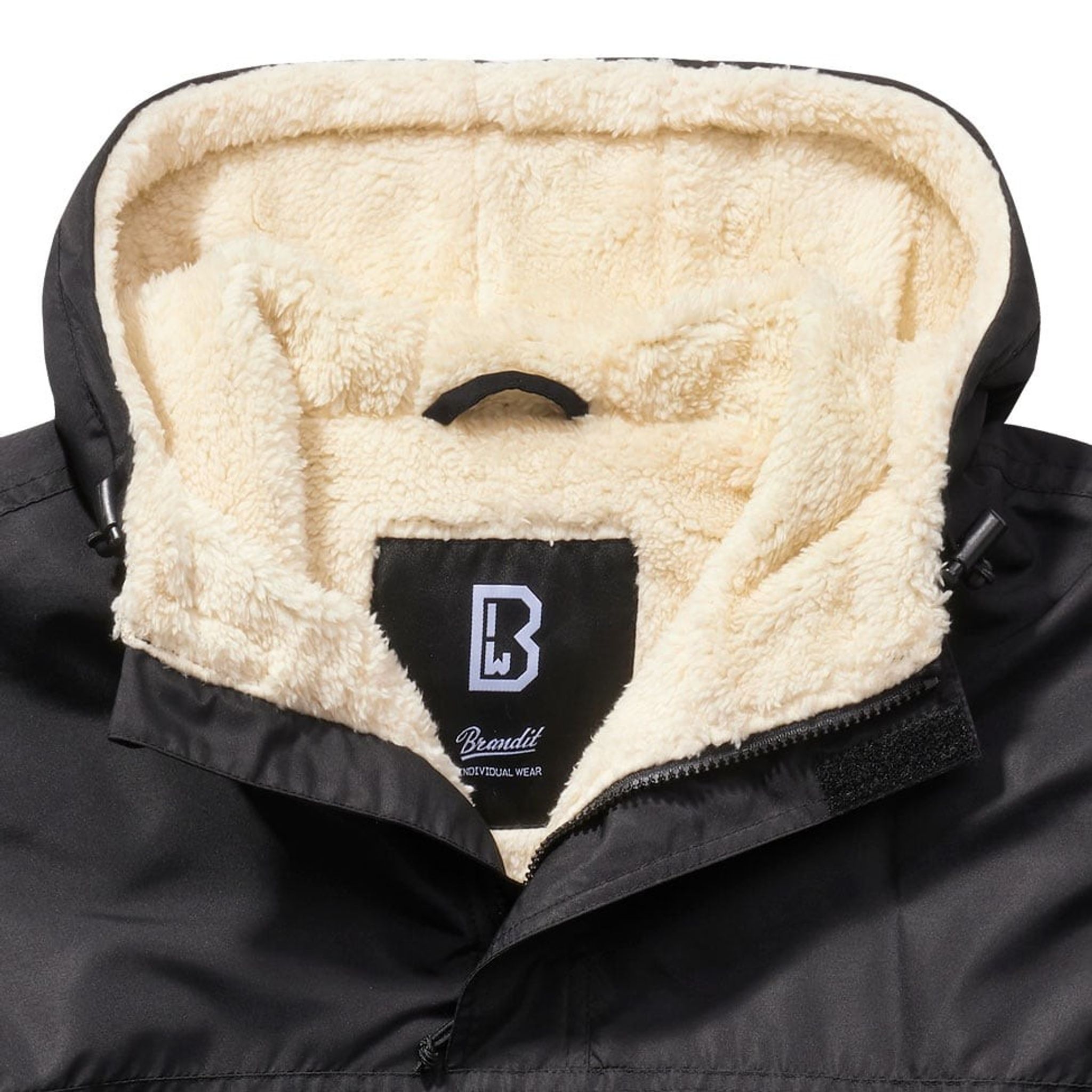 En vind- och vattenavvisande jacka som är fodrad med varm teddypäls. Även huvan är fodrad av teddypälsen och har även dragsko med stopp.