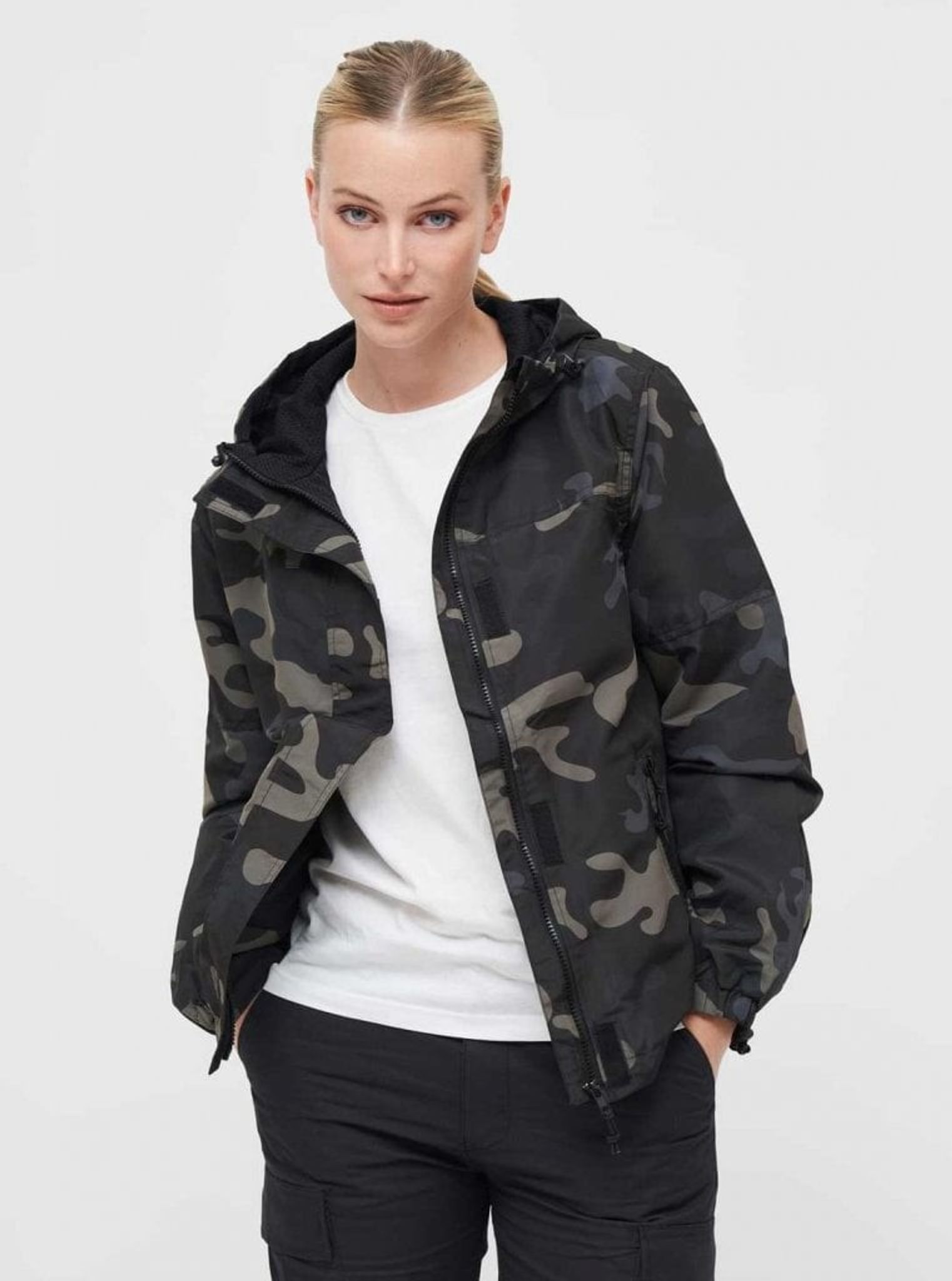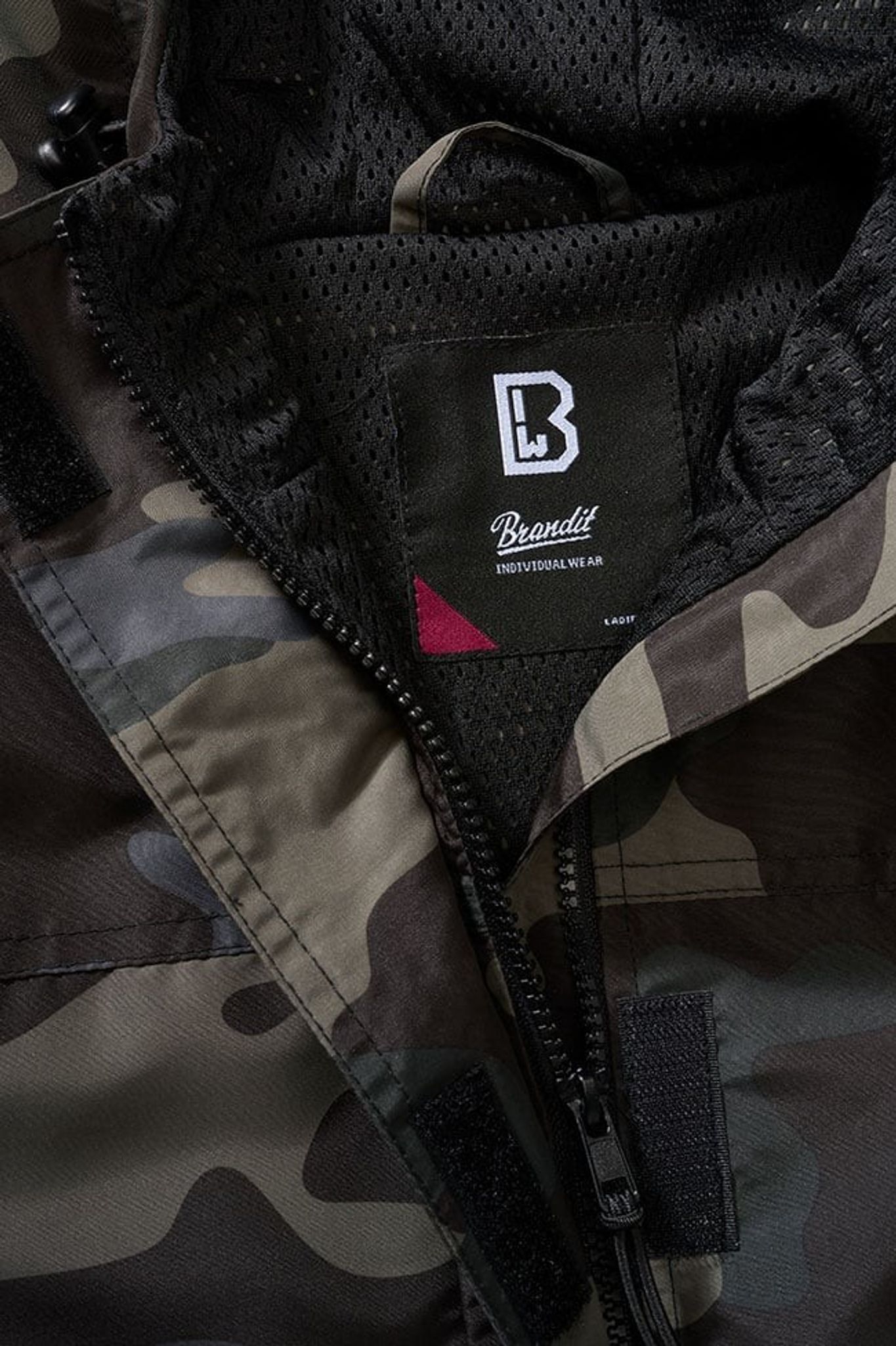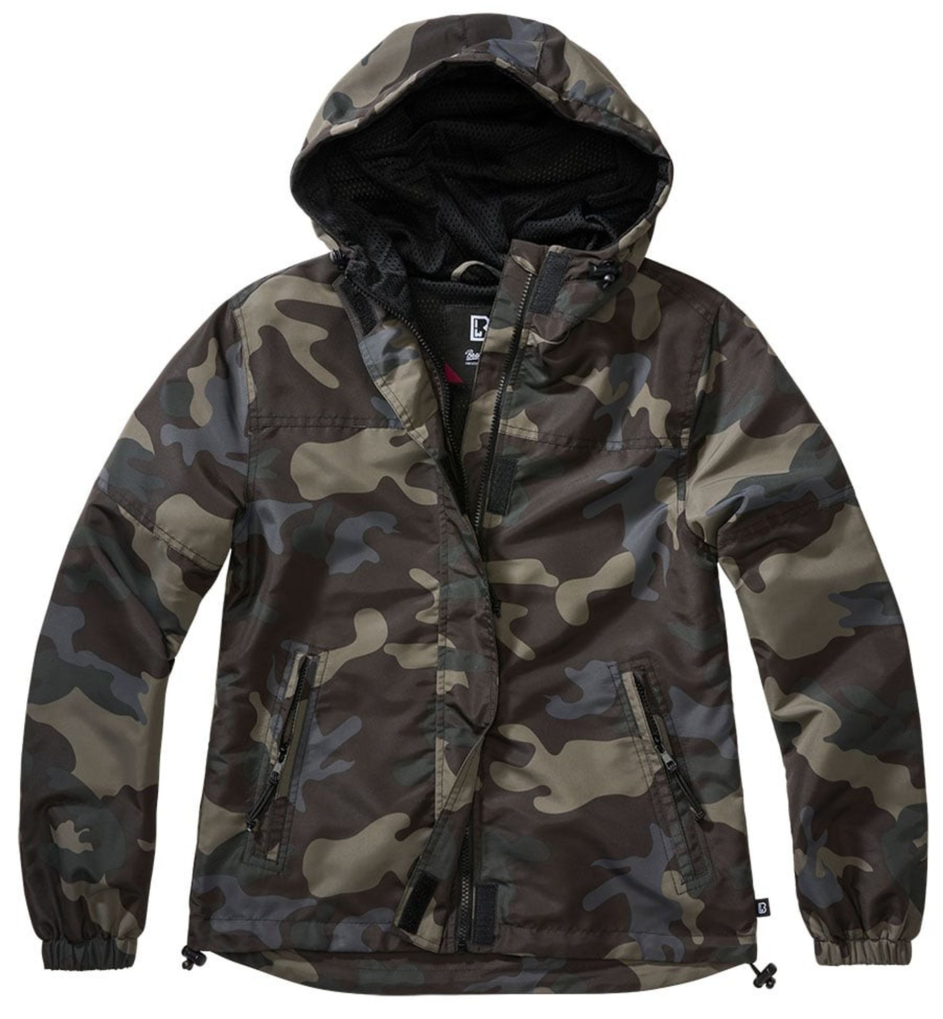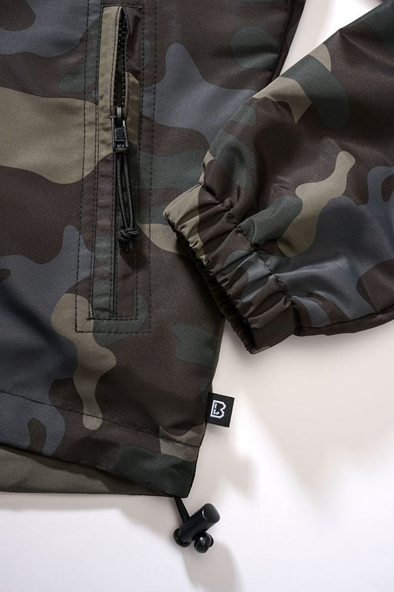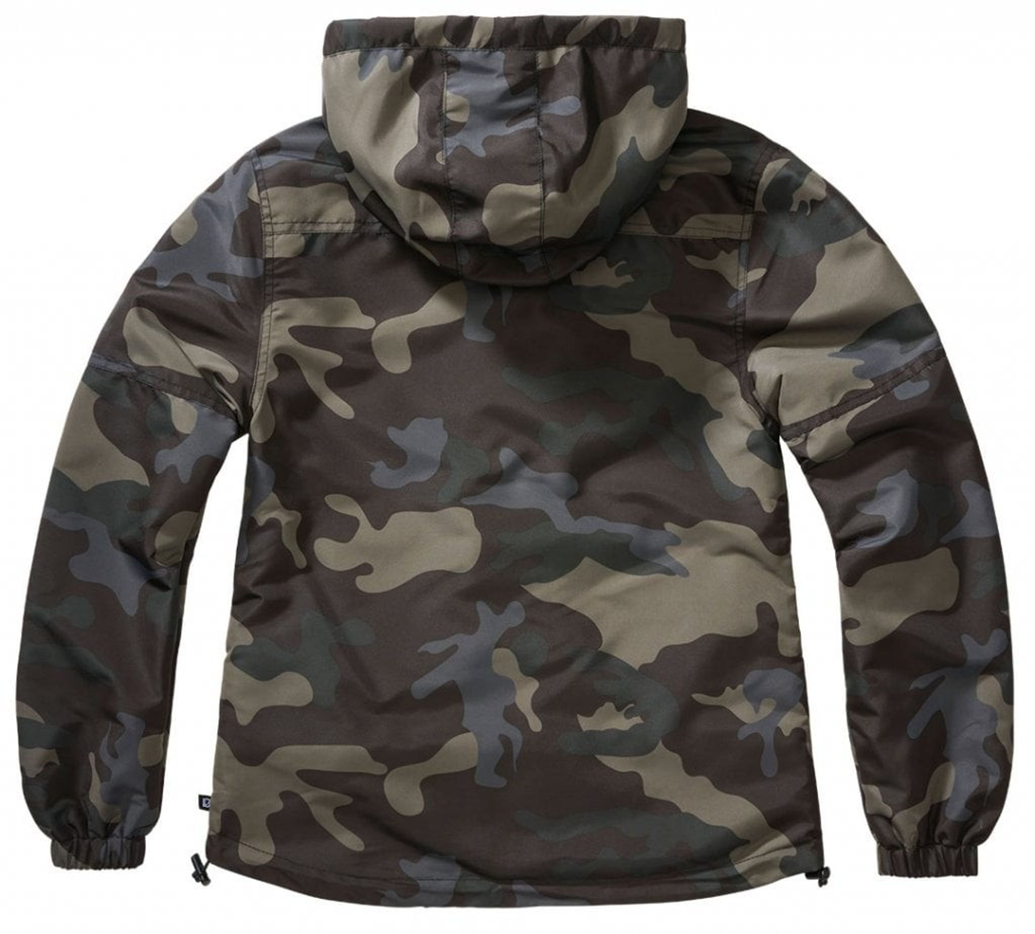 En vindjacka i diskreta darkcamo och med ett tyg som är både vatten- och vindavvisande. Jackan är försedd med elastiska muddar i ärmsluten och dragsko i huvan.