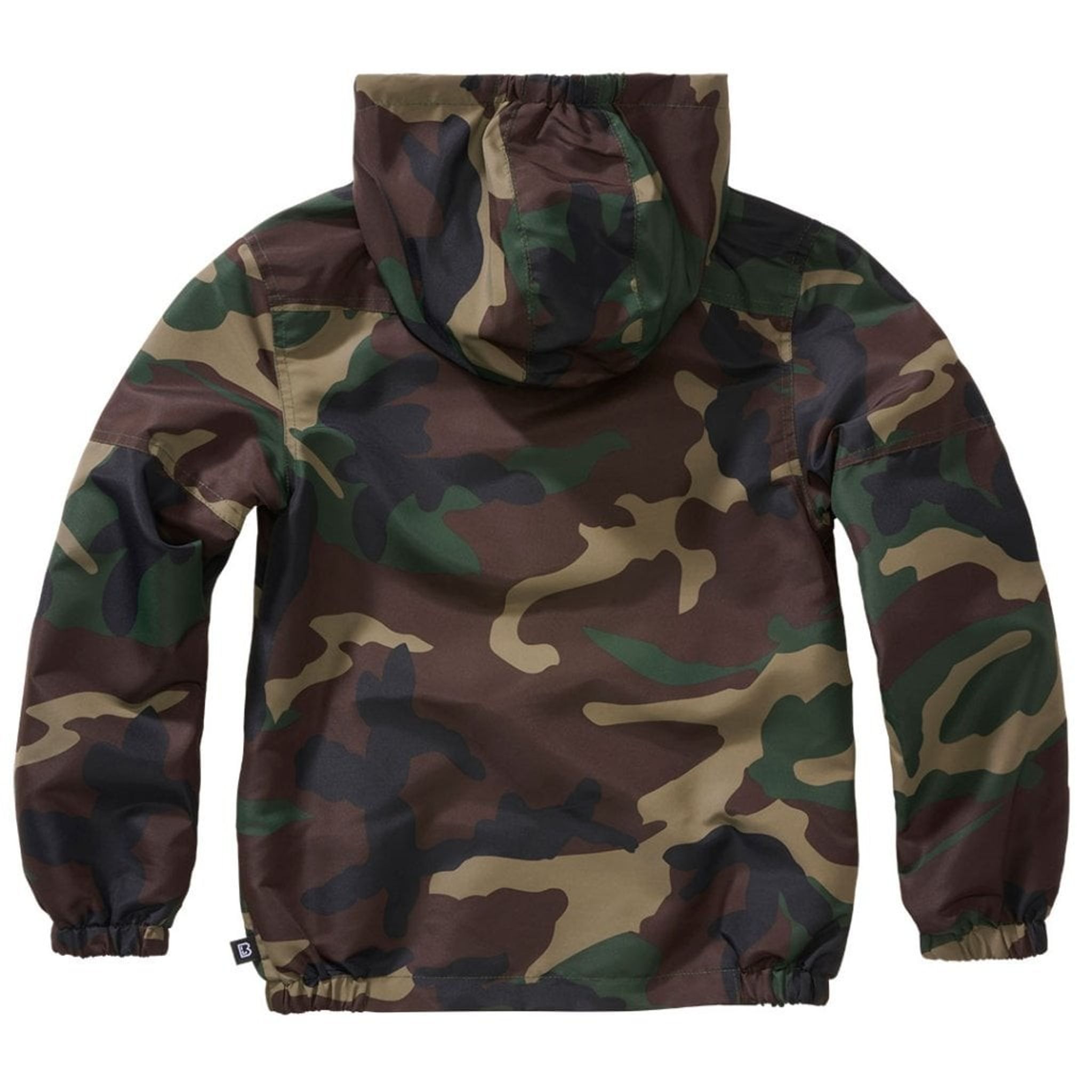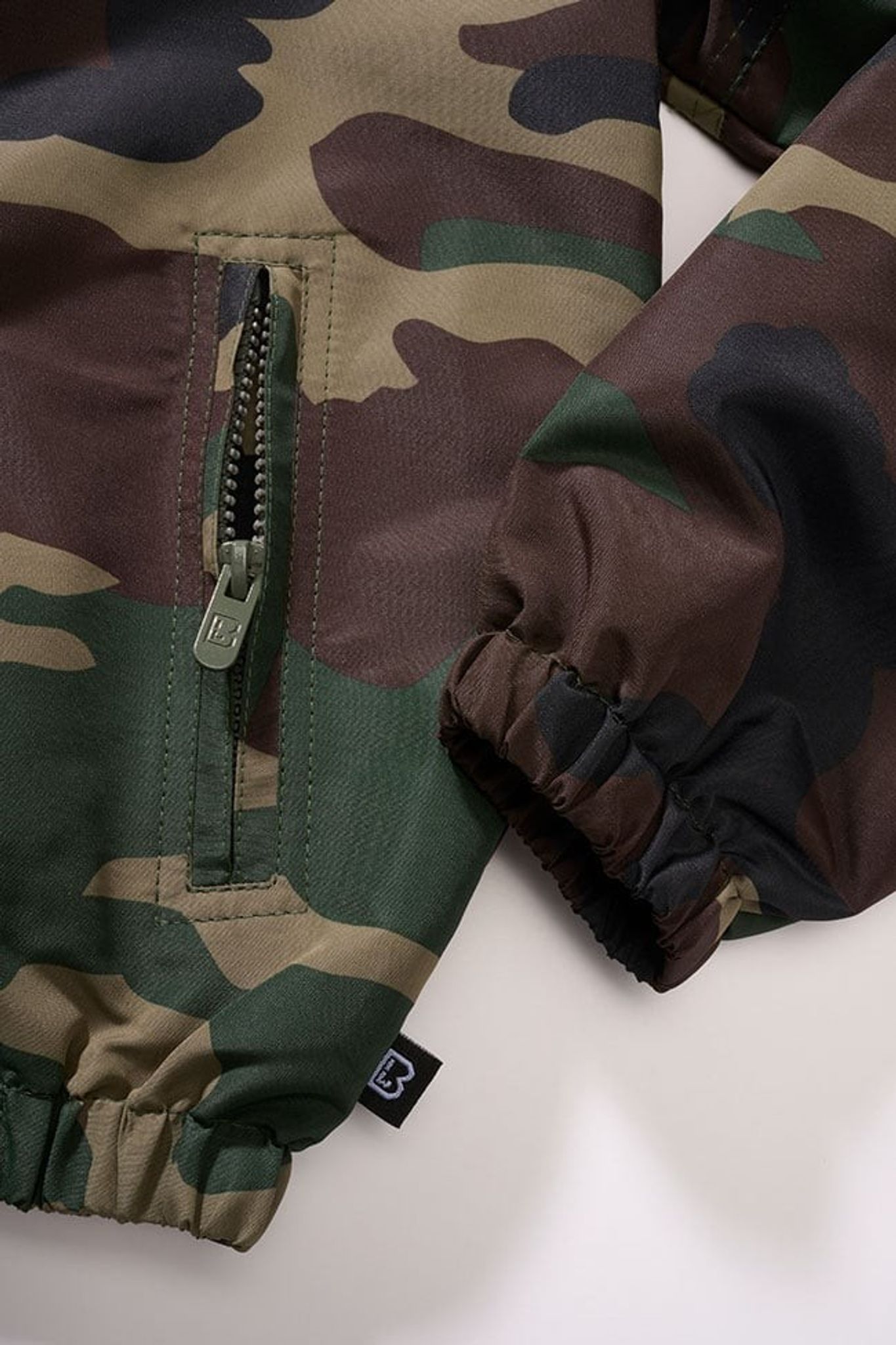 En vindjacka i woodland-kamouflage och med ett olivgrönt foder. Vindjackan är tillverkad i ett både vind- och vattenresistent lättviktstyg. Meshfodret på insidan har en god andningsförmåga.