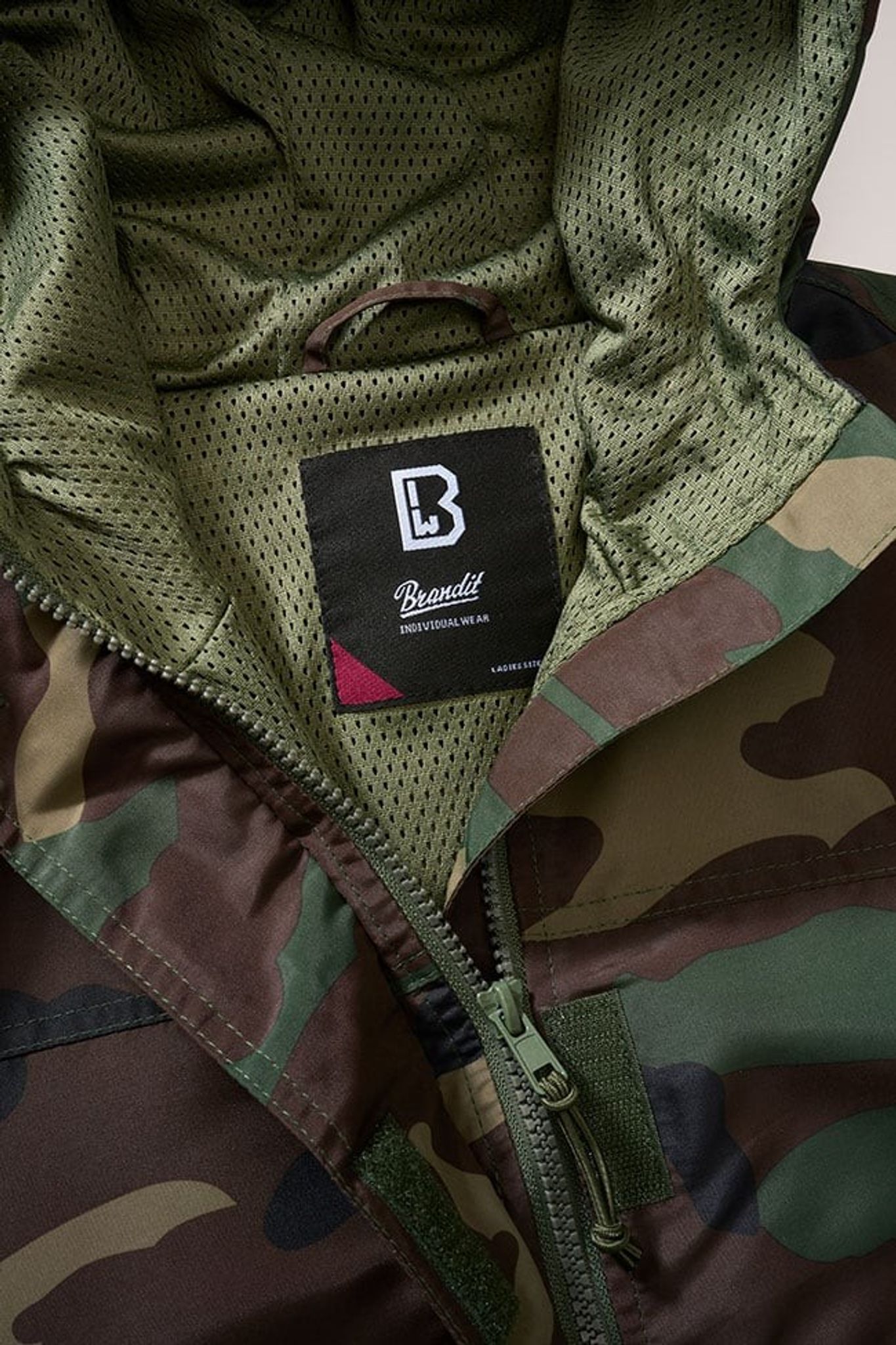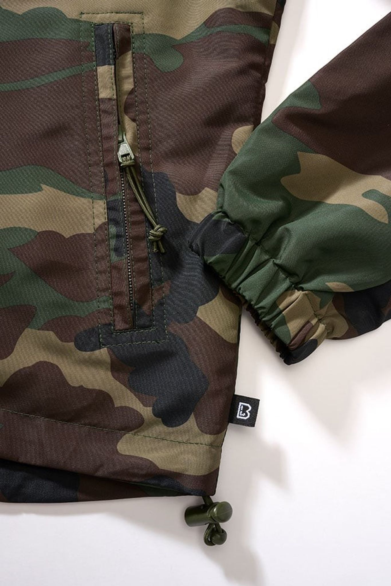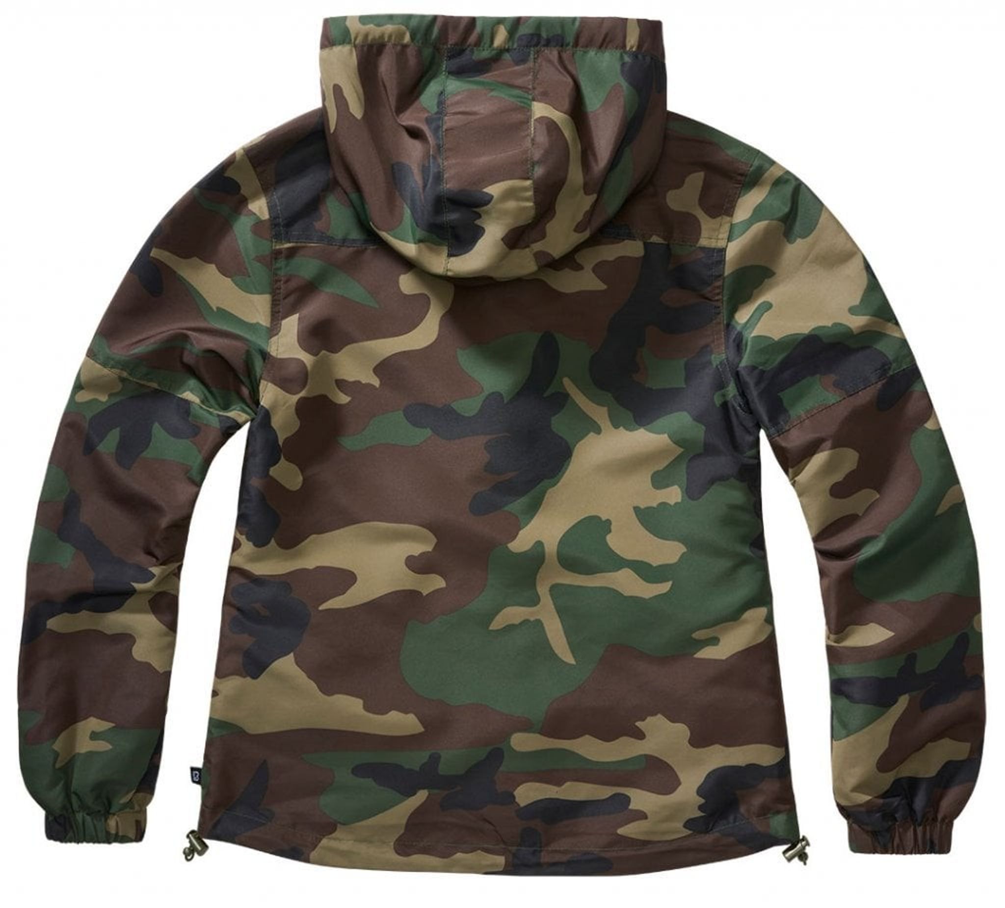 Vindjacka i klassiska woodland-kamouflaget och med ett lättviktstyg som står sig bra både mot vind och vatten. Jackan har elastiska muddar i ärmsluten och dragsko i huvan.