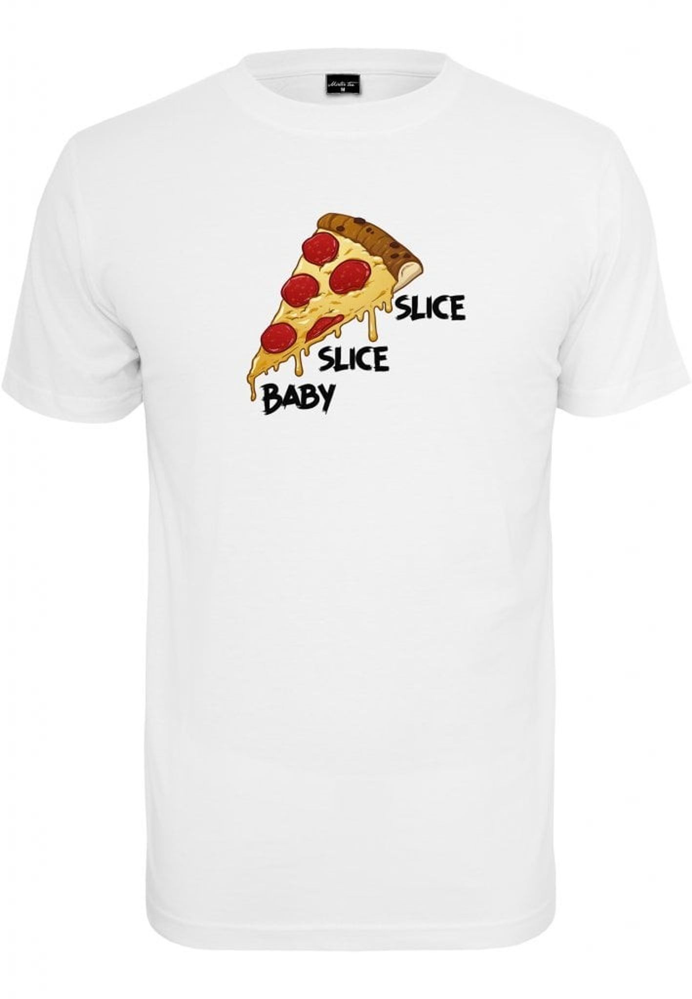 - Mönster: En helvit t-shirt med en bild fram som föreställer en pizzabit med ost och tomater och texten "slice slice baby".