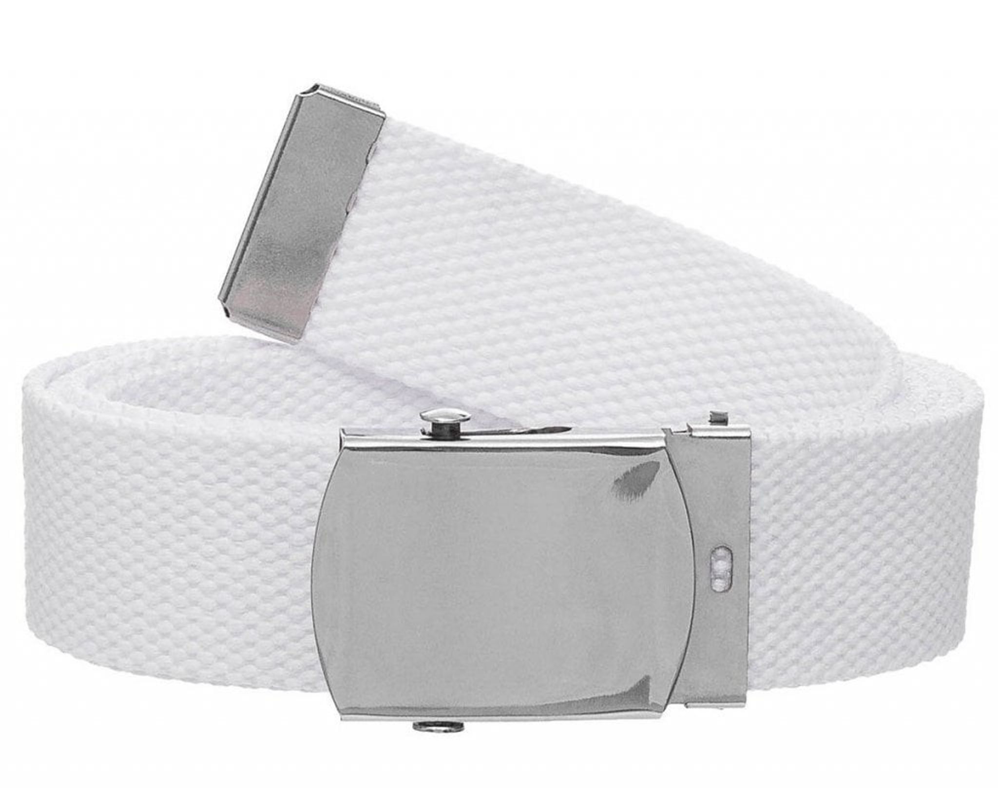 Ett tygbälte i vitt tyg och blankt metallspänne. Längden är justerbar upp till 130 cm.