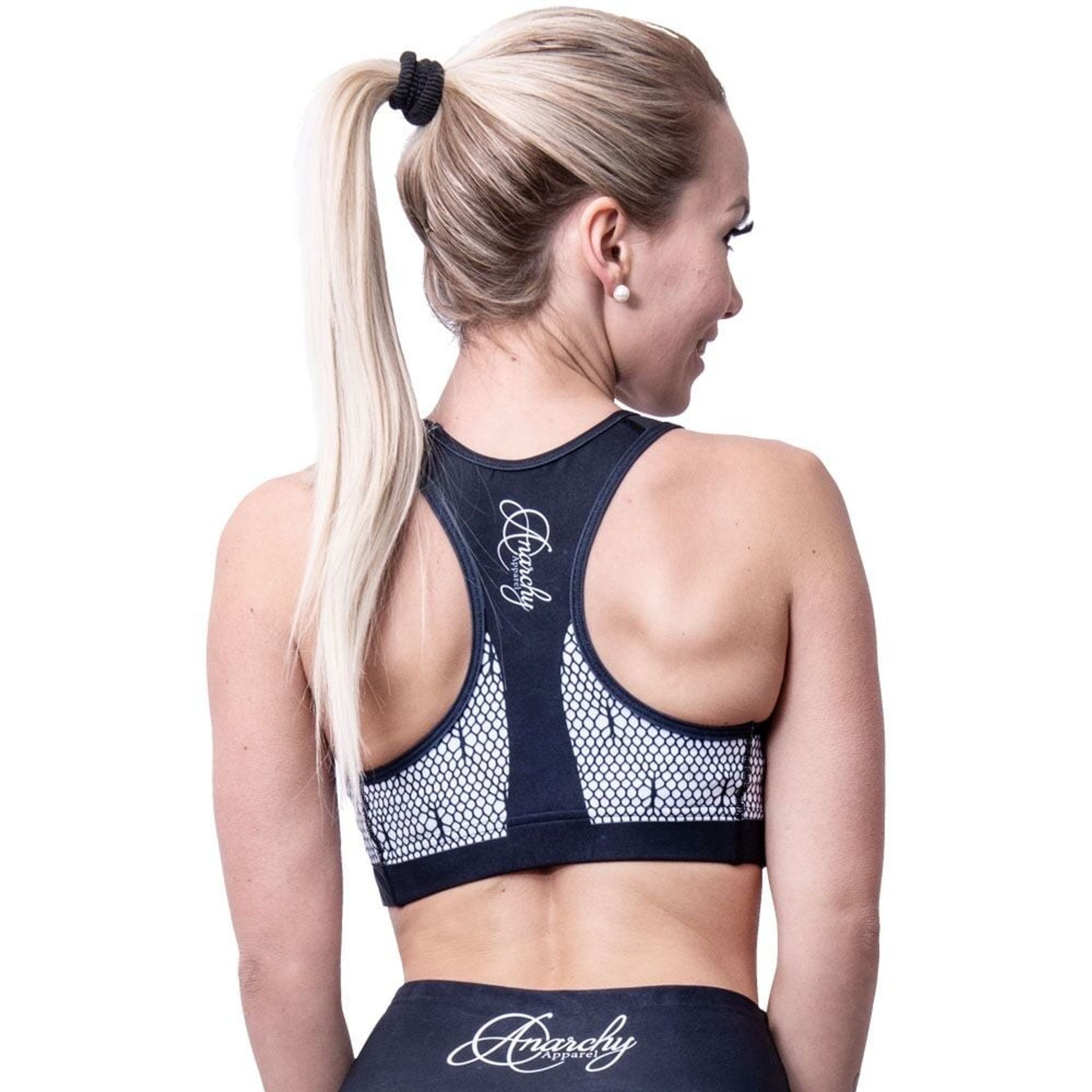 En rikgit snygg sport BH som föreställer läder med nät mellan läderdetaljerna. Den passar perfekt med tightsen som går i samma mönster.