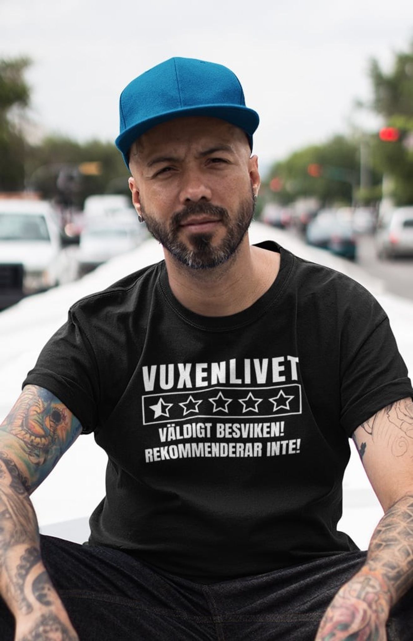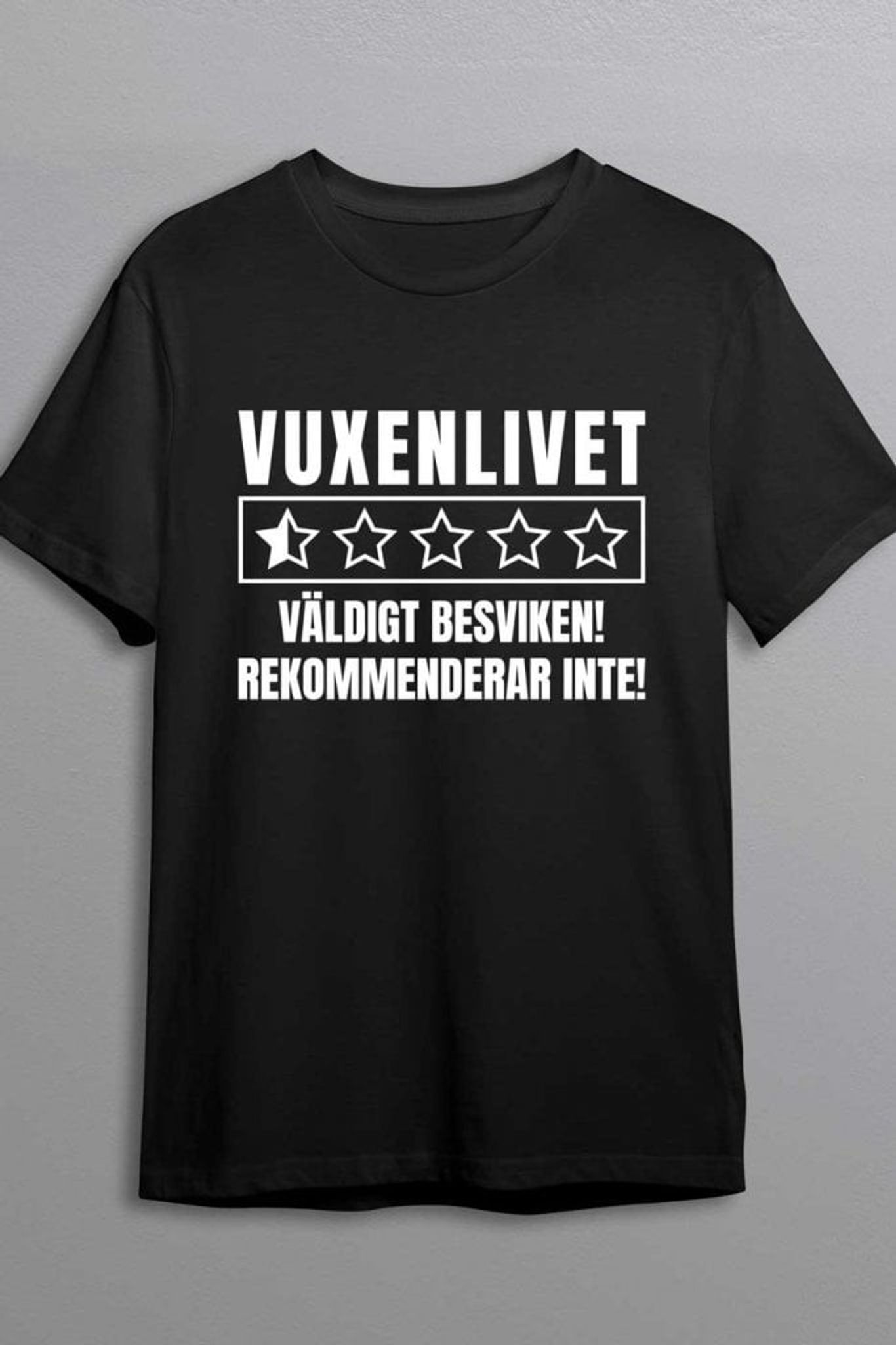 Är du besviken på vuxenlivets brist på raster och godkända ursäkter för för att strunta i alla måsten? Längtar du tillbaka till dagarna då det största beslutet du behövde fatta var vilken glass som skulle bli dagens andra efterrätt? Då har vi precis rätt Tisha för dig! Vår "Vuxenlivet - Väldigt Besviken, Rekommenderar Inte" tee är ett ironiskt statement till alla som kände sig lurade av de blanka löftena från "när du blir stor".