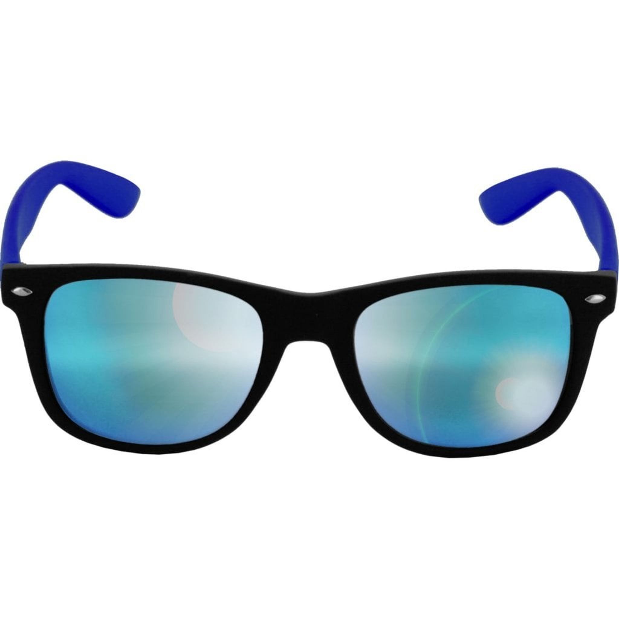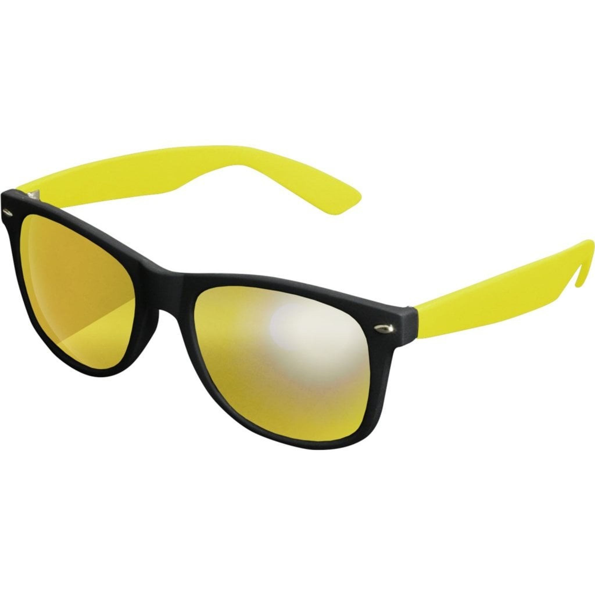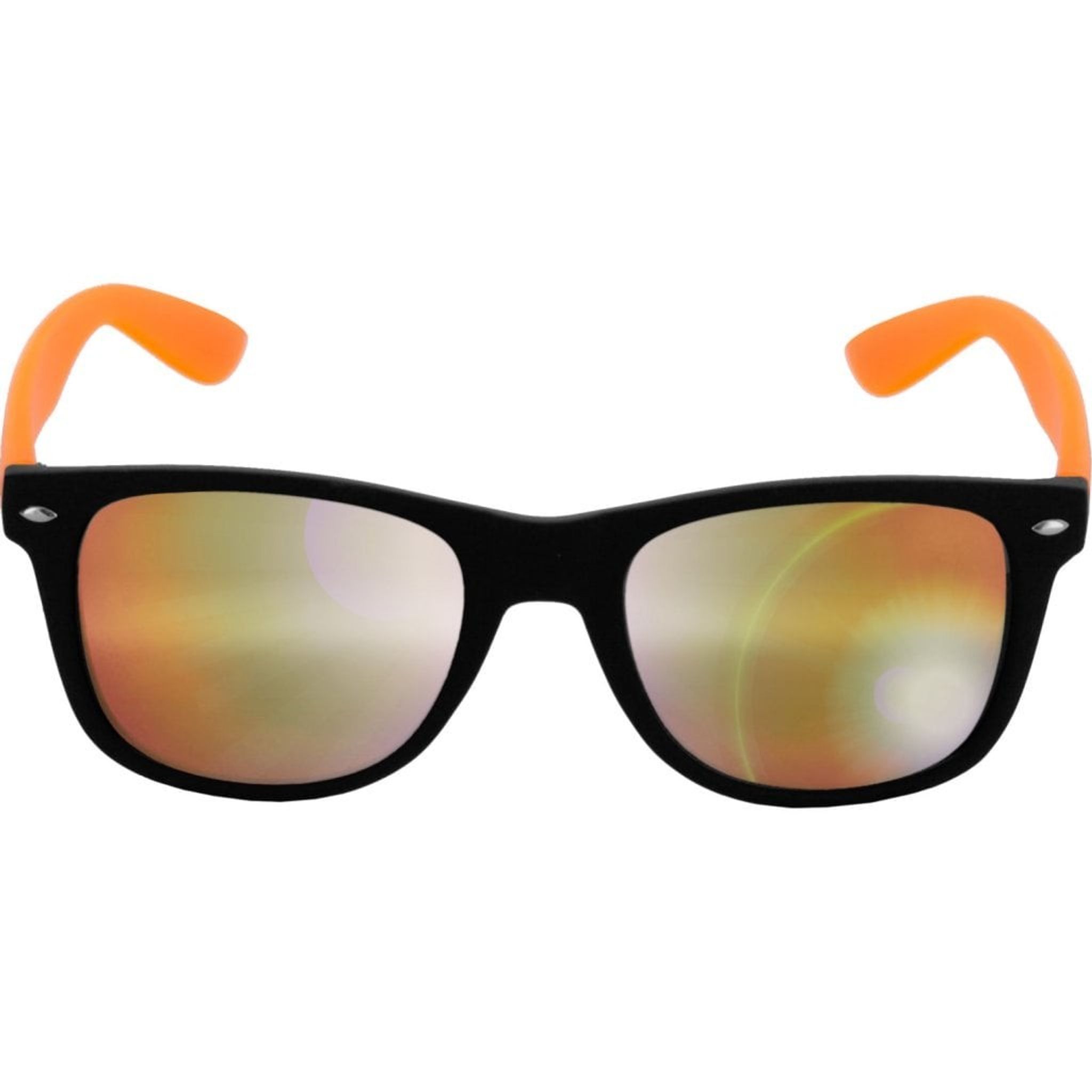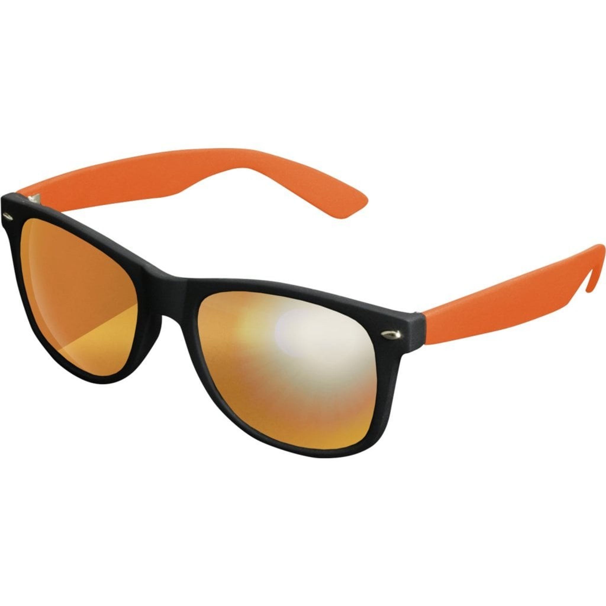 Solglasögonen har spegelglas och del av bågarna i matchande färg och ramen runt glasen i svart.