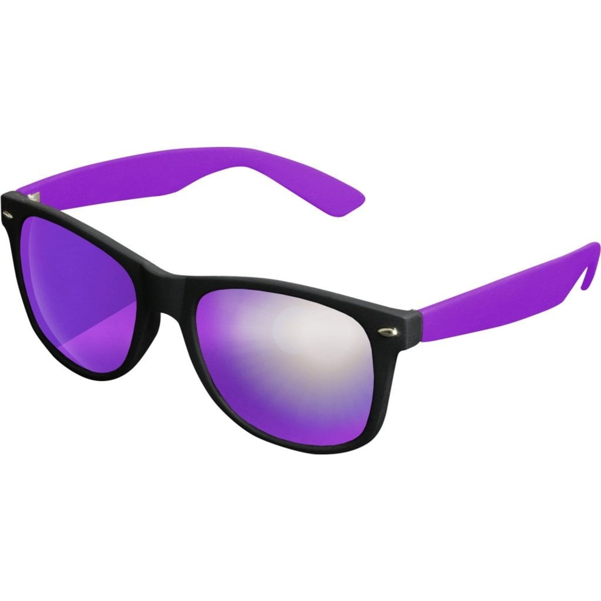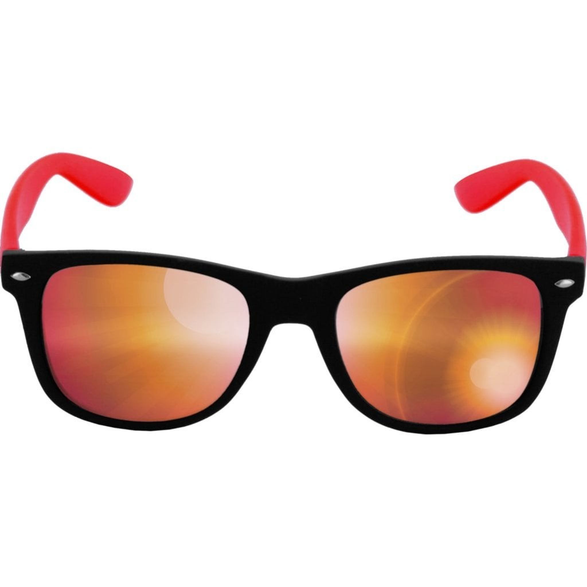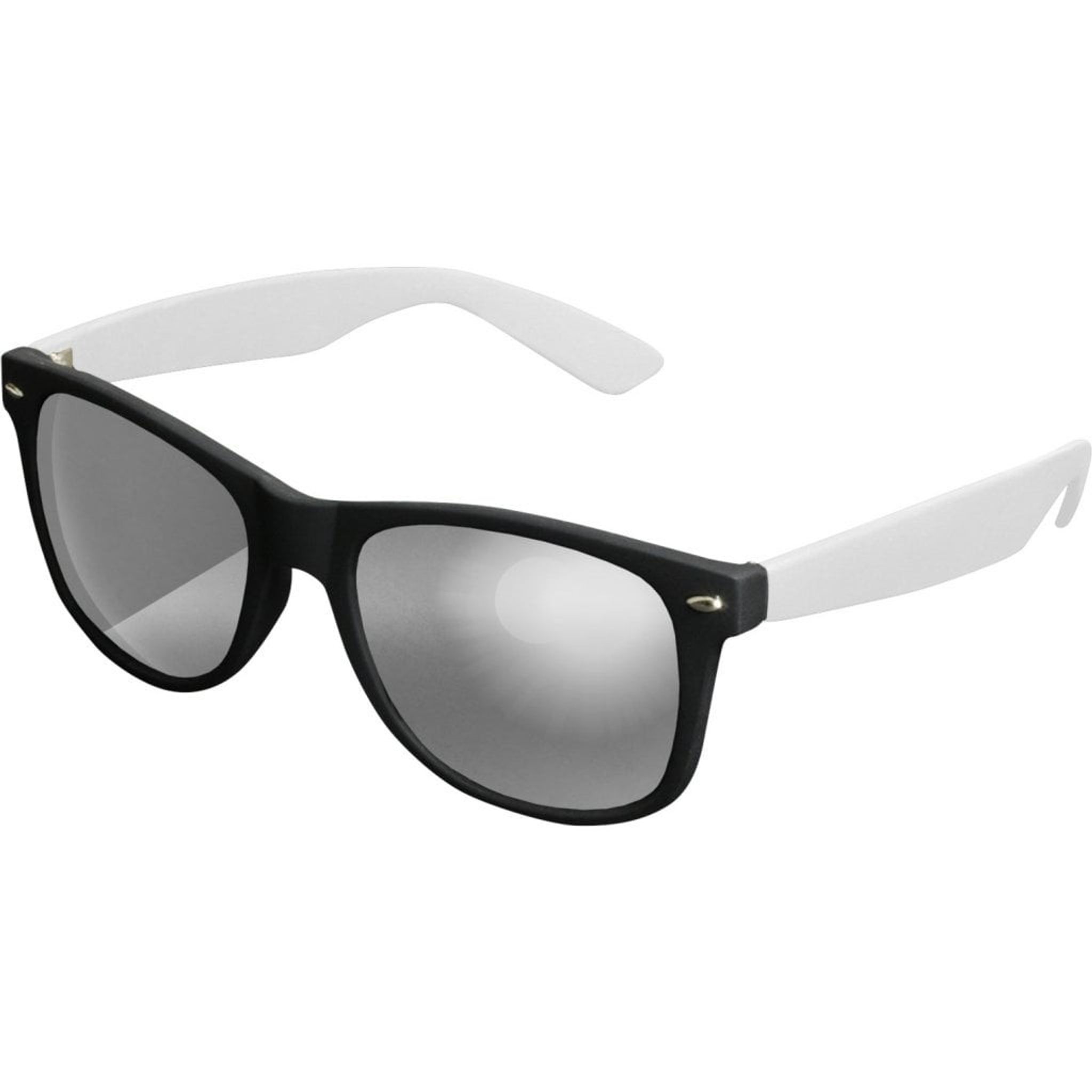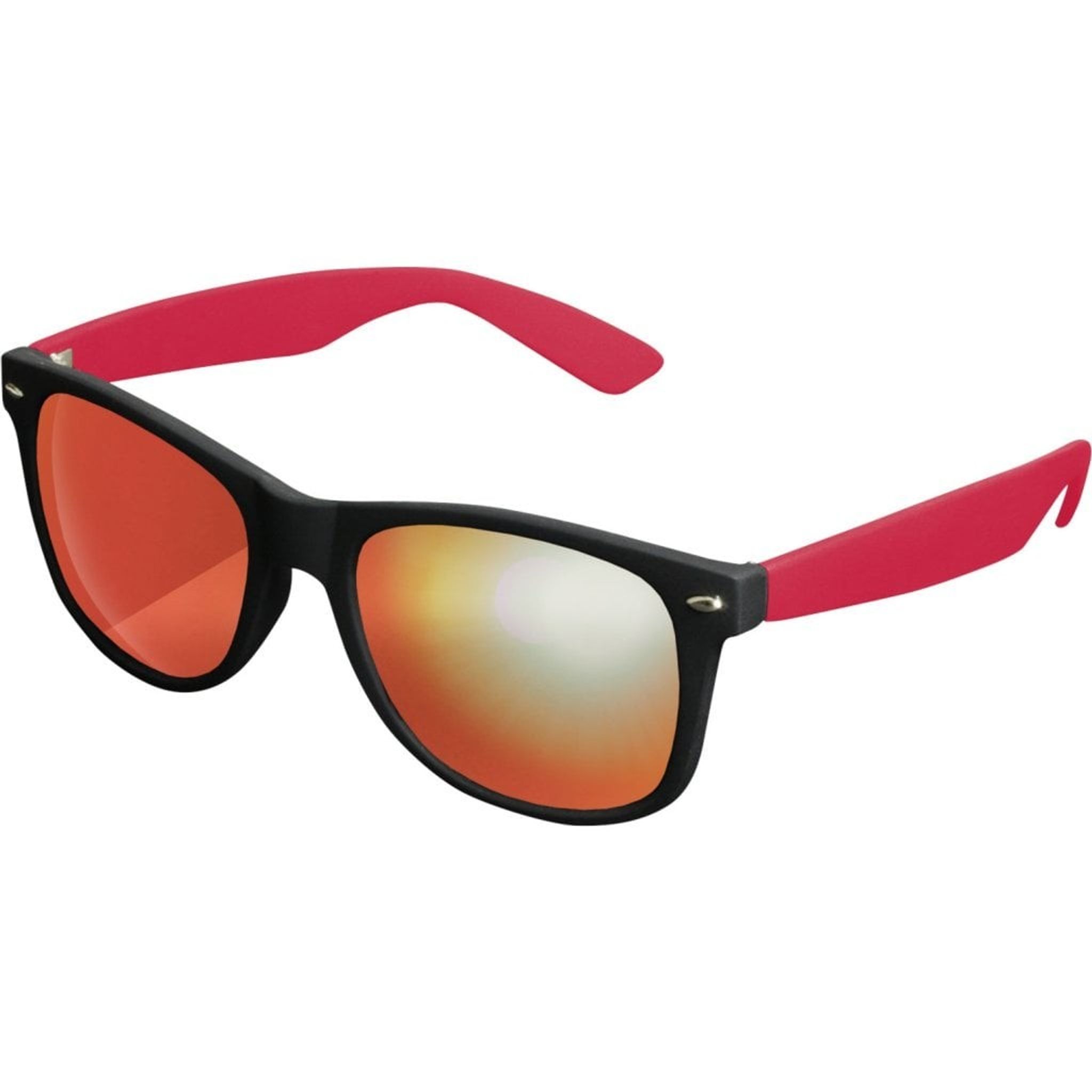 Solglasögonen har spegelglas och del av bågarna i matchande färg och ramen runt glasen i svart.