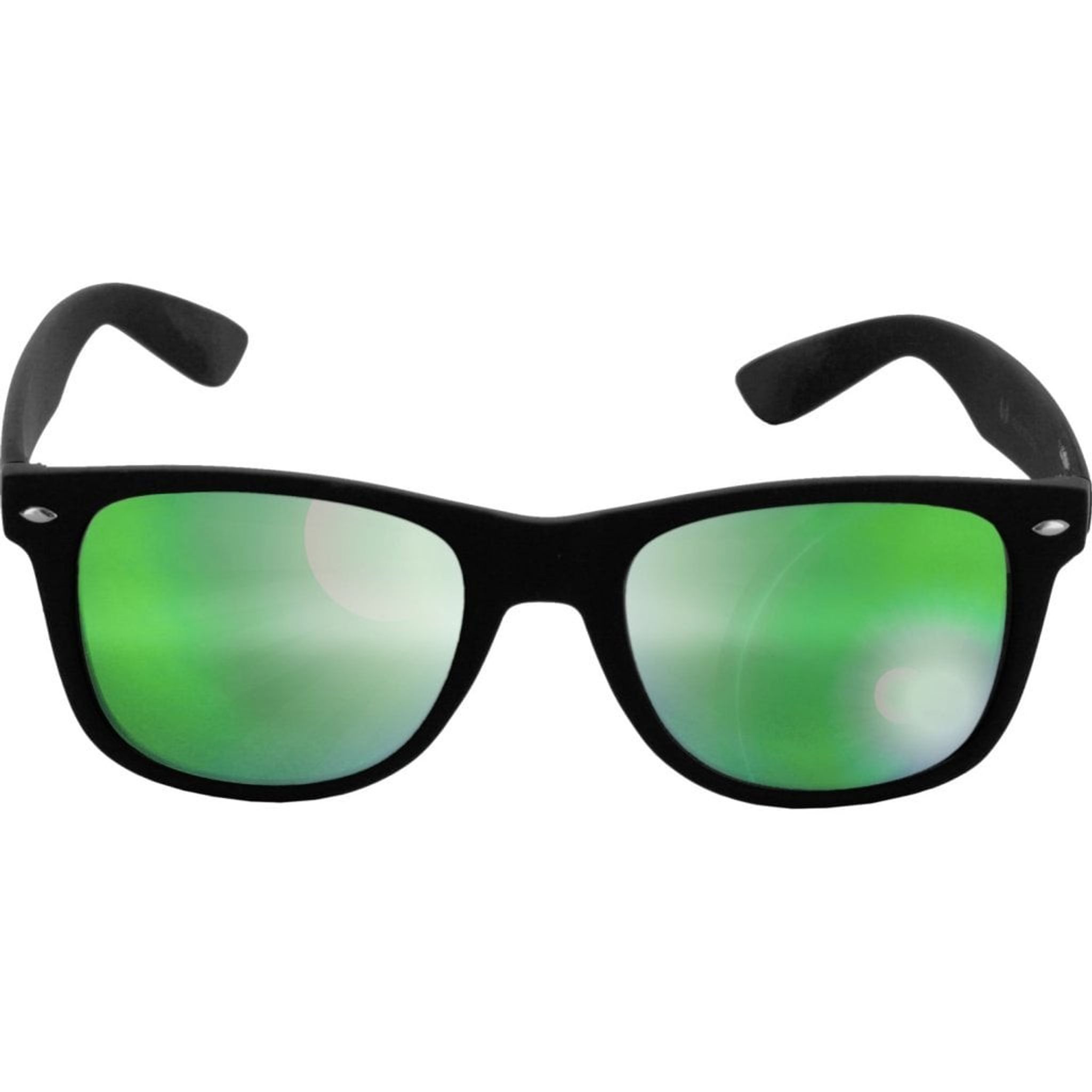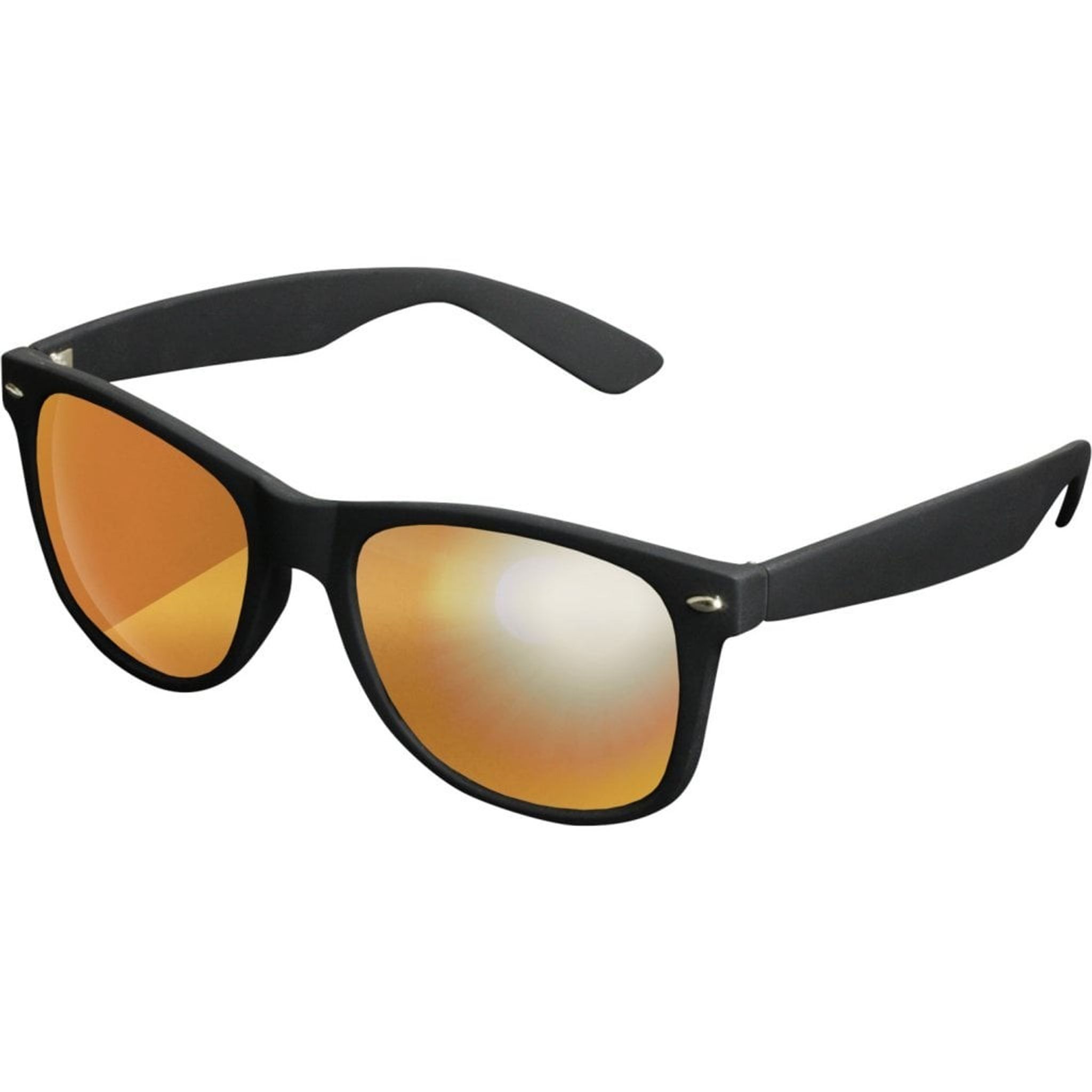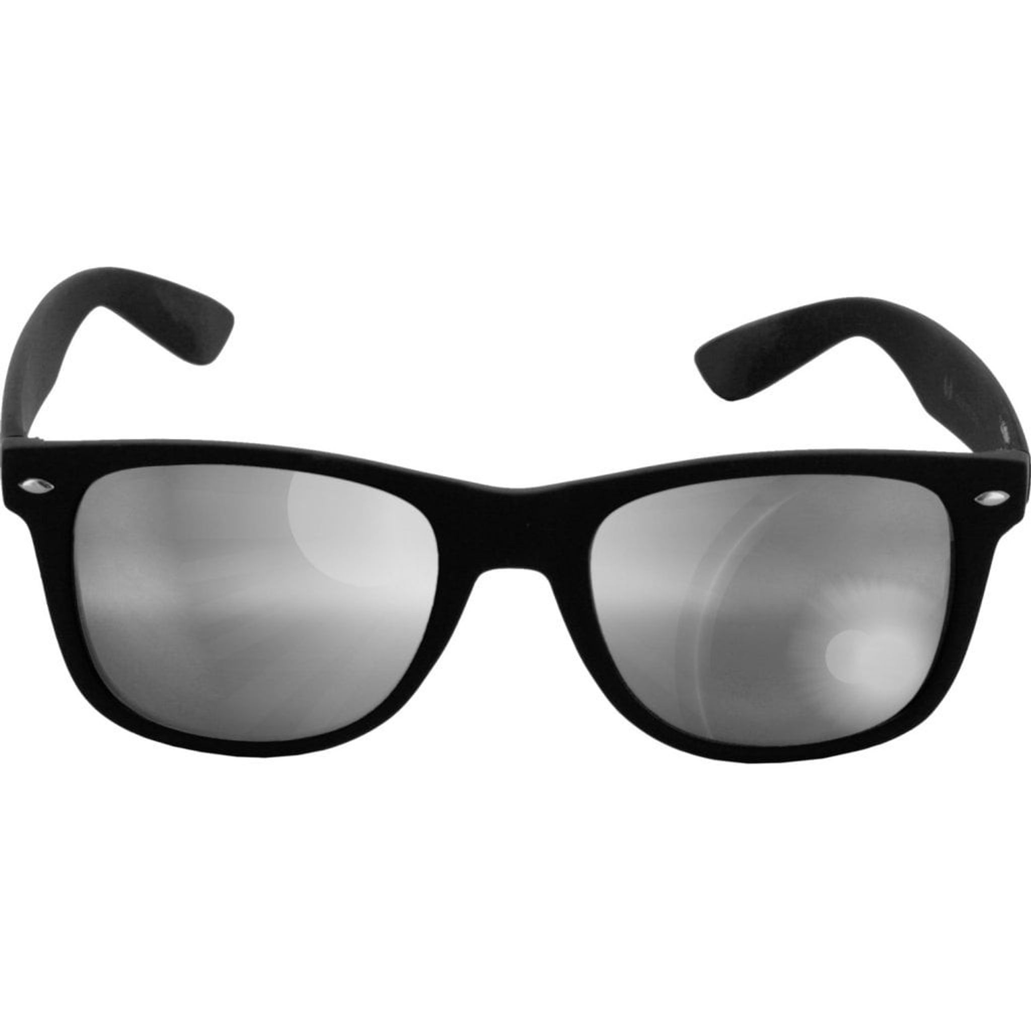 Solglasögonen har svarta bågar med spegelglas.