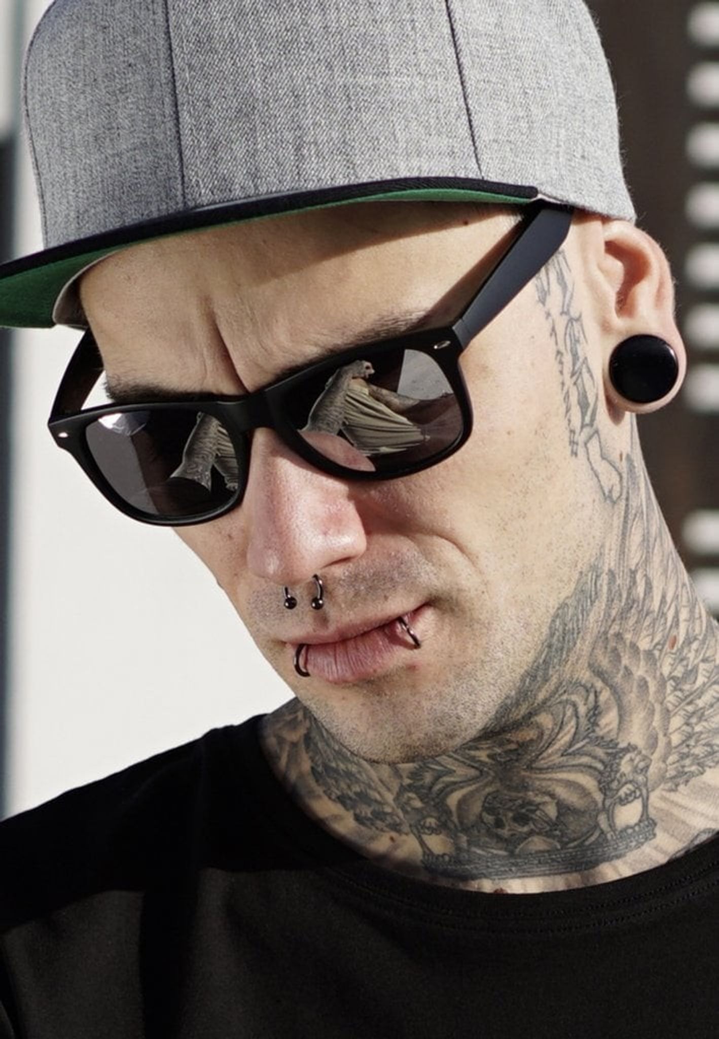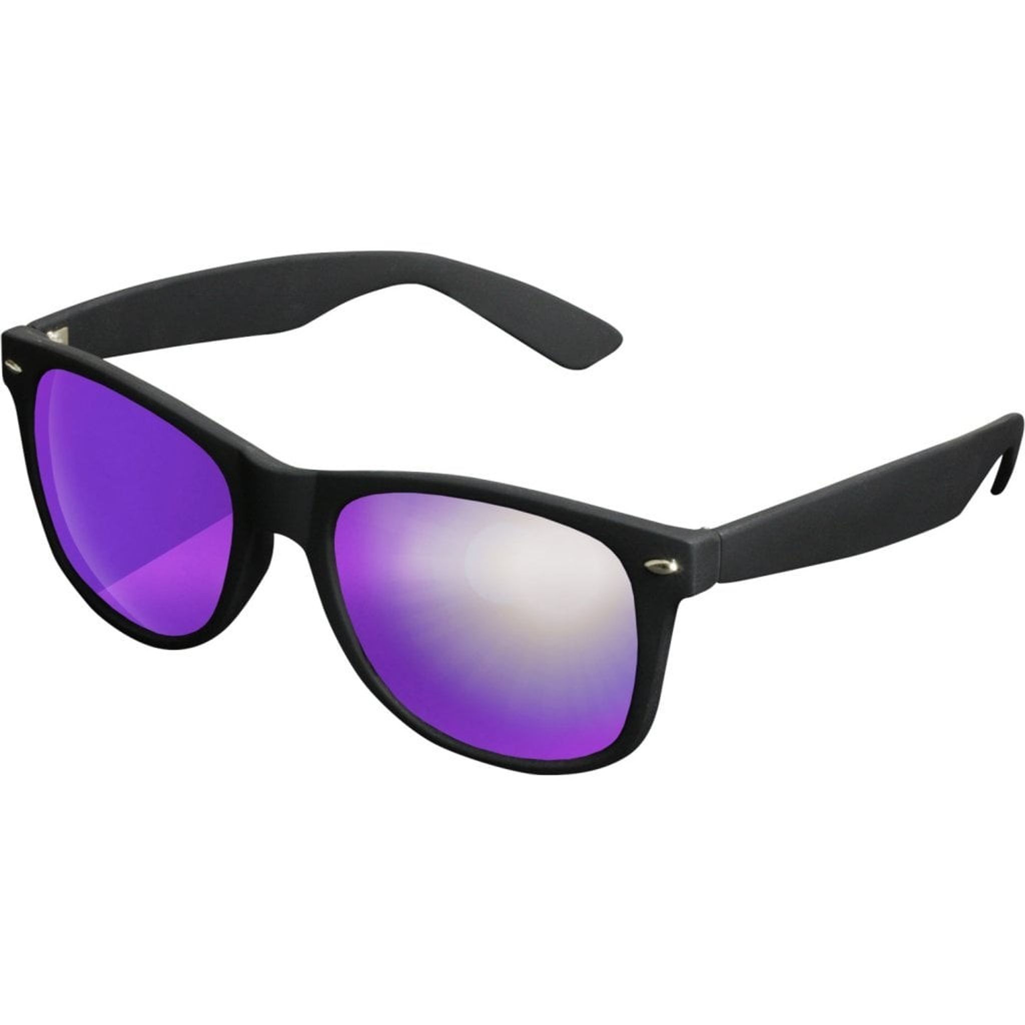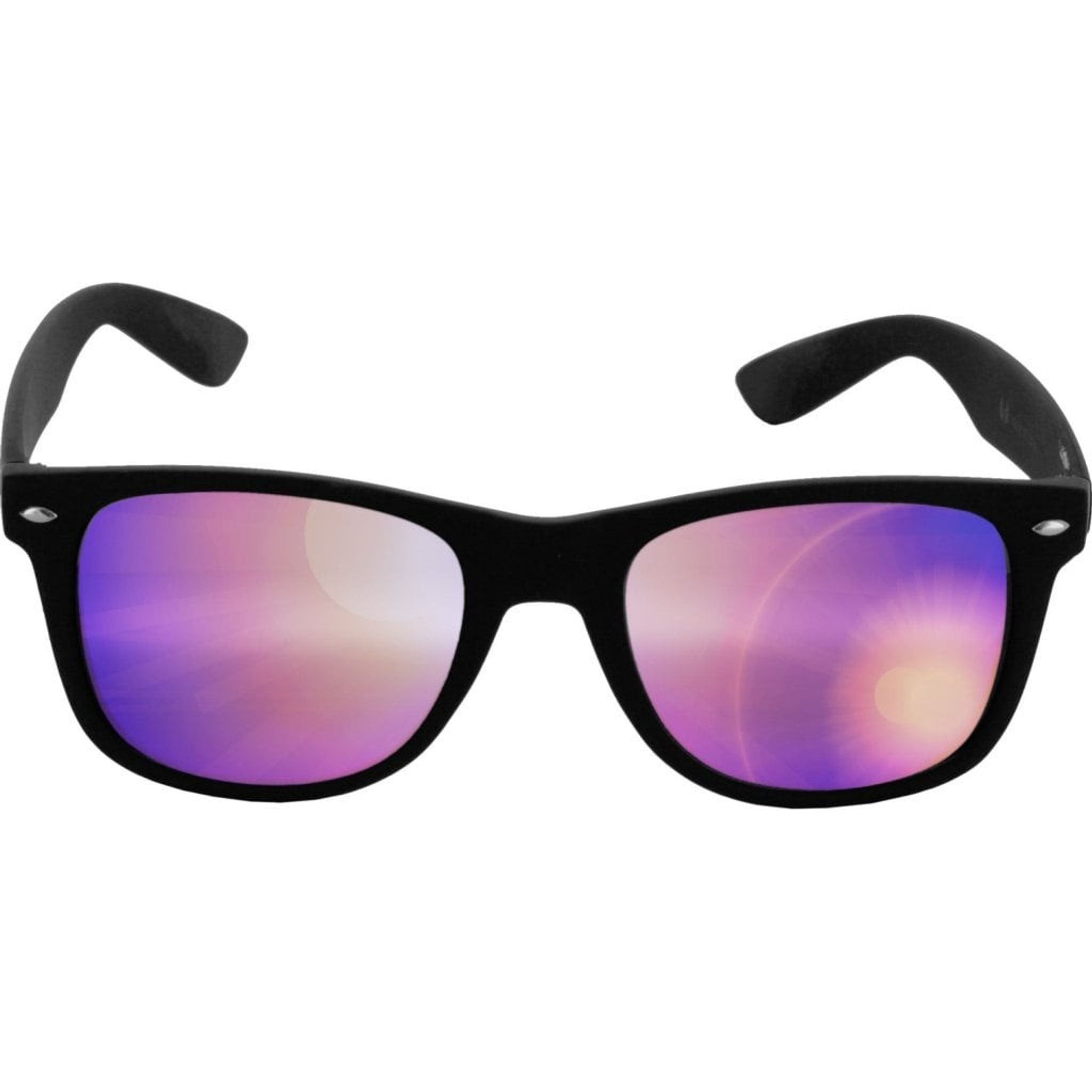 Solglasögonen har svarta bågar med spegelglas.
