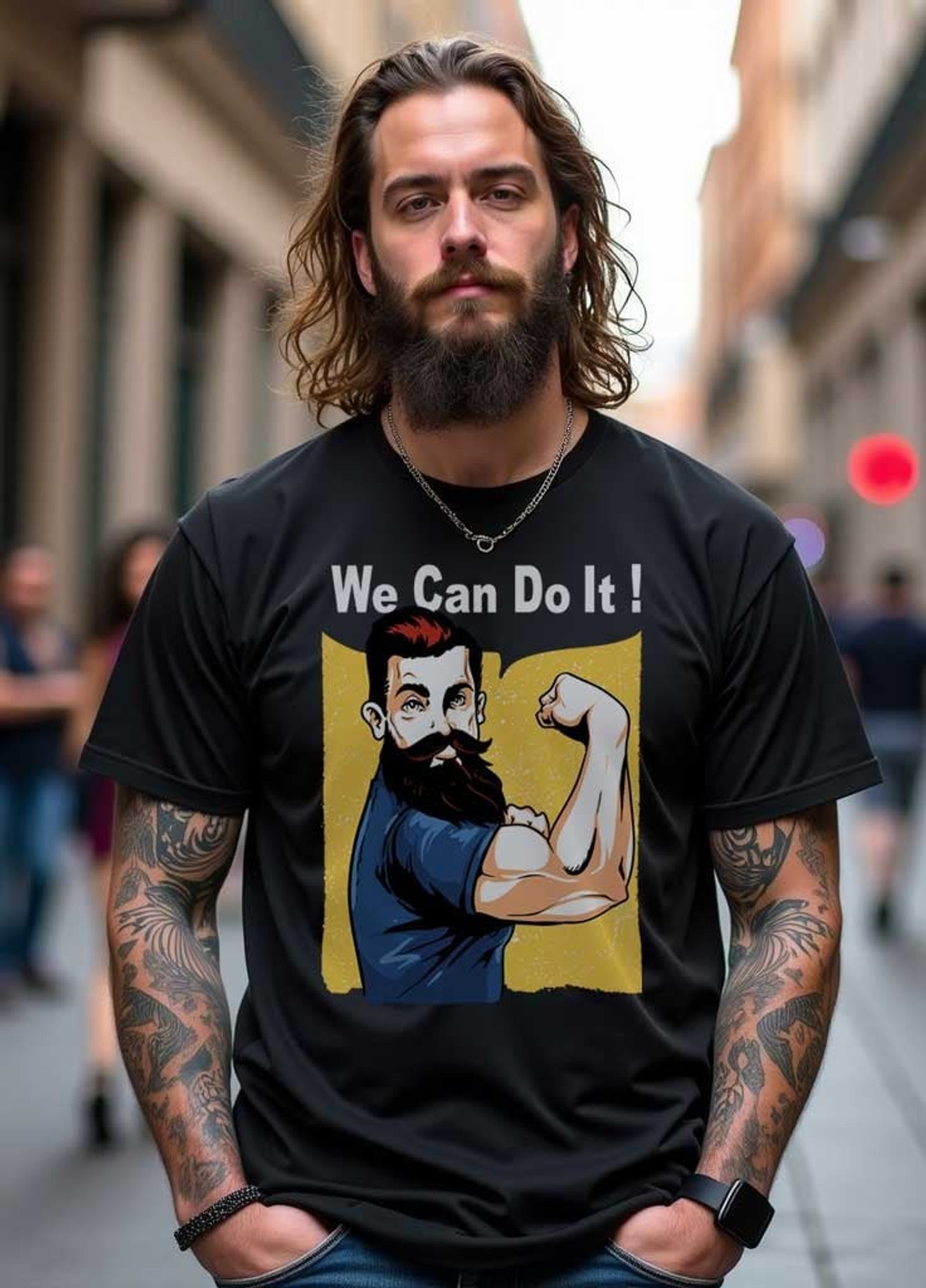 Detta är en remake på originalet från 1943 där vi istället ser ett vackert skägg spänna musklerna och säga "We can do it!"