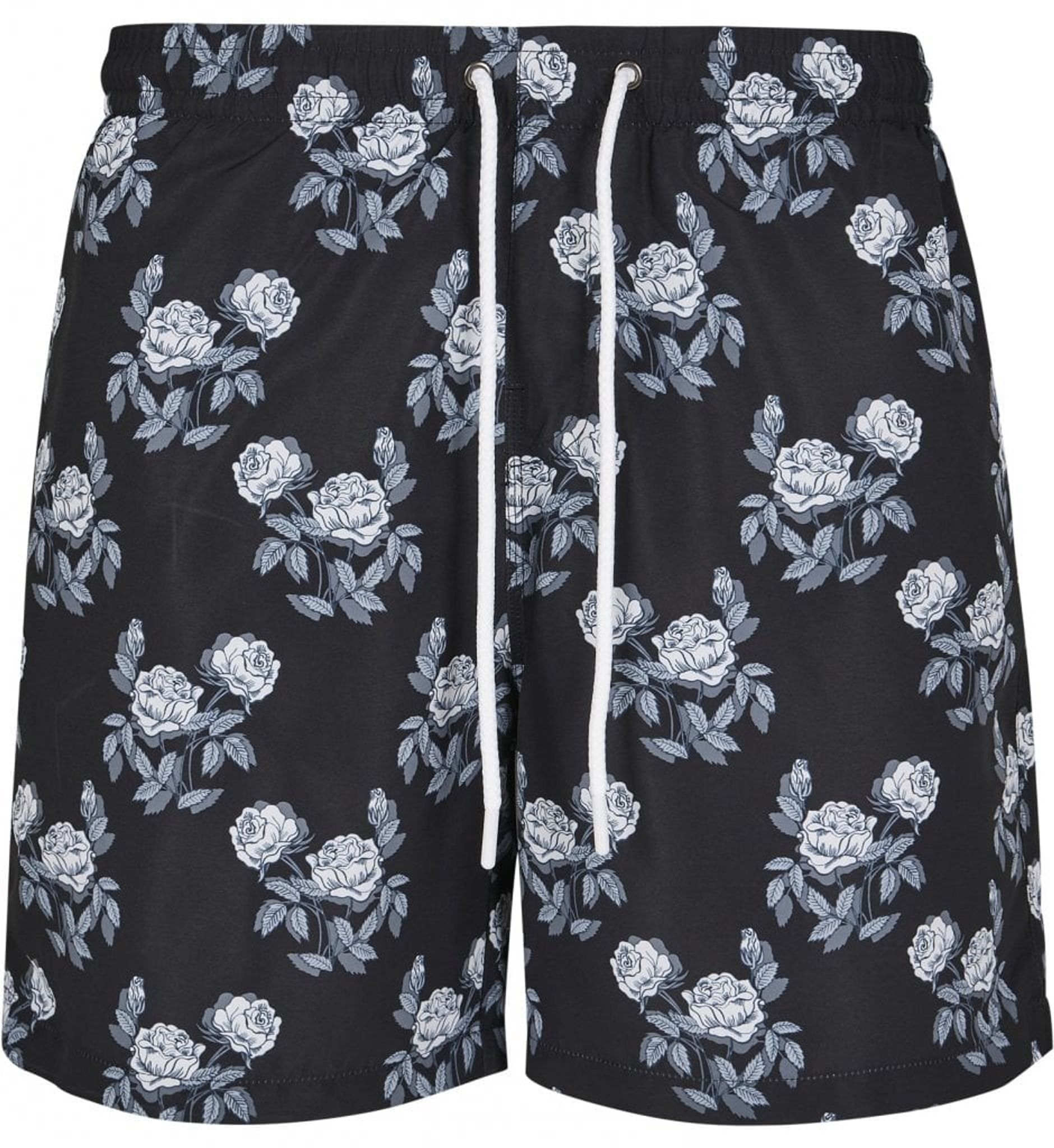 Svarta badbyxor fyllda med rosor i vita och grå nyanser.