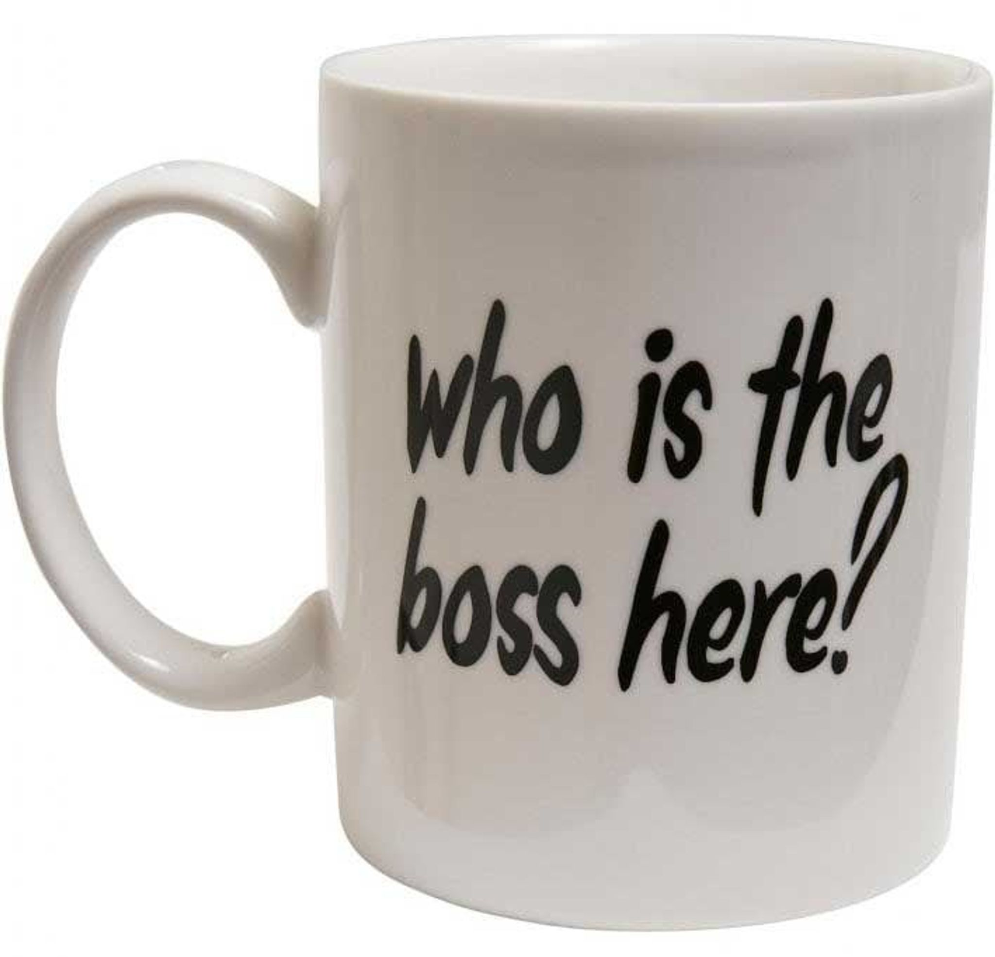 En vit kaffemugg med texten Who is the boss here? På undersidan av muggen så ser du vilken som inte är det.