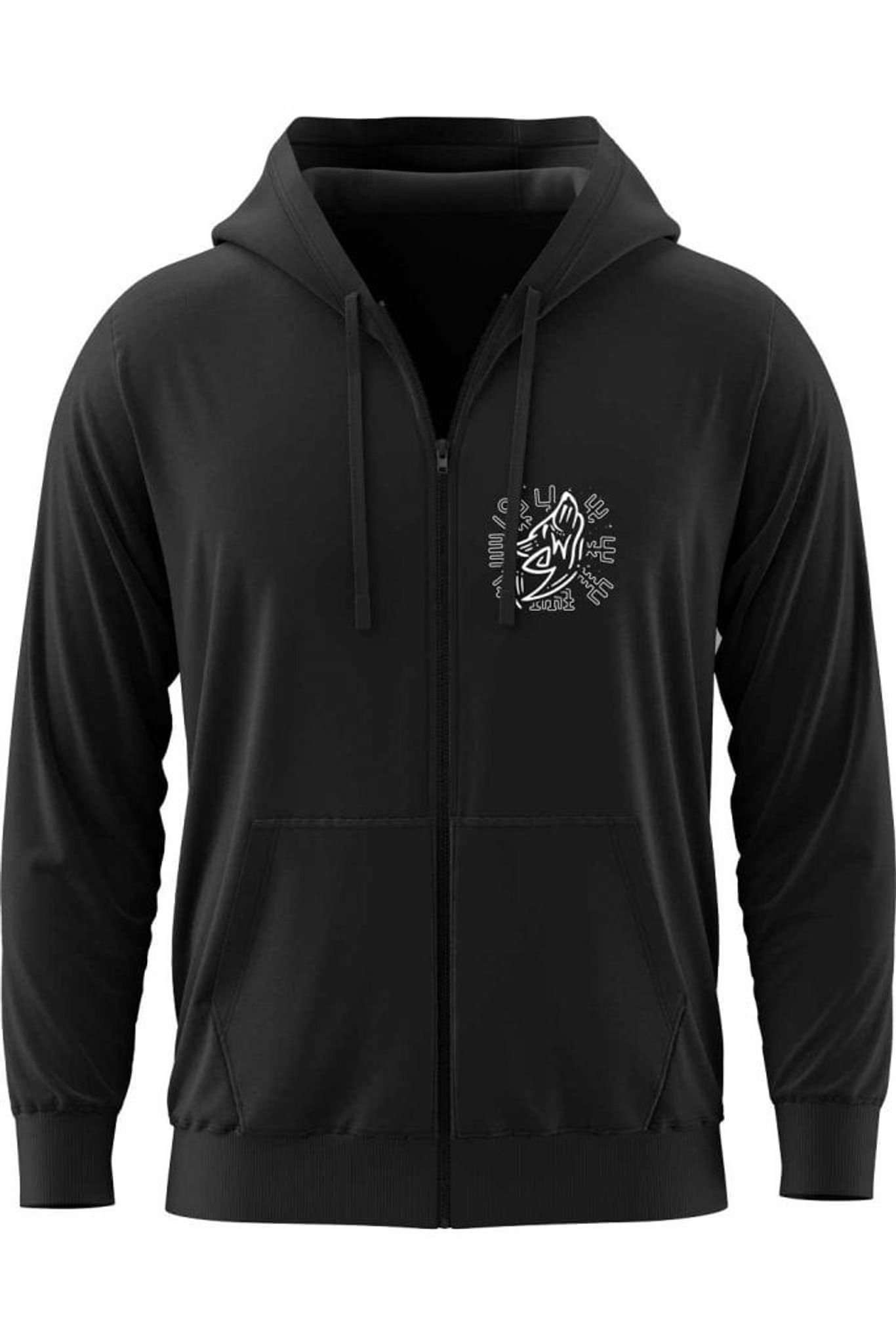 Wolf Vegvisir Zip Hoodie herr är en stilren och funktionell hoodie som kombinerar modern design med nordisk mytologi. På bröstet finns ett detaljerat tryck som föreställer en varg tillsammans med Vegvisir, den fornnordiska kompassen som sägs vägleda bäraren genom stormar och svåra vägar. Detta tryck ger hoodien en kraftfull symbolik, perfekt för den som vill bära med sig en bit av den nordiska kulturen i sin vardag.