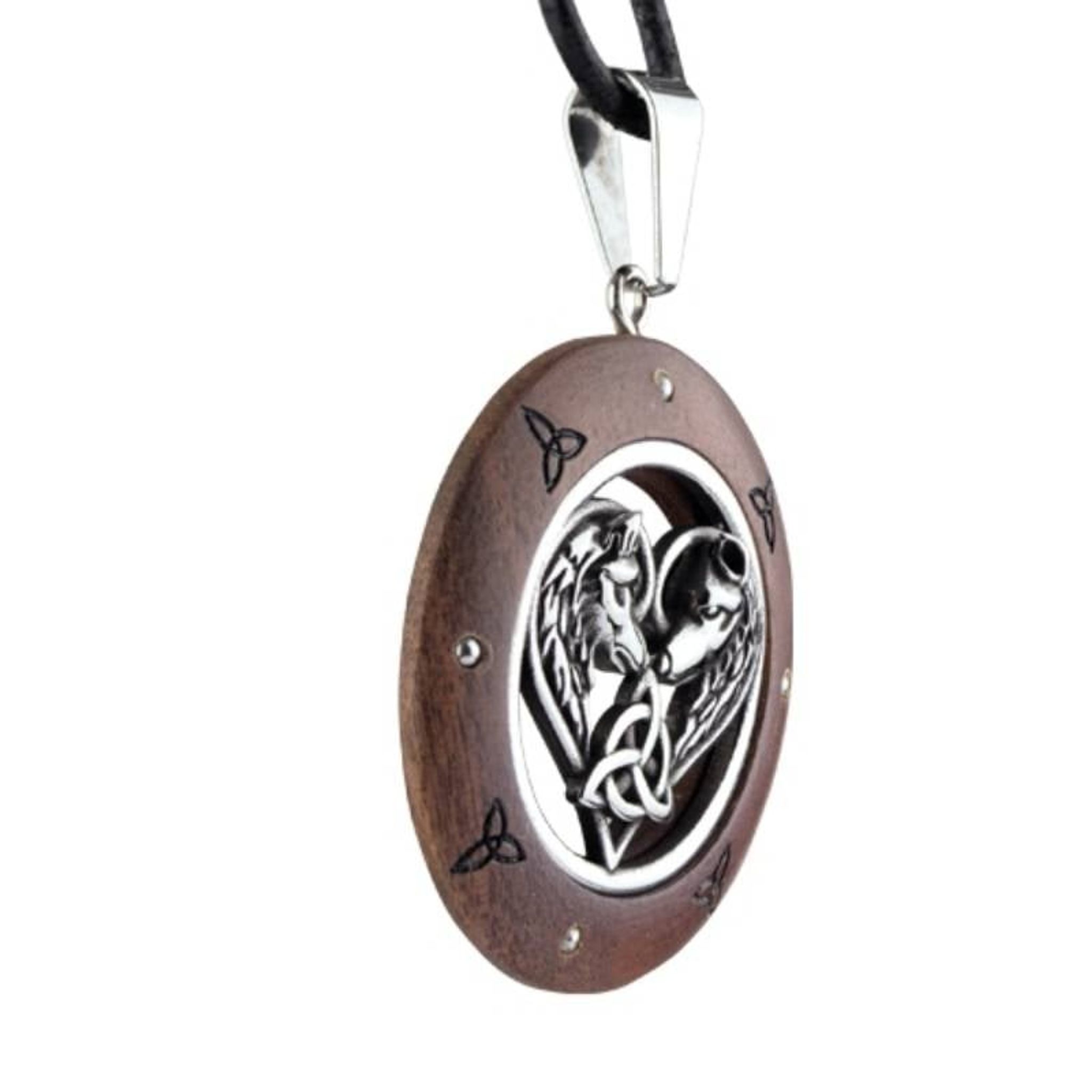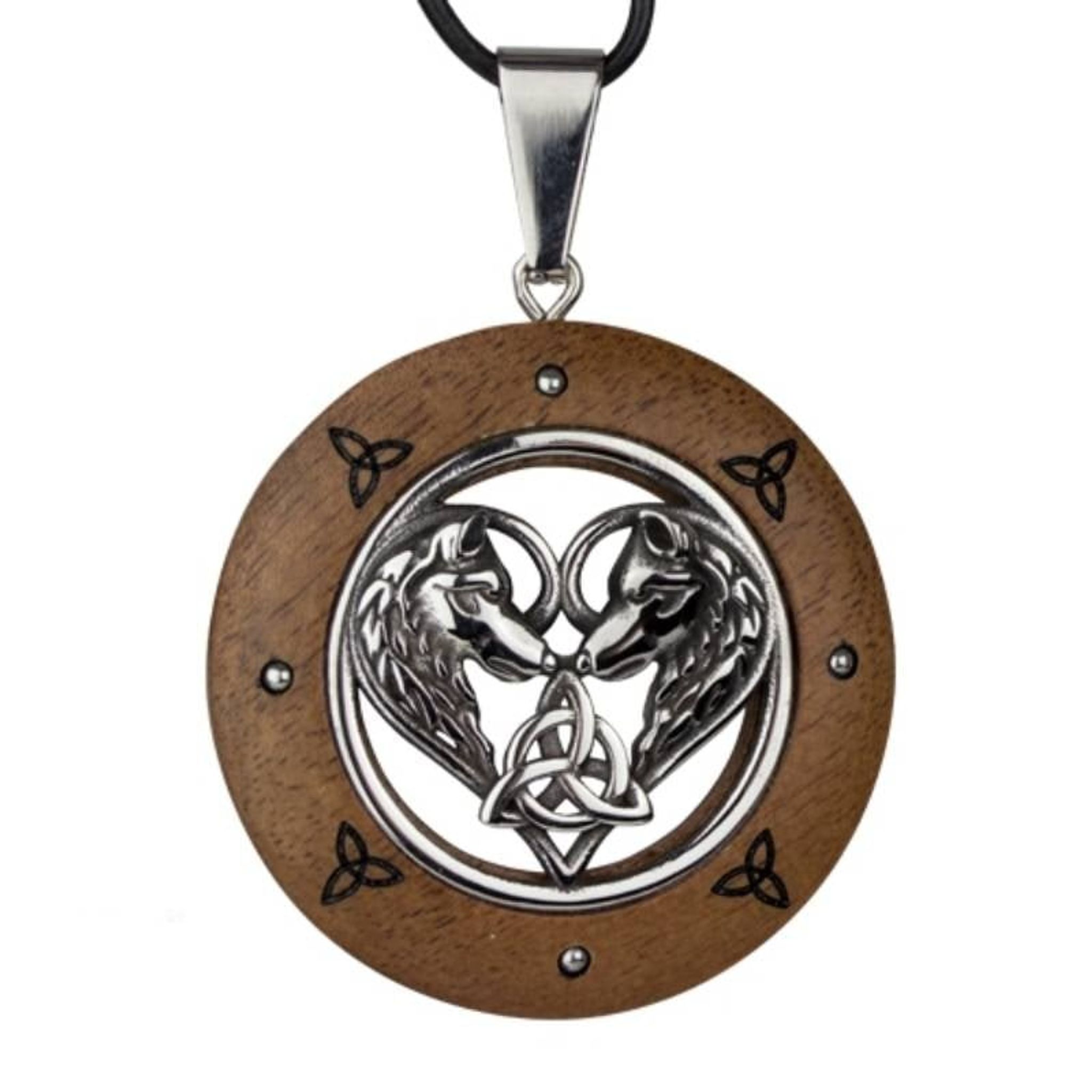 Två vargar i ett snyggt hängsmycke, inramat av en cirkel i valnötsträ.
