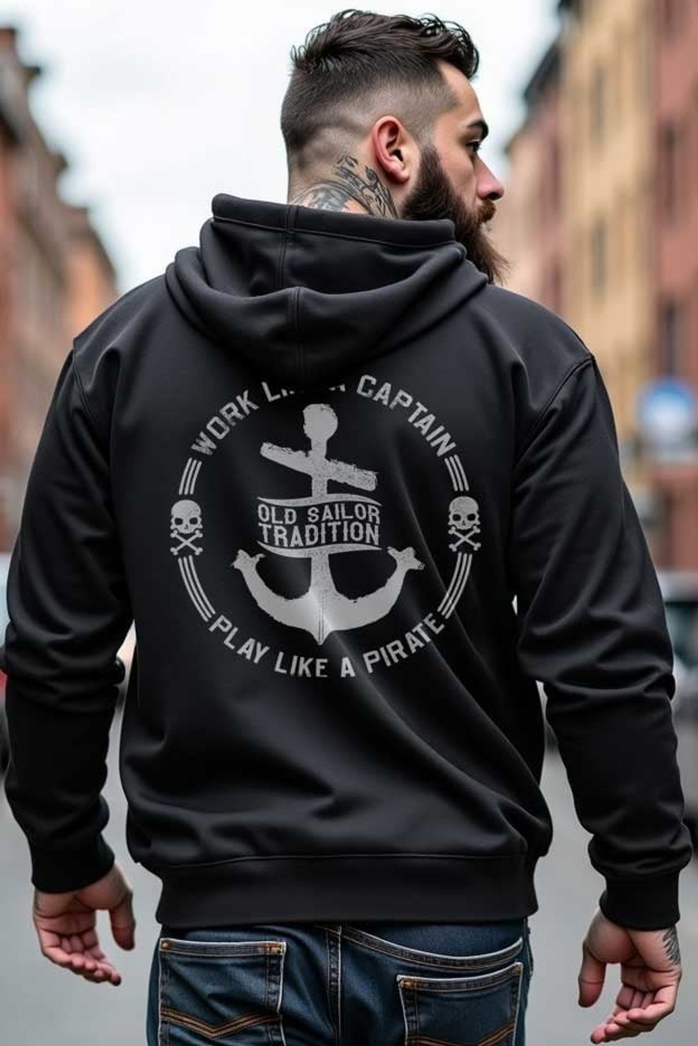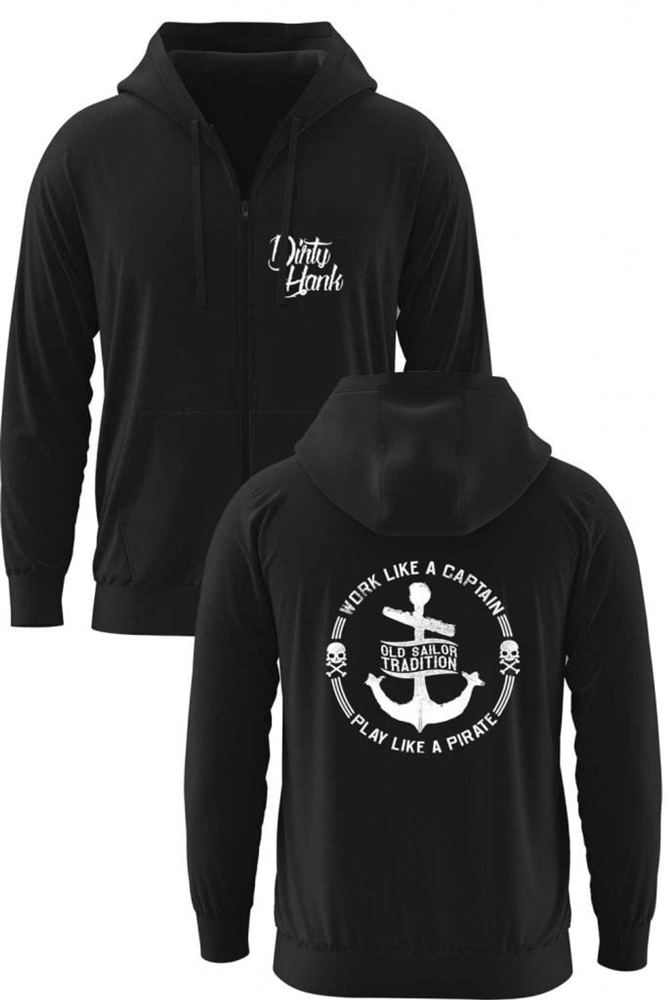 En hoodie från Dirty Hank som kombinerar robust design med ett inspirerande budskap. På ryggen pryds hoodien av ett stort och tydligt tryck som föreställer ett ankare, två dödskallar och texten "Work Like a Captain, Play Like a Pirate". Detta tryck förmedlar en känsla av ledarskap och äventyrslust, och ger hoodien en stark visuell identitet som direkt fångar uppmärksamheten.