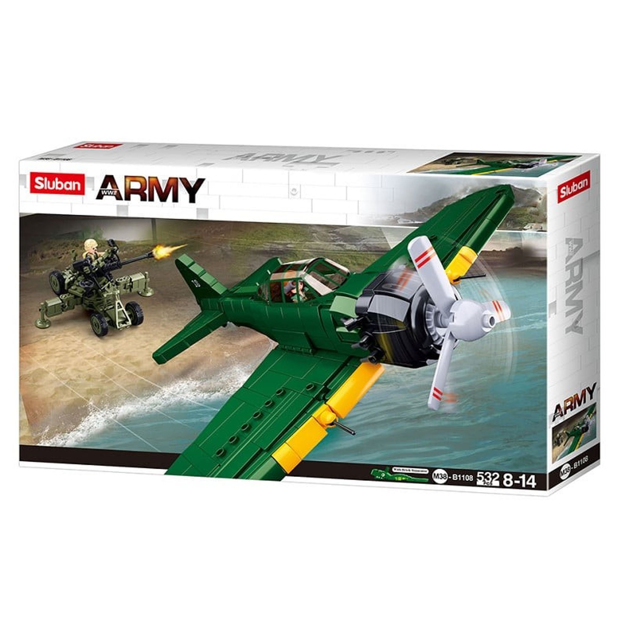 Denna byggsats från Sluban Army-serien erbjuder en detaljerad modell av ett militärt propellerflygplan samt en luftvärnskanon. Setet är särskilt utformat för byggare och entusiaster av militärhistoria som vill återskapa dynamiska stridsscener.